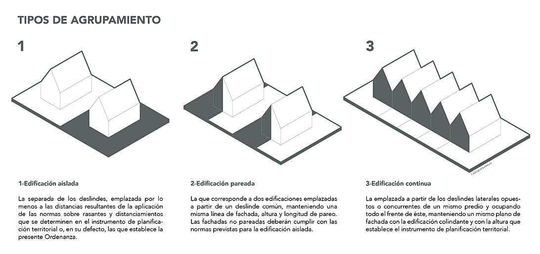 Existen tres tipos de agrupamientos, los cuales aplican para todas las edificaciones y está determinado por cada plan regulador comunal. Esta agrupamiento define las distintas alternativas en las que se puede emplazar o ubicar una edificación al interior de un terreno o predio.