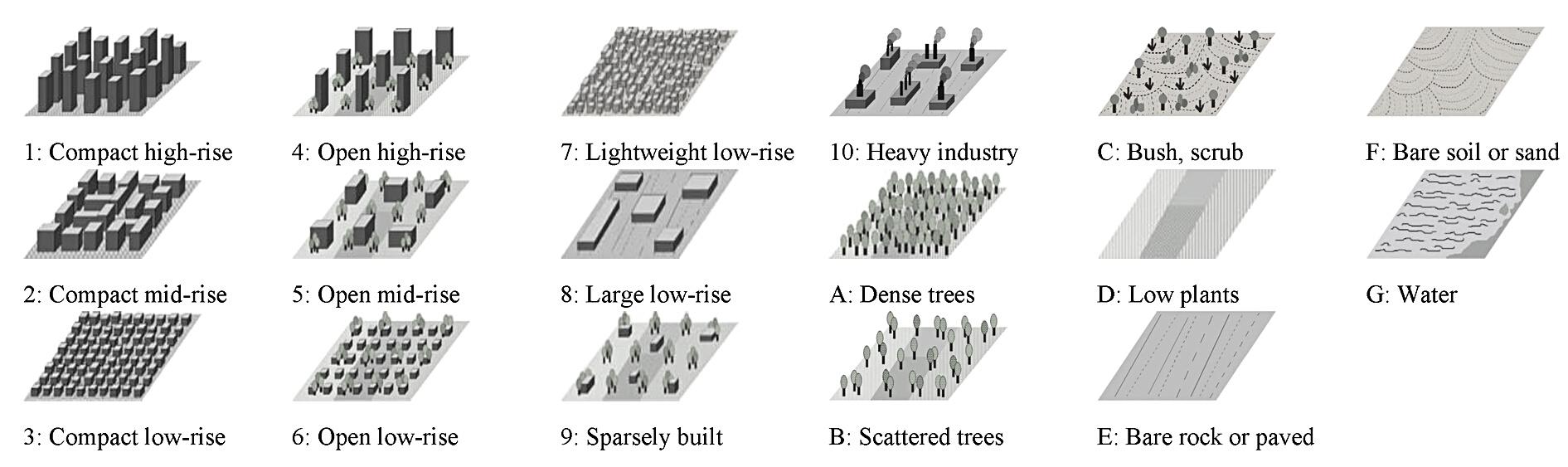 Mezcla densa de edificaciones de altura media (de 3 a 9 pisos). Pocos o casi nada de arboles. Paisaje mayormente pavimentado. Piedra, ladrillo, concreto y baldosa son sus principales materiales de construcción.
