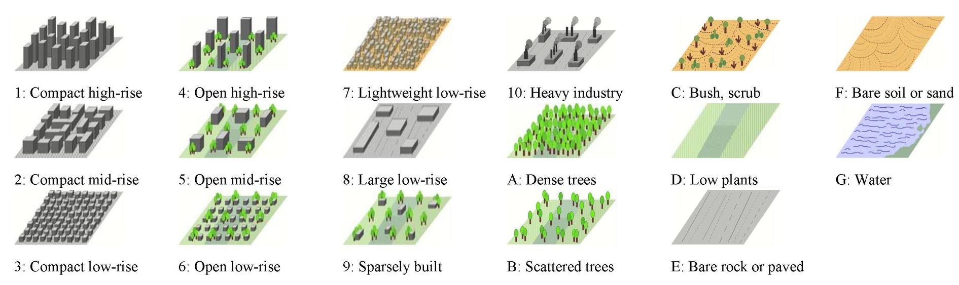 Arreglo abierto de edificaciones grandes pero de altura baja (de 1 a 3 pisos). Pocos o casi nada de arboles. Paisaje mayormente pavimentado. Acero, concreto, metal y piedra son sus principales materiales de construcción.
