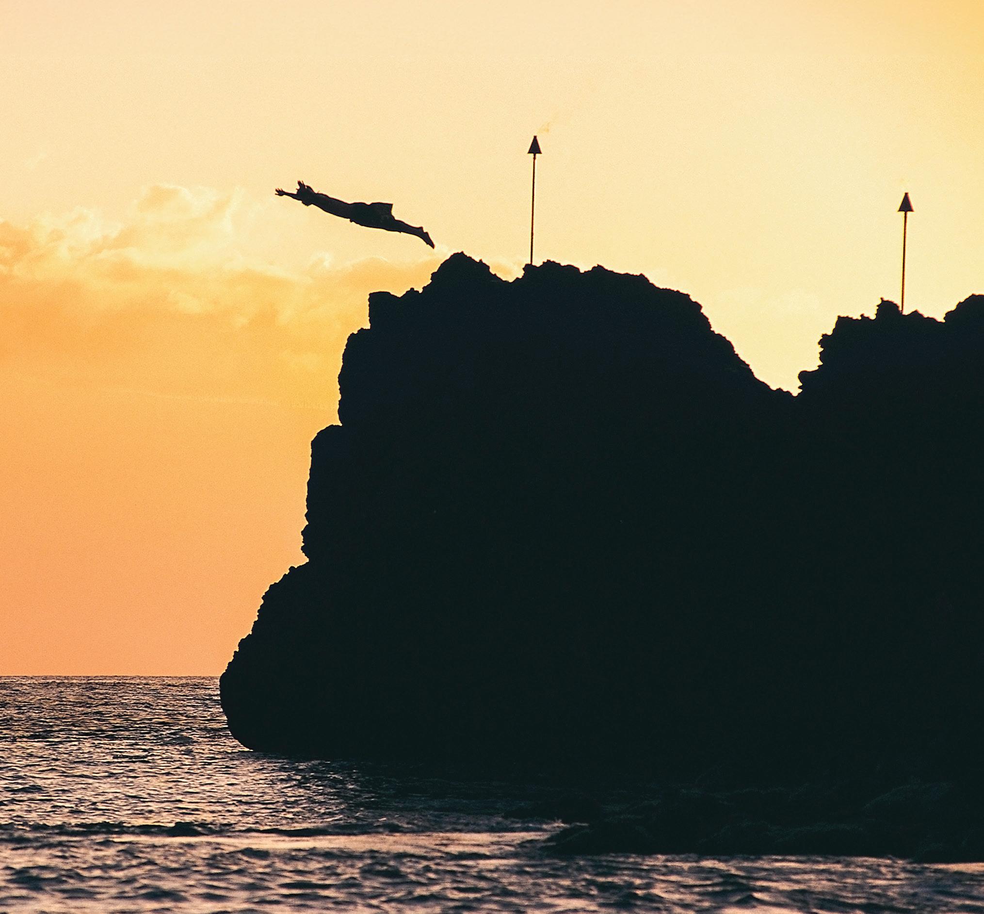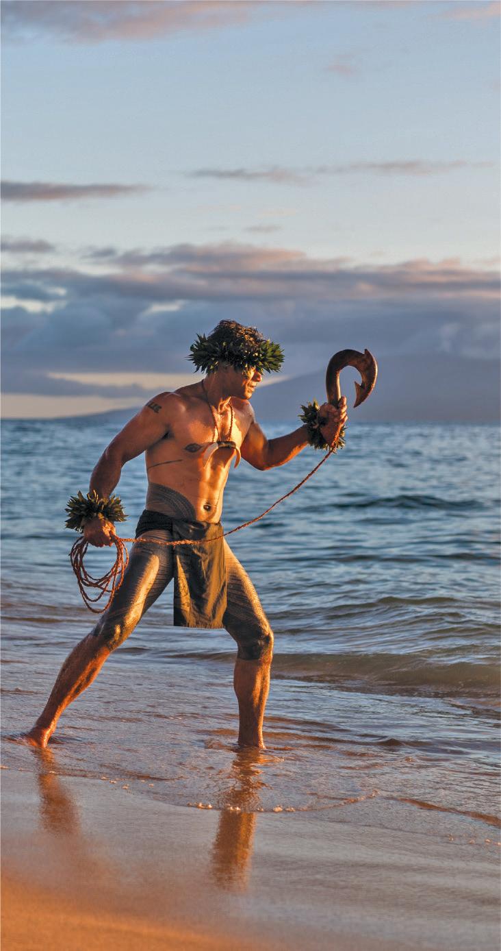 A cliff diver leaps from Pu‘u Keka‘a (Black Rock) during the Sheraton’s Maui Resort & Spa’s nightly cliff diving ceremony. Page 16