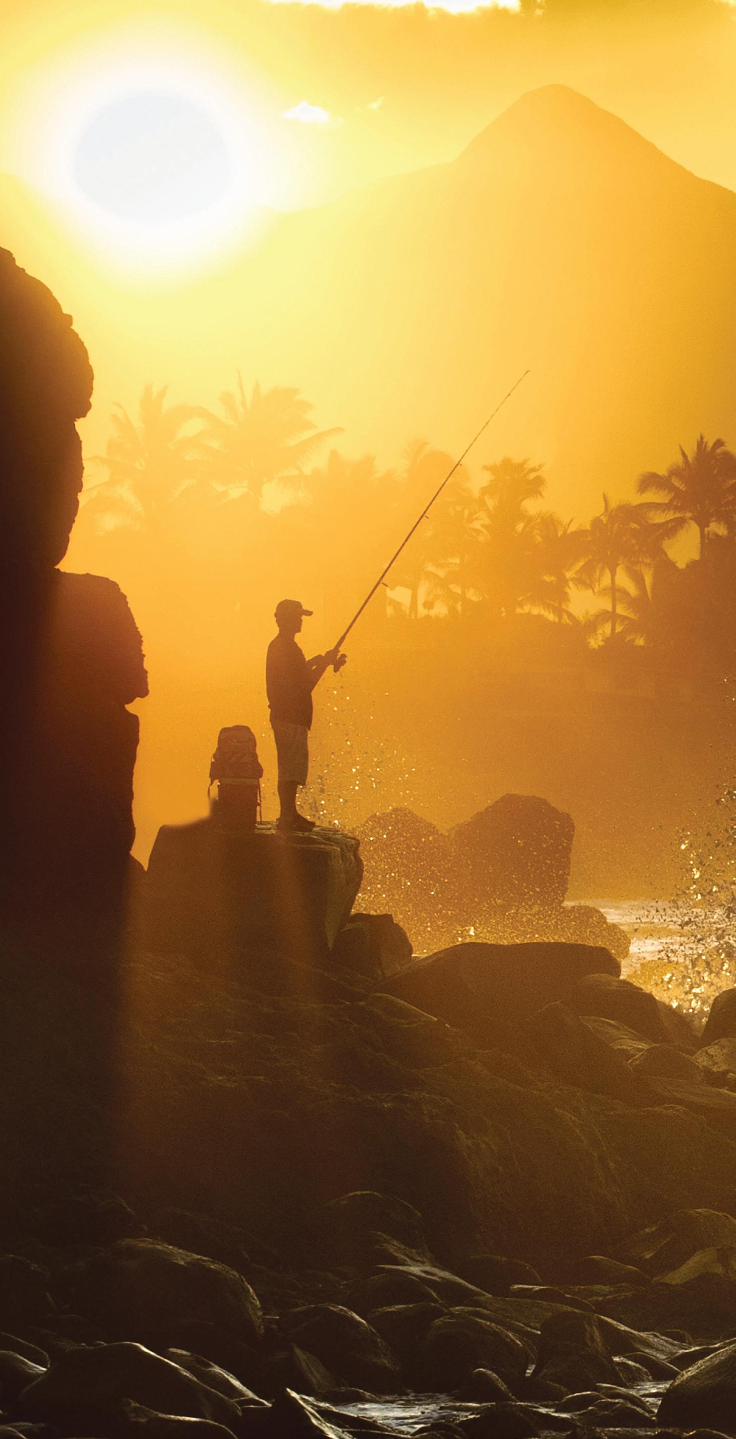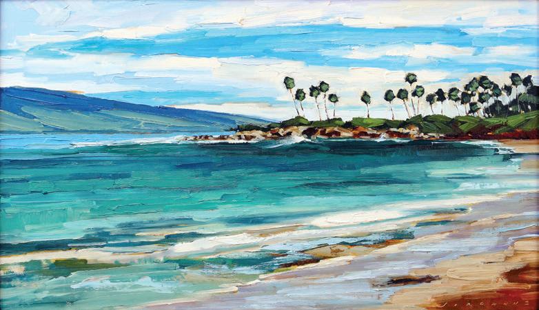 A lone fisherman patiently awaits his catch from his perch on the rocky coastline. Behind him, a blazing sunset drowns Maui’s north shore in golden light. The silhouetted palm grove at Mama’s Fish House creates a tropical dream scene, while the West Maui Mountains cast mighty shadows over Kahului.
