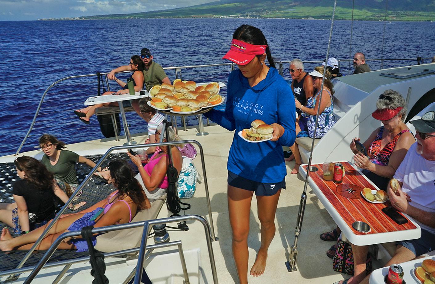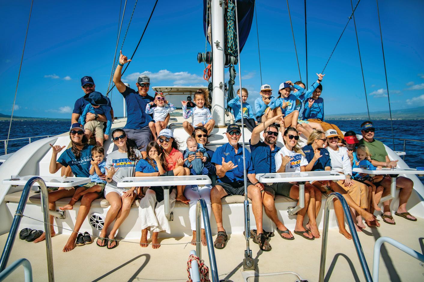 A crew member serves guests freshgrilled burgers for lunch during a charter off West Maui. A happy group of guests and crew members show off their shakas. An early Trilogy charter off Lāna‘i in 1973.