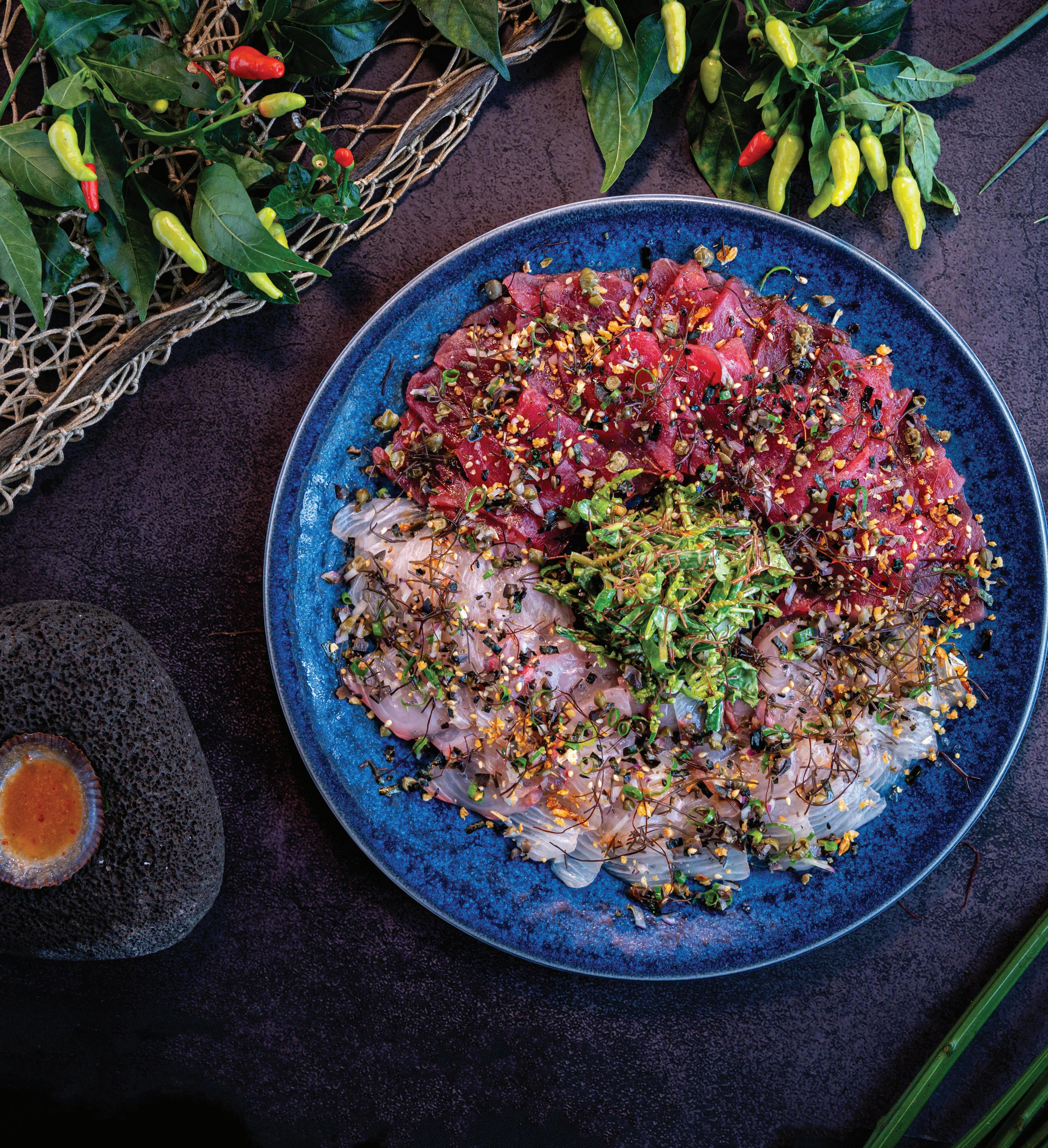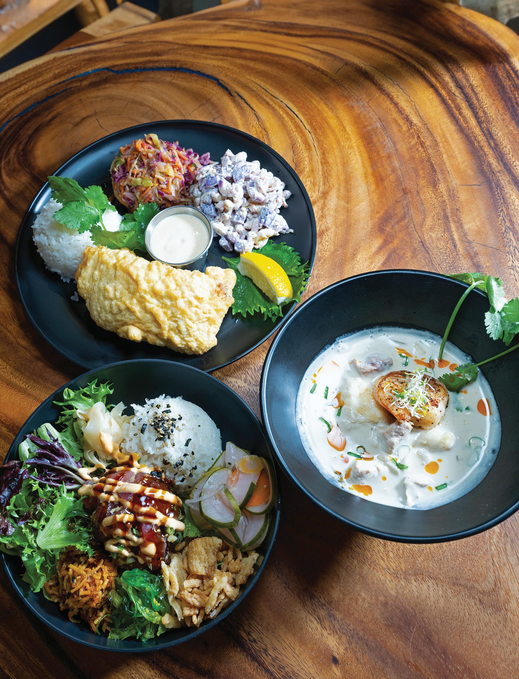 wonder breaches in a thunderous splash. Pass another bun, please. But wait. Besides the doughy delights glazed with a creamy topping that seeps down and permeates every bite, Trilogy’s flagship Discover Lāna‘i Tour entices with tropical fruits, pineapple juice and hot chocolate and complements it with oven-baked croissant breakfast sandwiches on the 6:30 a.m. departure out of Lāhainā and assorted deli wraps on the 10 a.m. cruise to Lāna‘i.