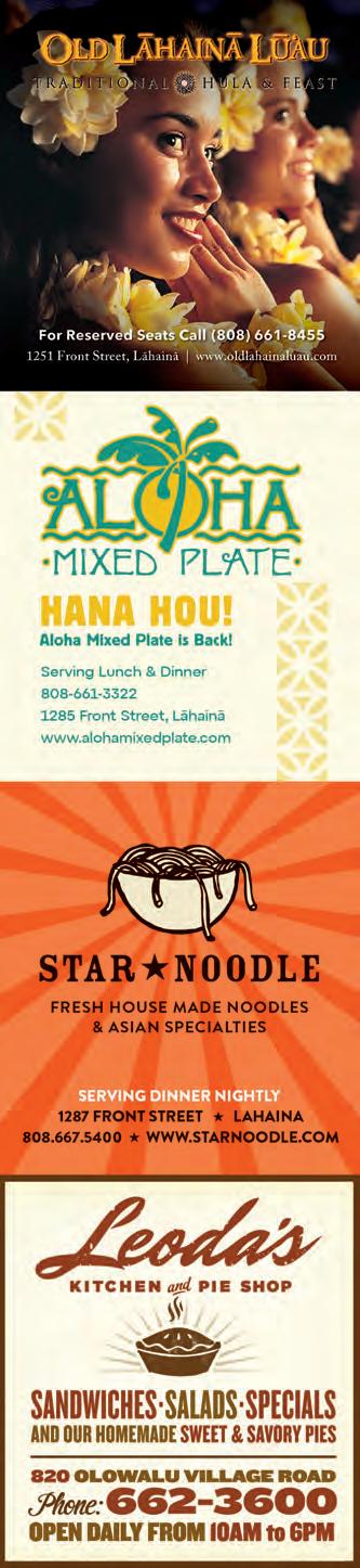 MAMA’S FISH HOUSE 799 Poho Pl., Kū‘au, 579-8488 Famous for its beautiful beachside setting and Polynesian-inspired cuisine, Mama’s evokes old-time island hospitality. Try specialty entrees like Antartic toothfish caught at 6,000 feet under frozen glaciers. Hawaiian/Seafood. L, D, R, $$-$$$$