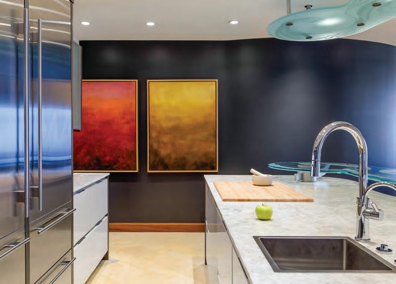 Back inside, we move through the kitchen, a crisp, modern space with large, stainless-steel appliances. A kidney-shaped glass countertop juts out from the island to allow for barstool seating; its twin in lightfixture form hangs above, illuminating the island through swirled glass.