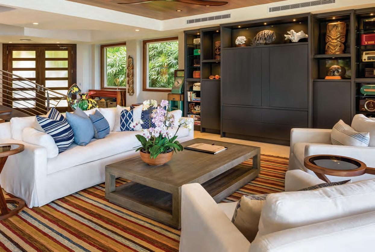 A seating area with a sofa and midcentury modern chairs by RH offers unparalleled ocean views. Local Ha‘ikū artists Dennis and Lucretia Holtzer carved the chaise lounge from a mango tree trunk. Sturdy plexi-resin cubes by Timothy Oulton house a jumble of eternally frozen black sticks — perfect to withstand roughhousing kids (as well as unruly grown-ups).