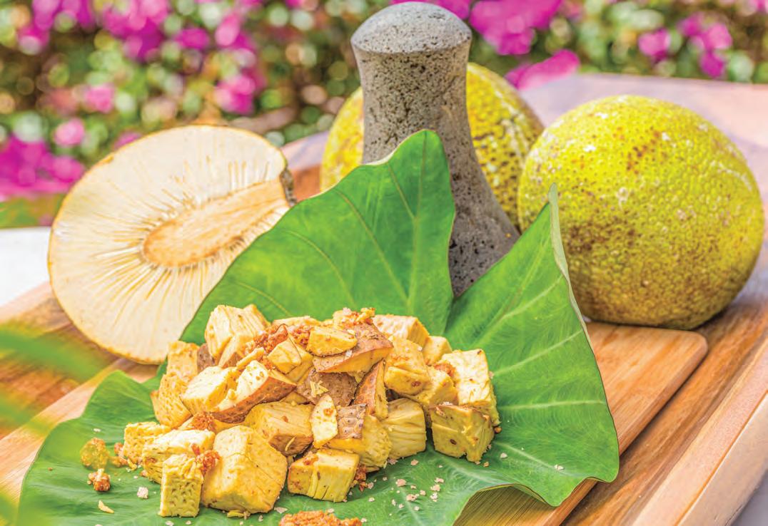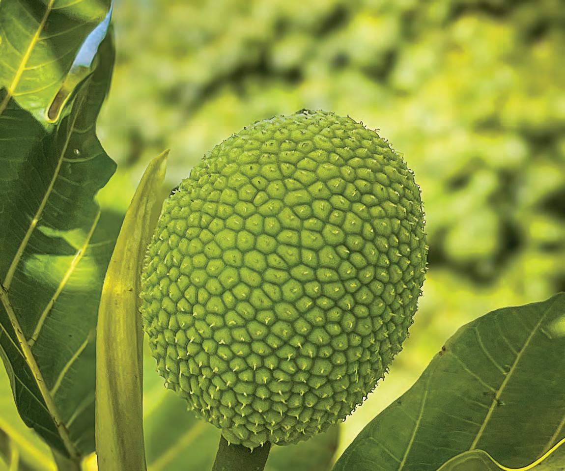 ACROSS MAUI’S FERTILE lowlands, where the salty ocean air blows and the sun warms the land in rich golden light, ʻulu (breadfruit) trees rise tall with broad canopies of large leaves that spread outward like open hands. Among the branches hang heavy, bright green globes – their skin is patterned with bumps and firm to the touch, while the flesh inside is smooth, promising nourishment, abundance and resilience.