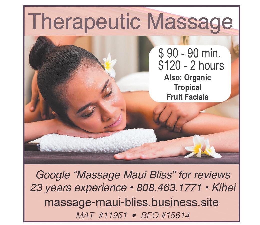 SPINAL ENERGETICS • ENERGY HEALING ~ Release deep tension and emotional blockages, activate your energy, and experience soullevel shifts. Discover Lisa’s signature blend of Spinal Energetics and restorative sound frequencies for divine alignment. Located in Kihei and mobile service available island-wide. Lisa Reyes 310-210-4214 www.mauihealingvibes.com