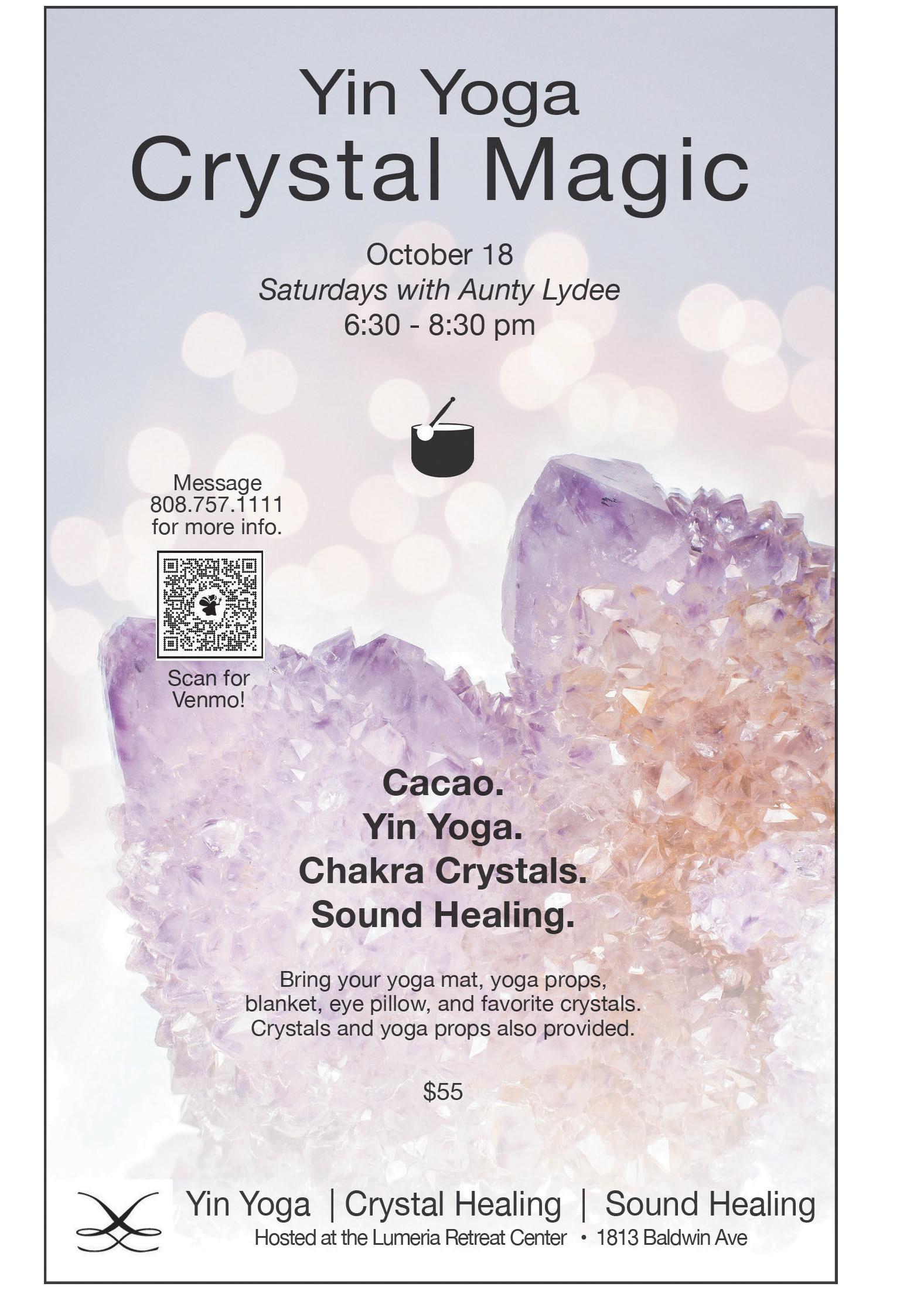 JUDY’S ANGELIC CRYSTAL JOURNEYS and Chakra Balancing Sessions. Come enjoy a unique relaxing, uplifting 90 minute session to empower you with your unique crystal layout to balance your chakras; plus lymphatic massage with GuaSha, reflexology, a divine foot massage, full body Reiki to integrate it all and two readings. 90 minute sessions in Haiku, by donation. Call Judy Levy @808.269.7762