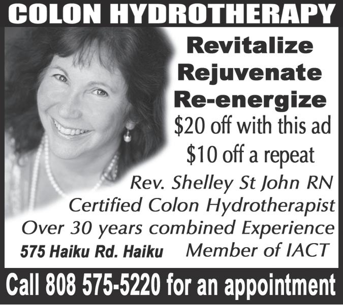 WAILUKU COMMUNITY ACUPUNCTURE $15-$35 slid ing scale, because acupuncture doesn’t have to be expen sive to be effective. Dr. Kepi McMenemy, L.Ac., DAOM. 33 Central Ave., Wailuku. www.wailukucommunityacupunc ture.com for current hours, and online booking. Walk-in’s welcome. 808-868-6052 (3/18).