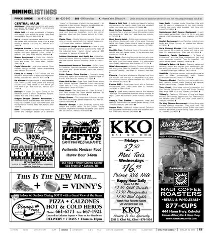 Maui Mix Plate - Traditional foods of the varied ethnic groups who call Hawaii home. 70 Ka’ahumanu Ave, Kahului, 877-0706. $ Maui Tacos - Featuring tacos and burritos with chargrilled steak, chicken and seafood marinated in pineapple, lime juices and island spices. 275 Kaahumanu Ave, Queen Kaahumanu Mall, Kahului, 871-7726. $ Mike’s Restaurant - Authentic Chinese cooking and ono local grinds. Open for breakfast, lunch and dinner. Also offer catering. 1900 Main St., Wailuku, 244-7888. $ Piñata’s - Fresh and wholesome Mexican food from the kitchen sink burritos to quesadillas a la carte. Casual dining, various piñatas available too. 395 Dairy Rd., Kahului, 877–8707. $ Pulehu BBQ - Local plate lunch with a Southern smokehouse twist. 1500 Lower Main St., Wailuku, 244-4049 or 244-6159. $ Ruby’s - Walk down memory lane at this fabulous ‘50s cafe. Quintessential American dining morning to night. Queen Ka`ahumanu Center, Kahului, 248-7829. $ Saeng’s Thai Cuisine - Vegetarian, meat and seafood Thai entrees in a casual garden setting. 2119 Vineyard, Wailuku, 244-1567. $$ Saigon Cafe - Wailuku’s hidden secret! Delicious and affordable Vietnamese cuisine with excellent service. 1792 Main, Wailuku, 243-9560. $$