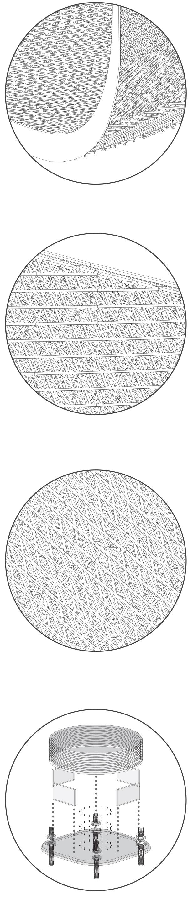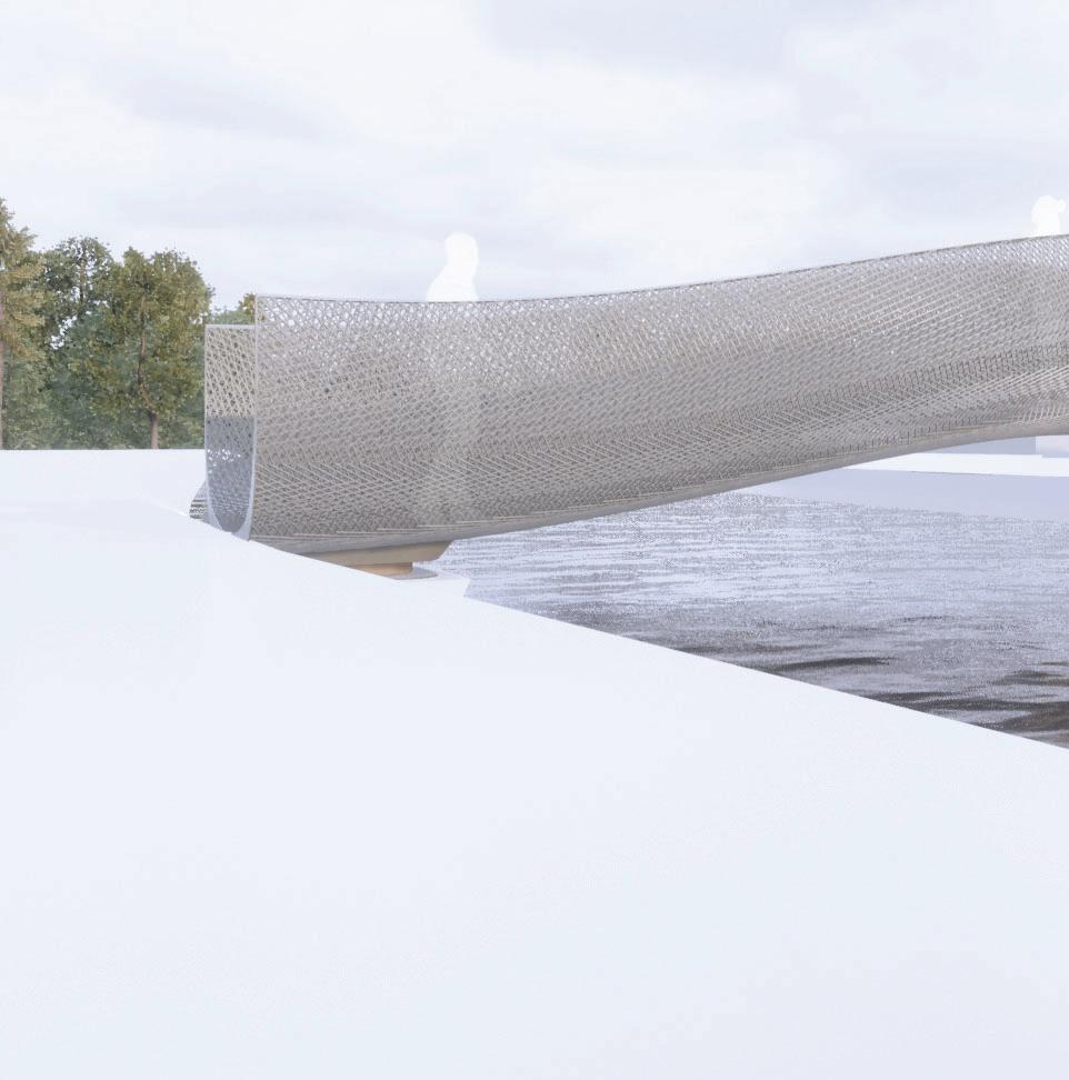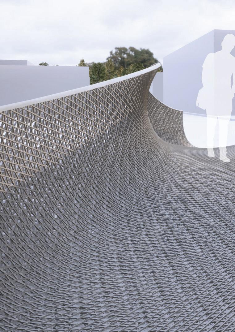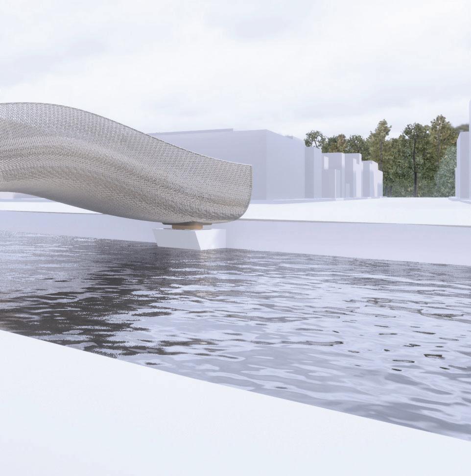 Bouligand Structure geometry abstracted to be applied on a lightweight bridge system. Fibre composites of various densities, orientations, and layer formations are tested digitally for structural behavior.