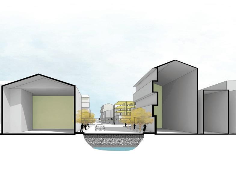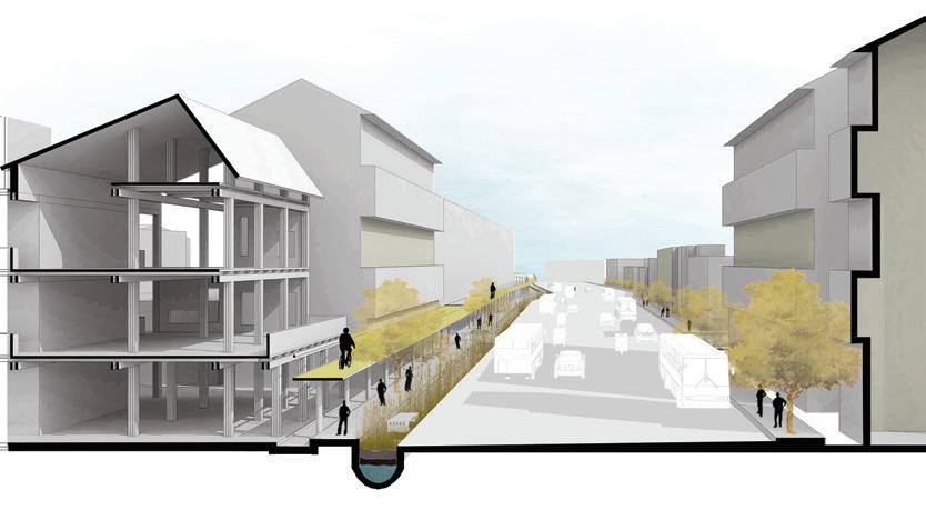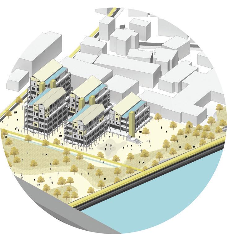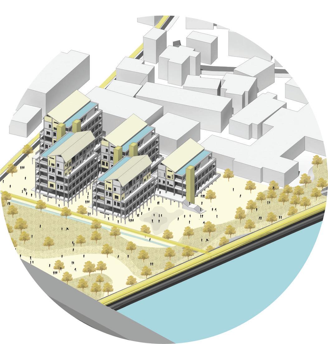 To make the center more livable, we propose multi-story housing that frees up the ground, makes it permeable and elevates commercial and housing to protect it from damage. The housing will consist of column beam structure, slabs, and cores consisting of services and