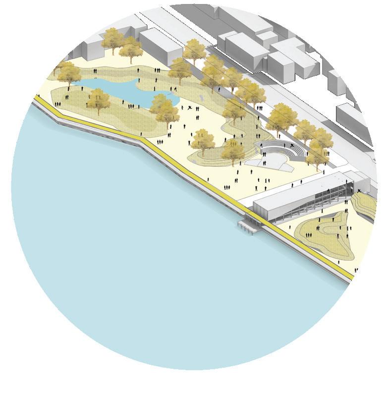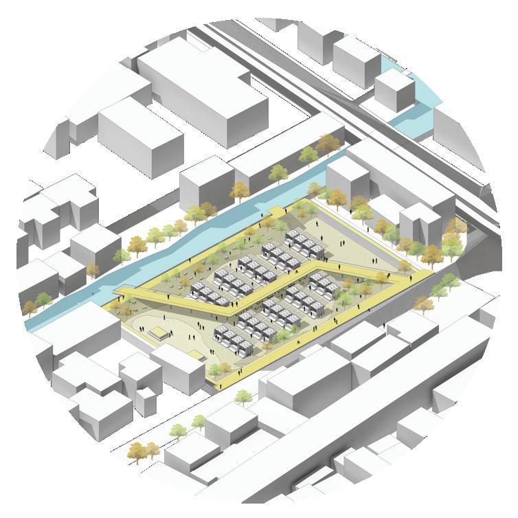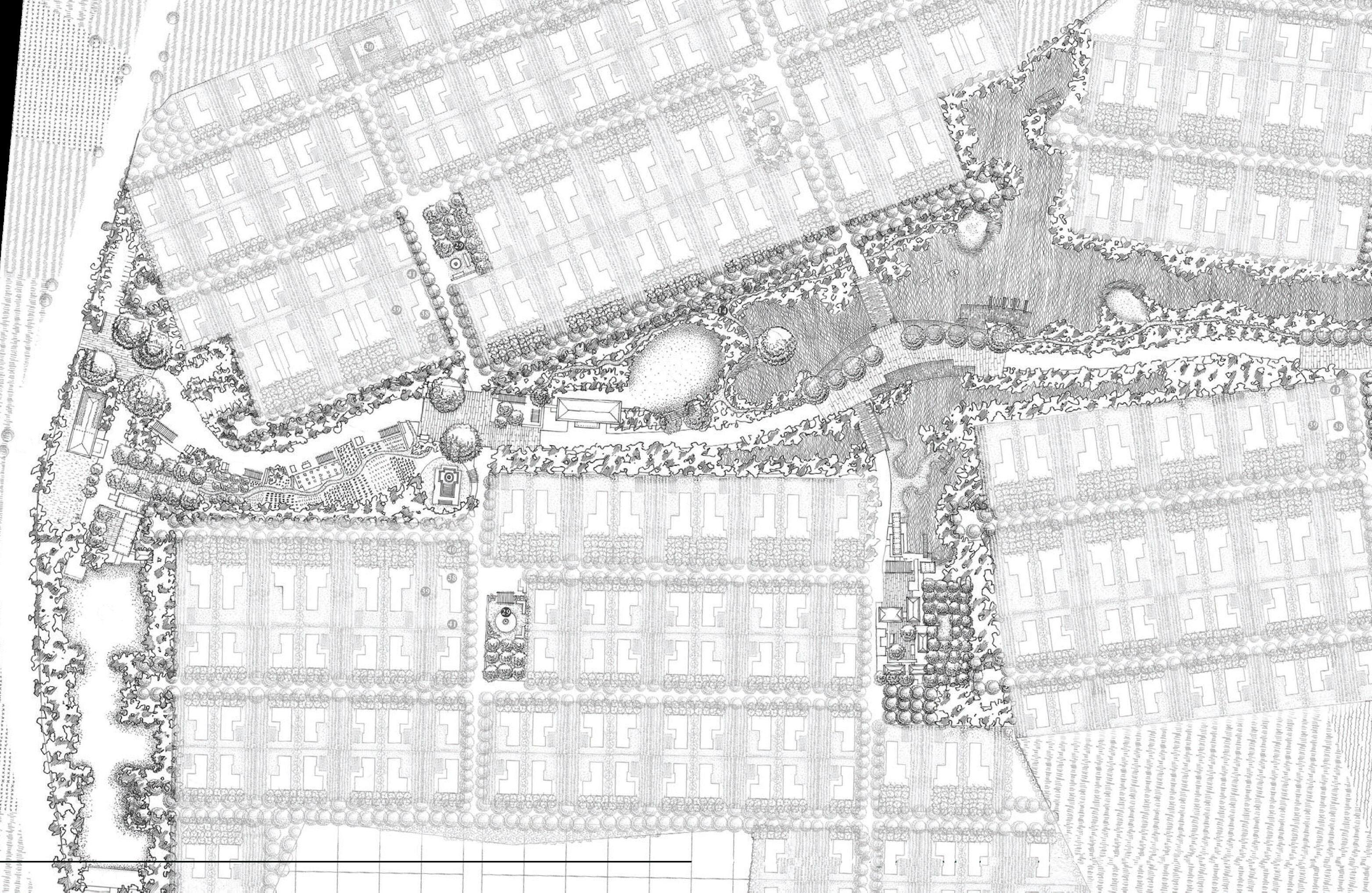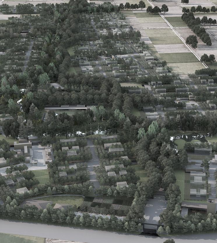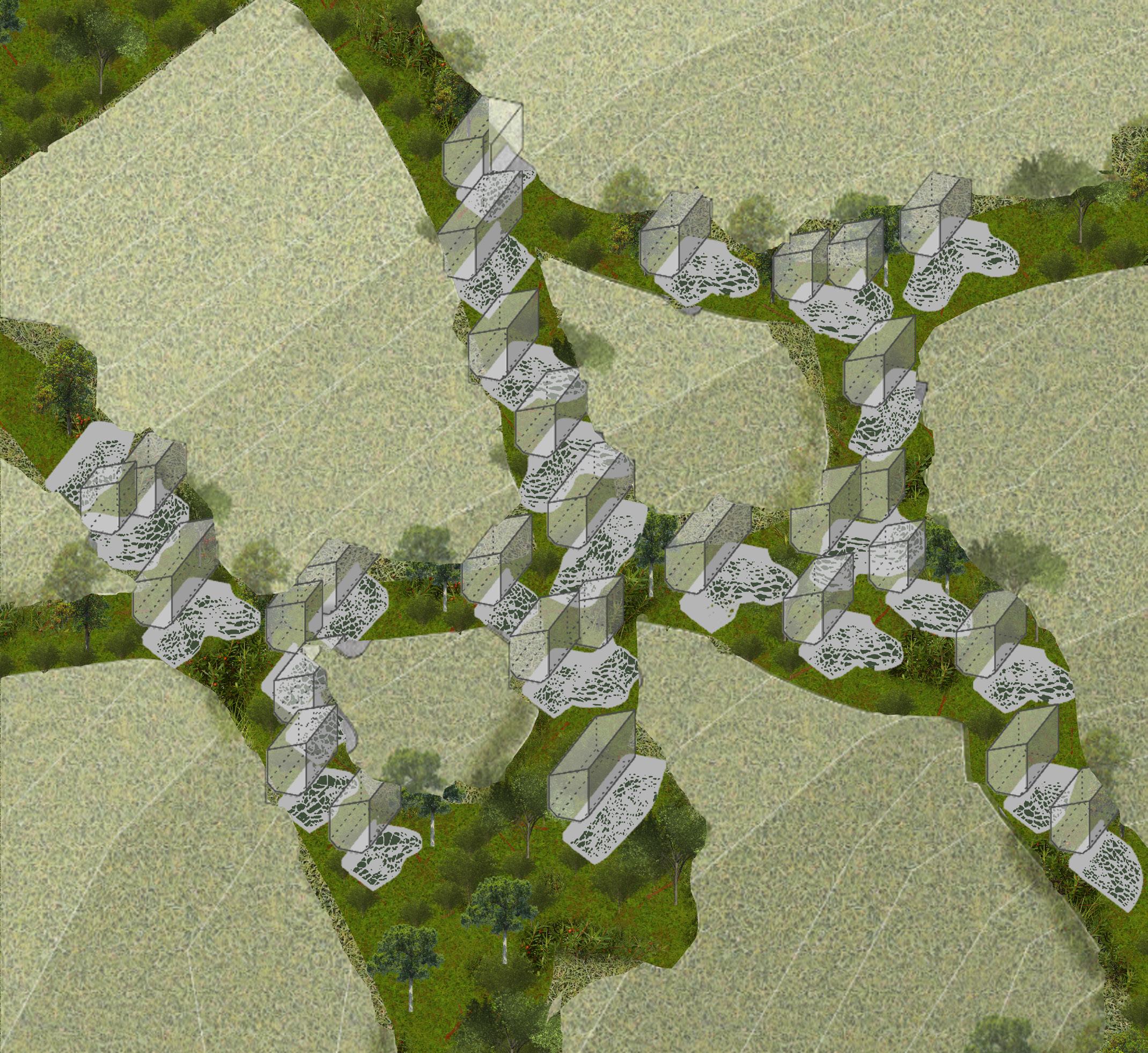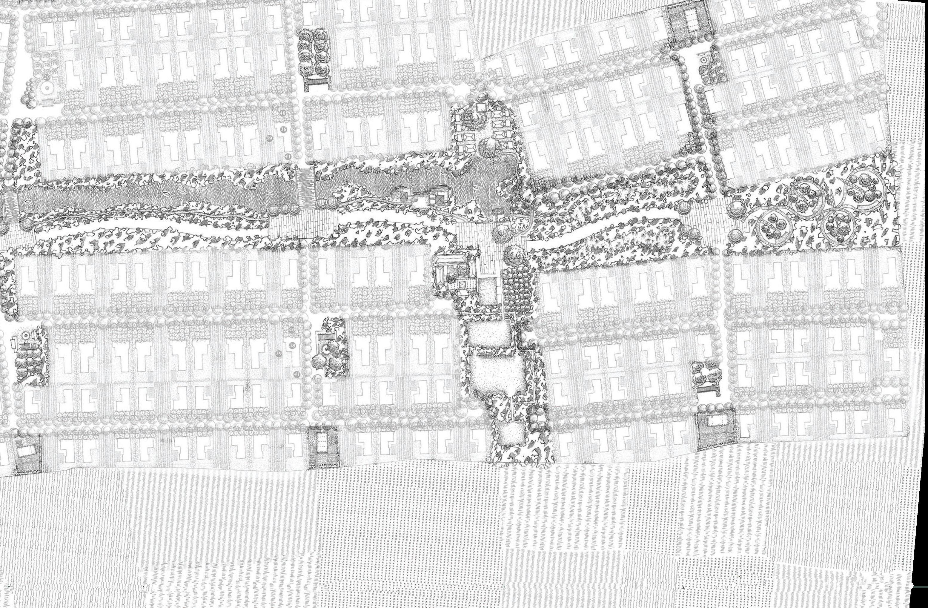 Forest Trails explores a suburban model where each home is paired with collectively managed cropland and orchards, creating a direct relationship between living spaces and productive land. The masterplan brings together everyday activities around a central wooded area to build a simple, community-oriented environment. My role included contributing to the masterplan concept, developing programmes, water and landform development, and preparing a detailed design for the entrance zone.