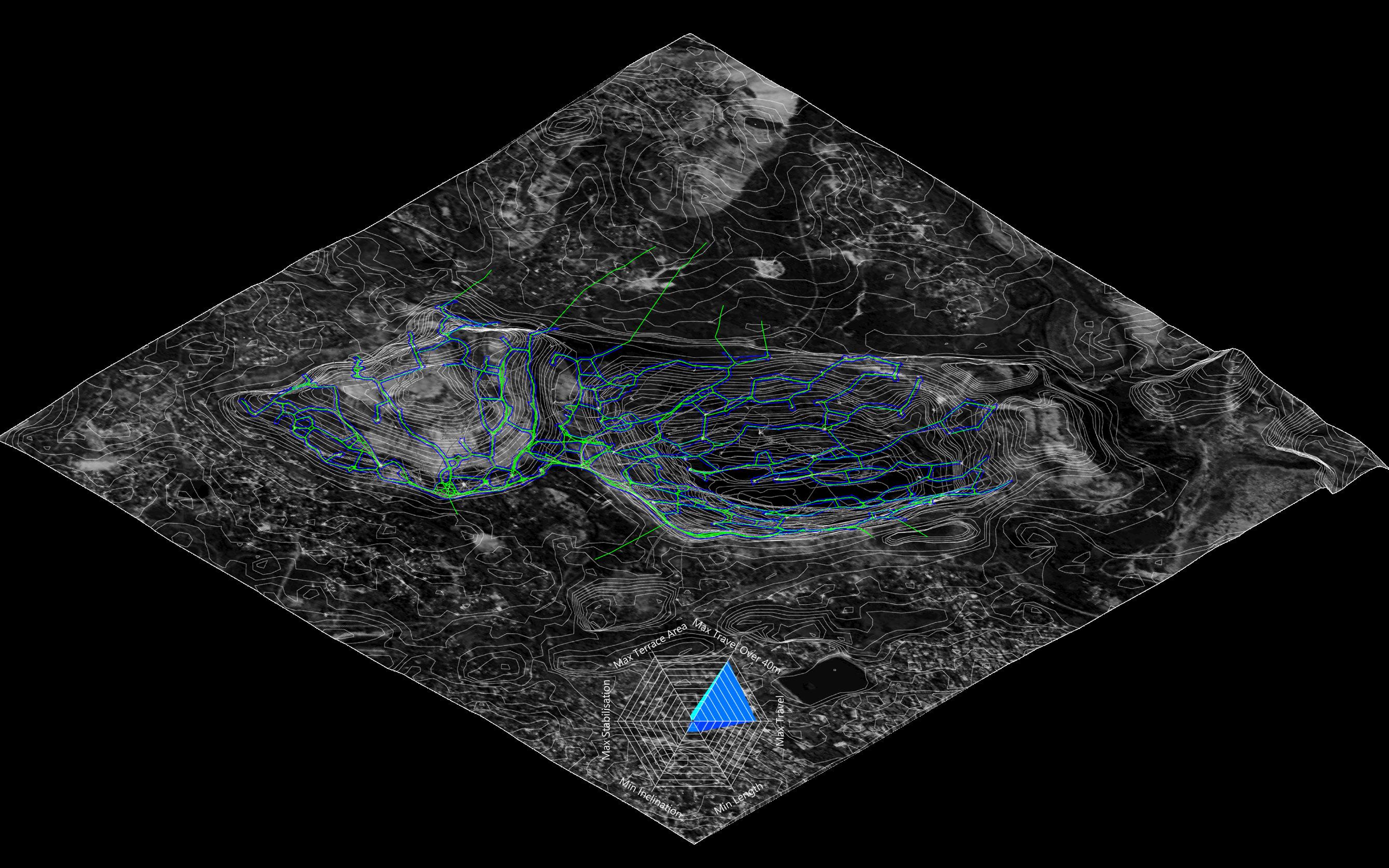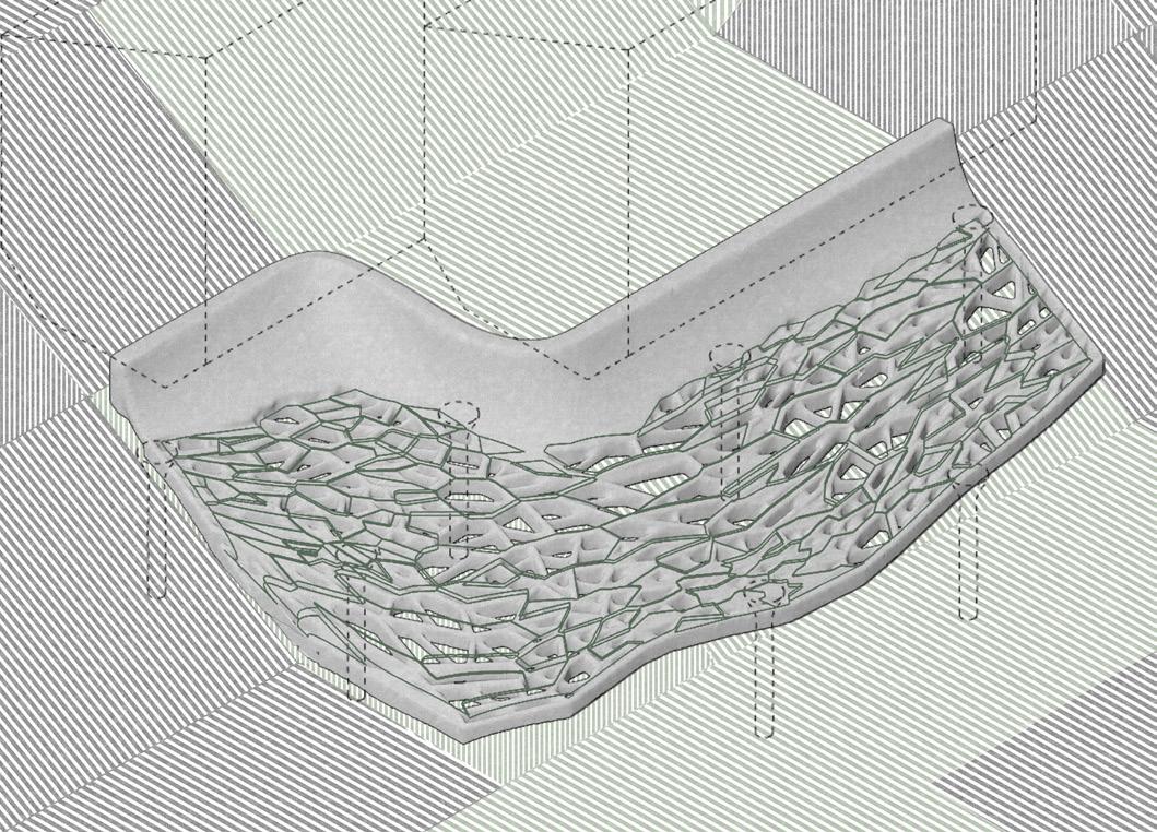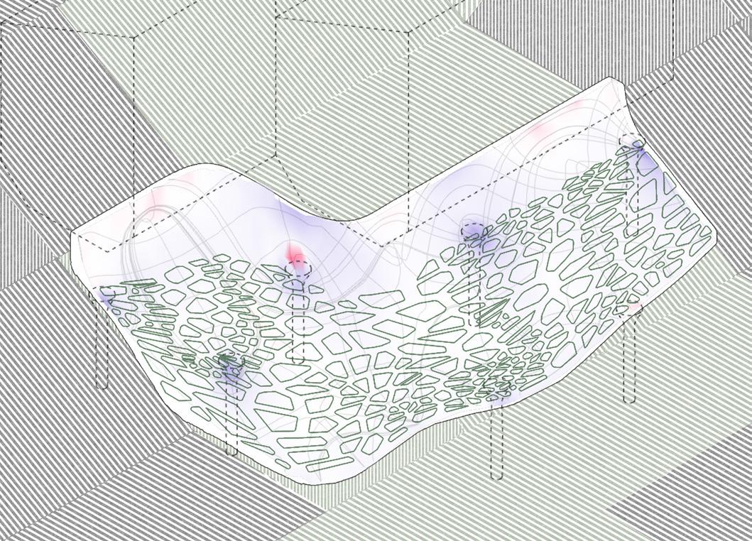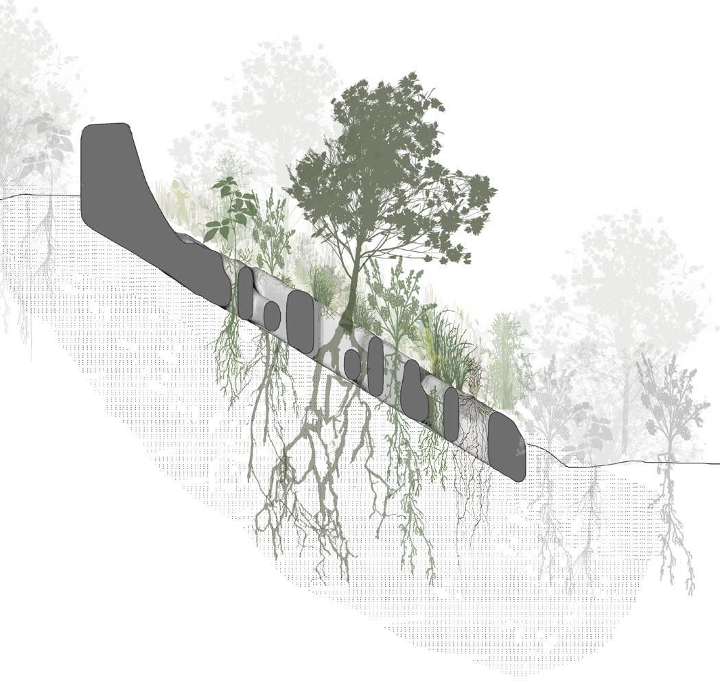 The project reimagines Jharia’s abandoned coal mines, marked by a century of environmental degradation, terrain instability, and chronic contamination, as a landscape that can be read through computation and data-driven design, and guided towards ecological repair. Agentbased modelling and risk analytics reveal how subsidence, hydrology, and contamination move across the terrain, allowing stabilisation networks to grow from land’s behaviour. Multi-objective optimisation and groundstructure interaction modelling refine this understanding into stabilisation corridors and ecological planting guilds Robotic 3D printing with bio-receptive composites derived from mining waste creates porous surfaces that anchor soil and initiate phytoremediation, enabling extraction scars to shift toward adaptive, inhabitable futures.