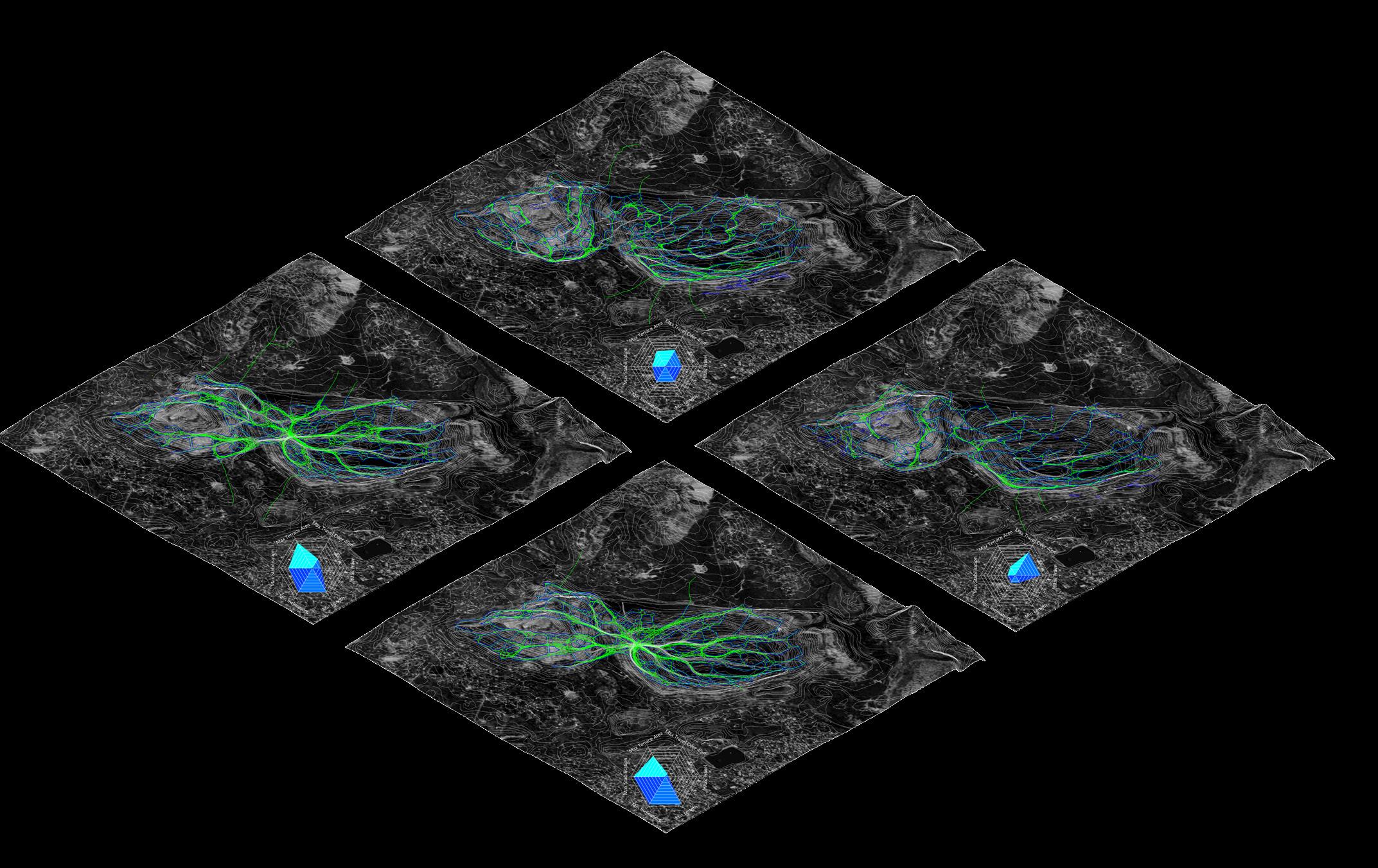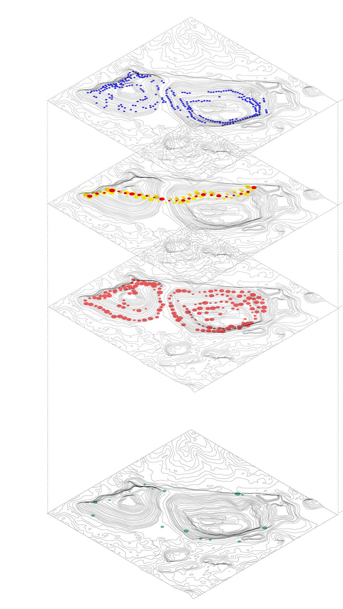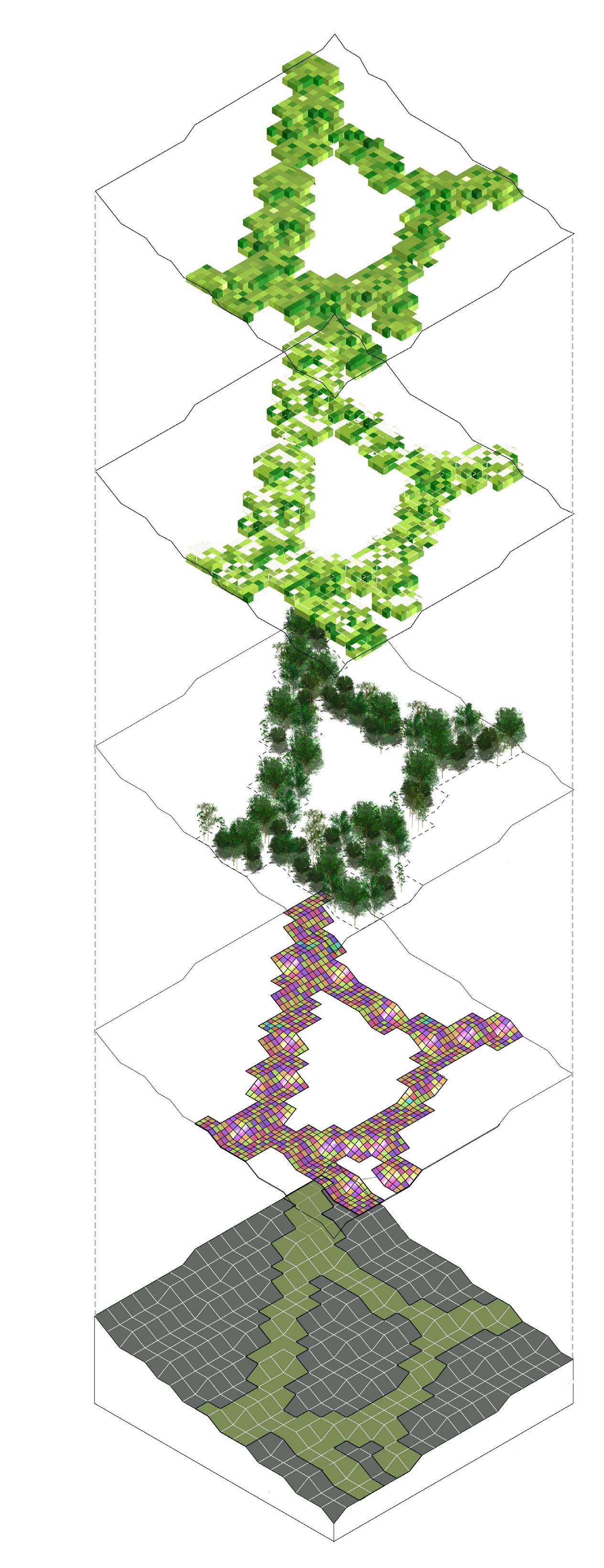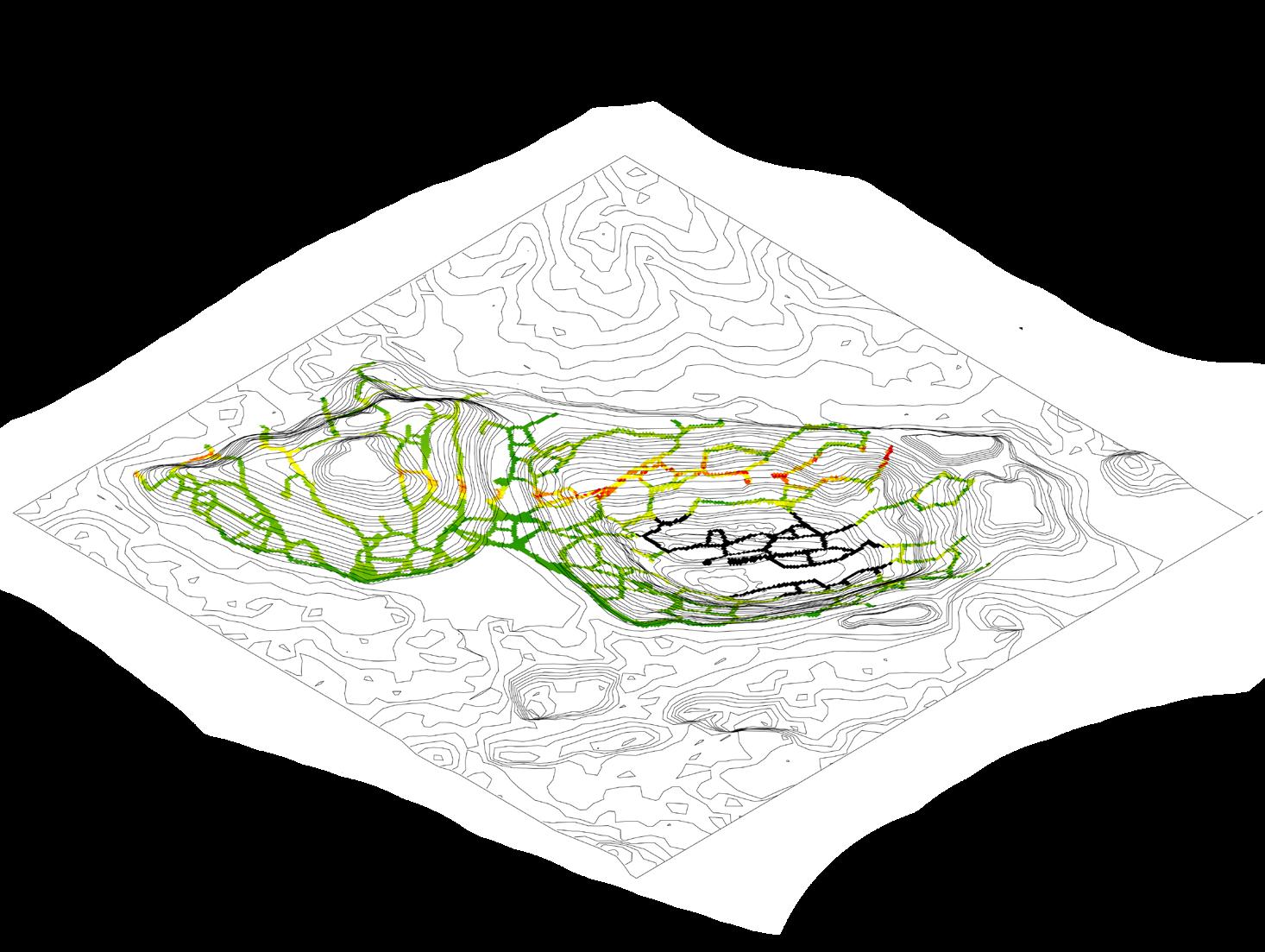 The project reimagines Jharia’s abandoned coal mines, marked by a century of environmental degradation, terrain instability, and chronic contamination, as a landscape that can be read through computation and data-driven design, and guided towards ecological repair. Agentbased modelling and risk analytics reveal how subsidence, hydrology, and contamination move across the terrain, allowing stabilisation networks to grow from land’s behaviour. Multi-objective optimisation and groundstructure interaction modelling refine this understanding into stabilisation corridors and ecological planting guilds Robotic 3D printing with bio-receptive composites derived from mining waste creates porous surfaces that anchor soil and initiate phytoremediation, enabling extraction scars to shift toward adaptive, inhabitable futures.