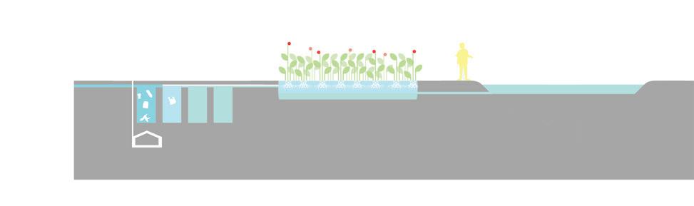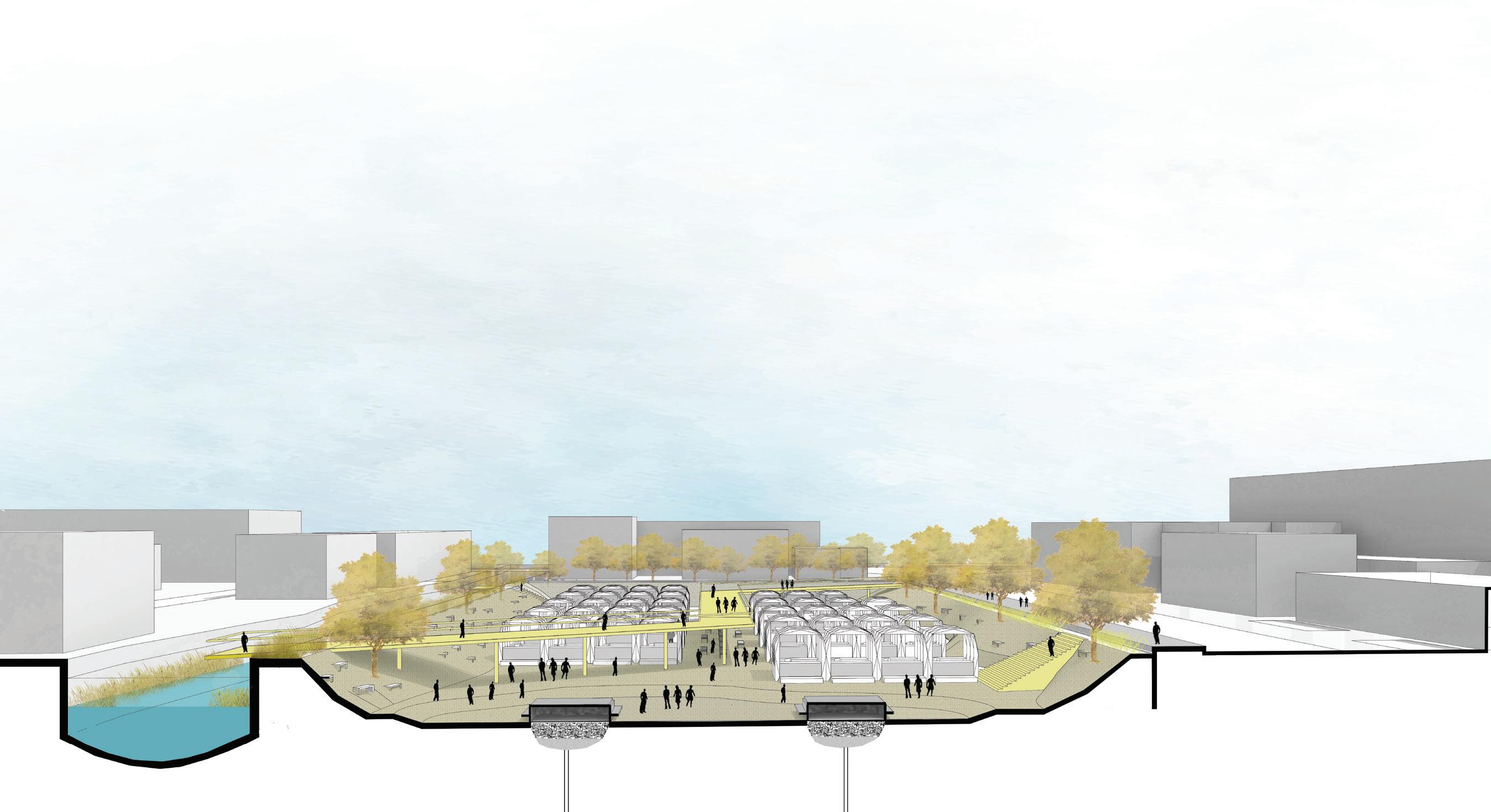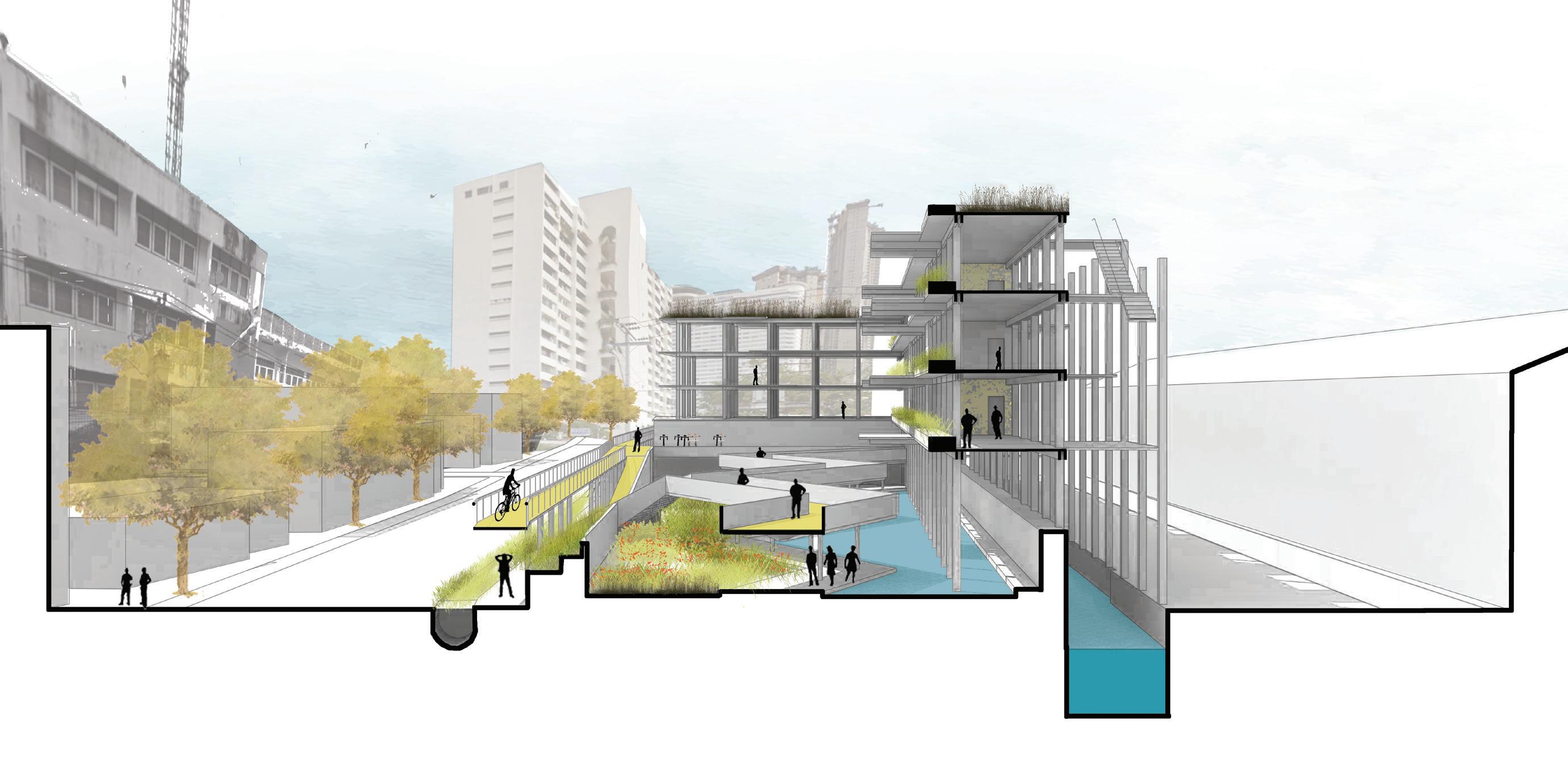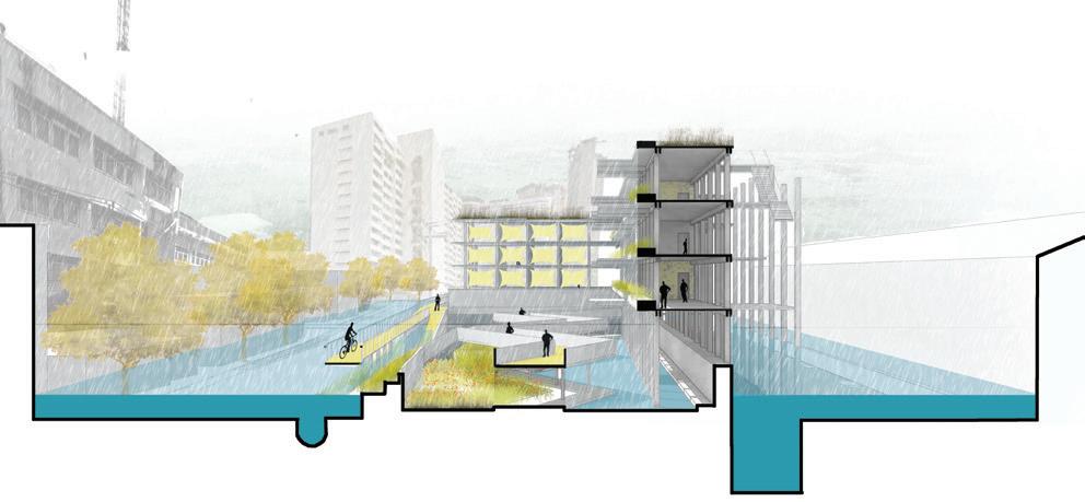 In the long run, the decentralized sewage system will have a neighborhood center that will incorporate spaces for the surrounding communities to work, green spaces, spaces of stories where dying communities will be celebrated and a cycle station where cycles can be rented out. During the Flood situation, it will act as a place for shelter and the elevated cycling path will act as an evacuation path.