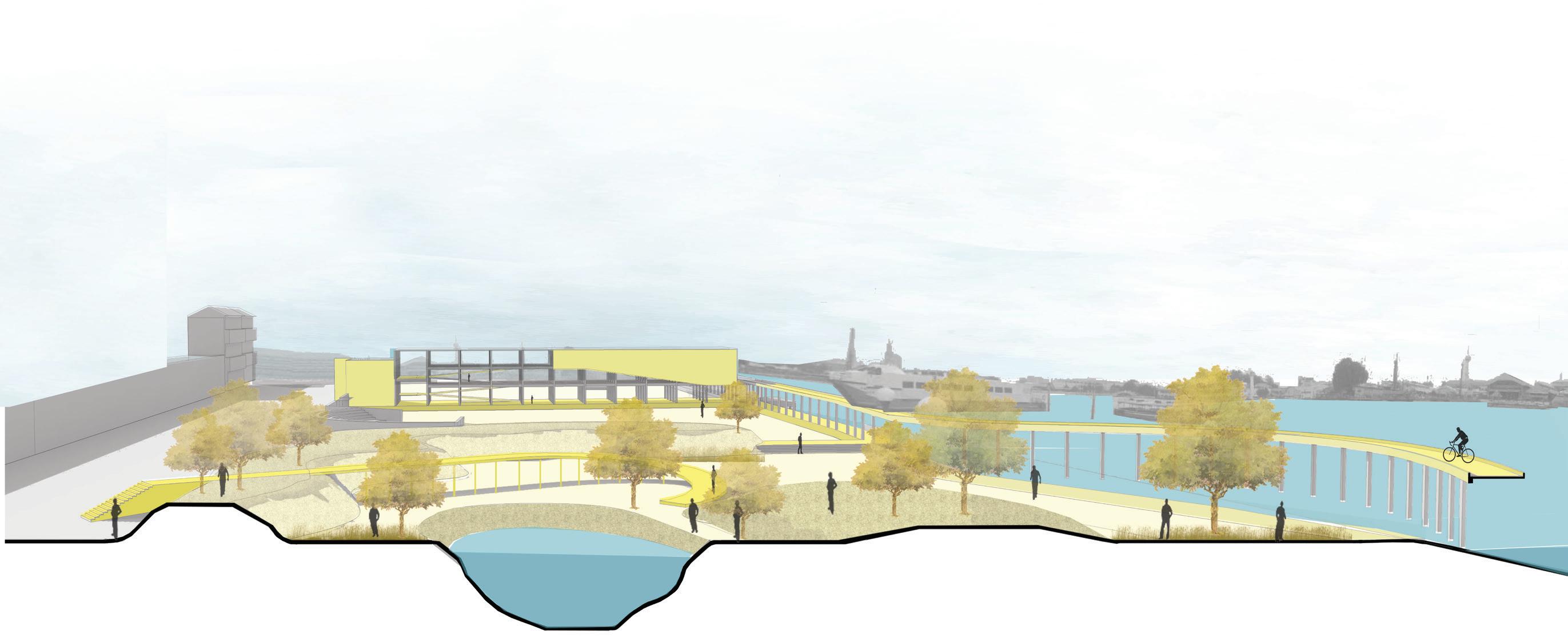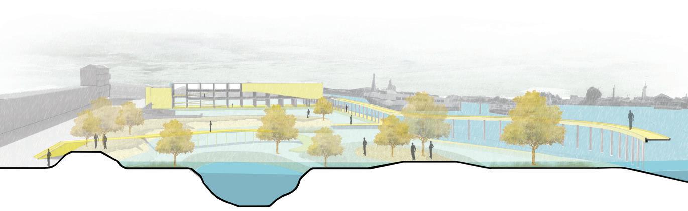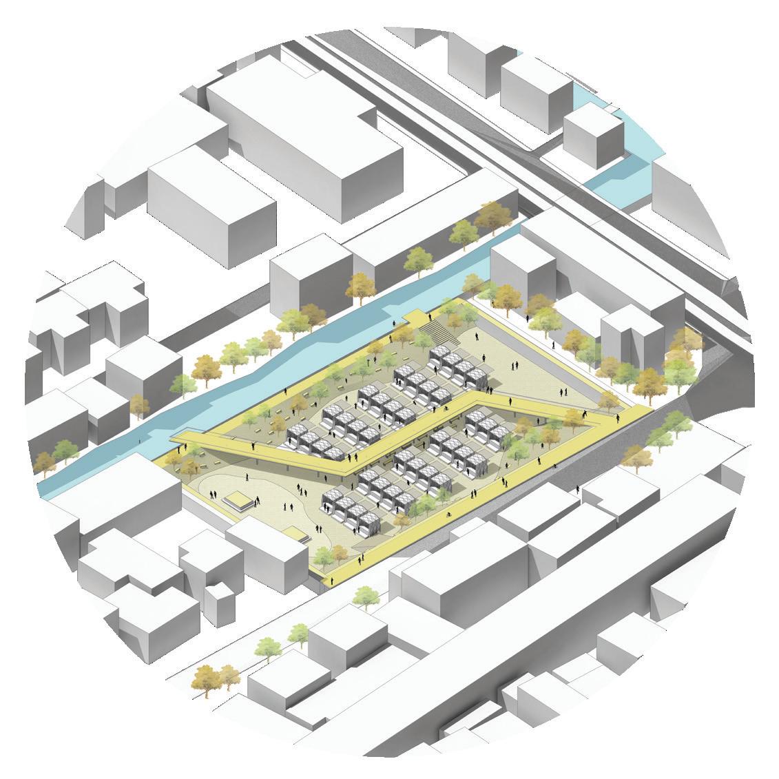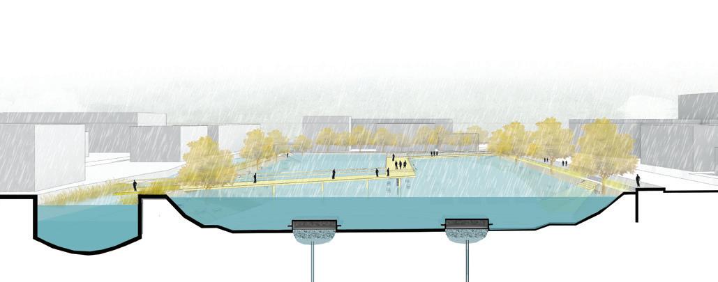 In the long run, the decentralized sewage system will have a neighborhood center that will incorporate spaces for the surrounding communities to work, green spaces, spaces of stories where dying communities will be celebrated and a cycle station where cycles can be rented out. During the Flood situation, it will act as a place for shelter and the elevated cycling path will act as an evacuation path.