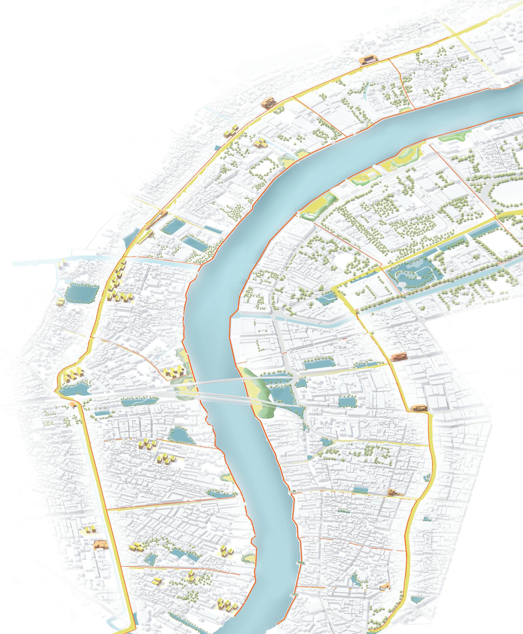 To protect the river from excessive flow, a green belt is proposed along the tributaries and the river Chao Phraya to hold the soil together and increase the absorption rate of the soil along the river. Afforestation in the temple complexes in Bangkok is proposed to set an example for the city in a place that is the most revered.