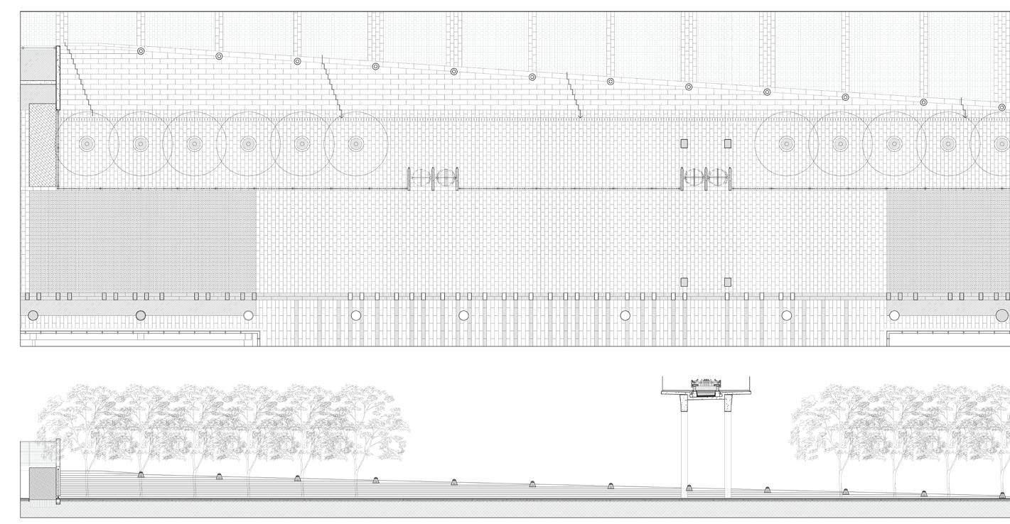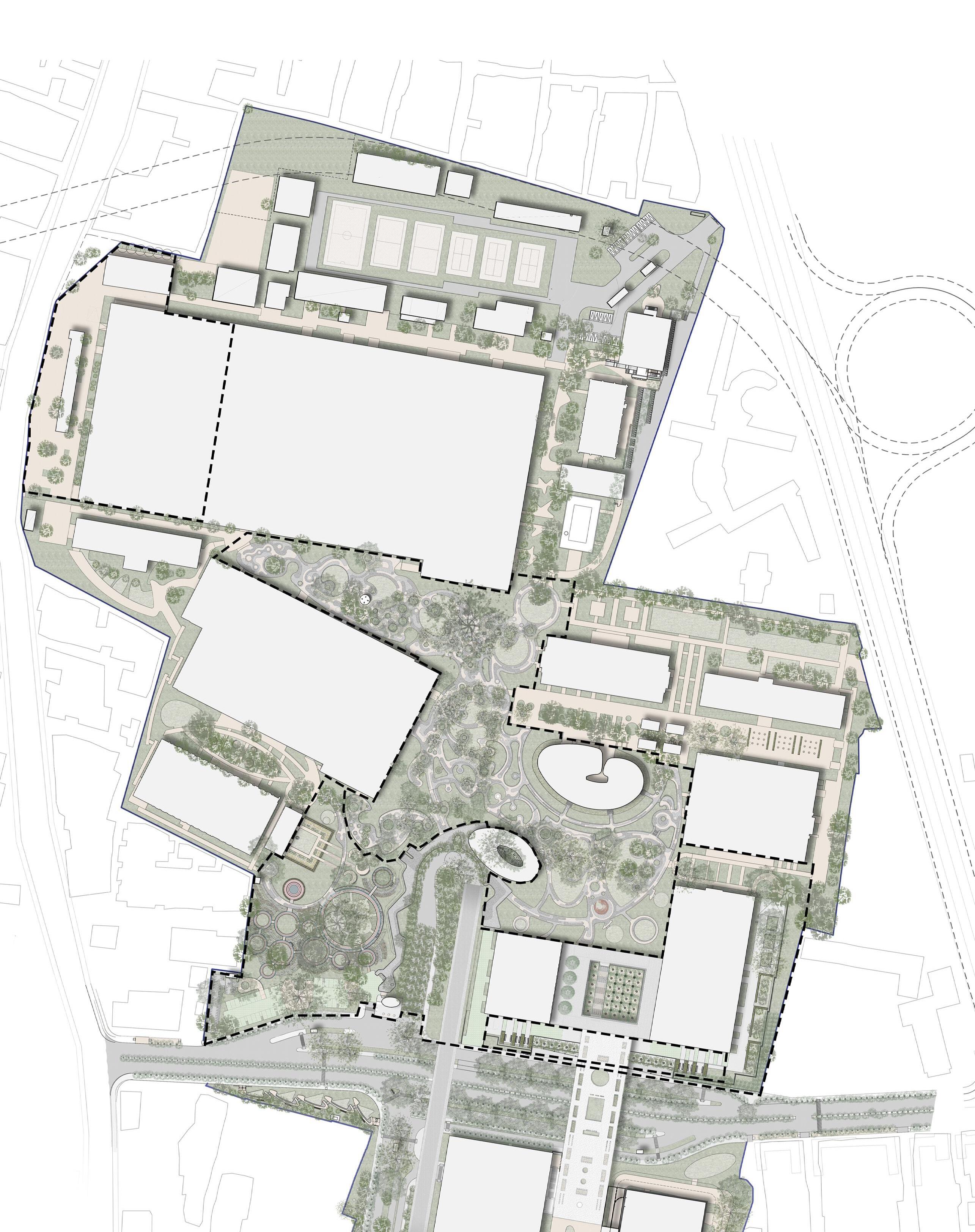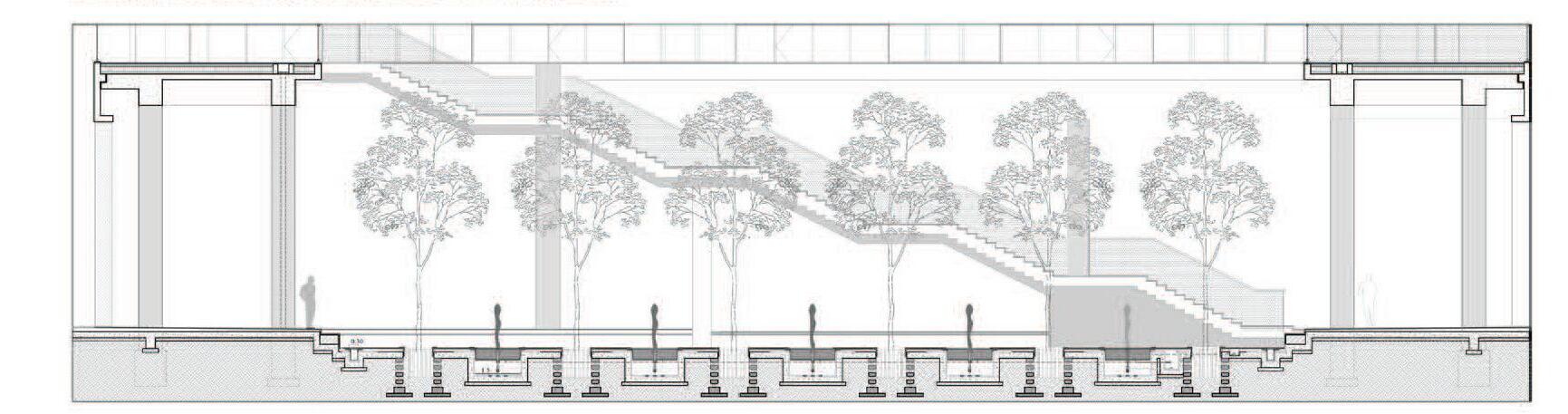 Facing a busy road, this zone leads into the entrance plaza and the ‘Garden of Magnificent Trees.’ I detailed the stepped and ramped edges and their circular geometries around existing trees.
