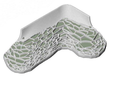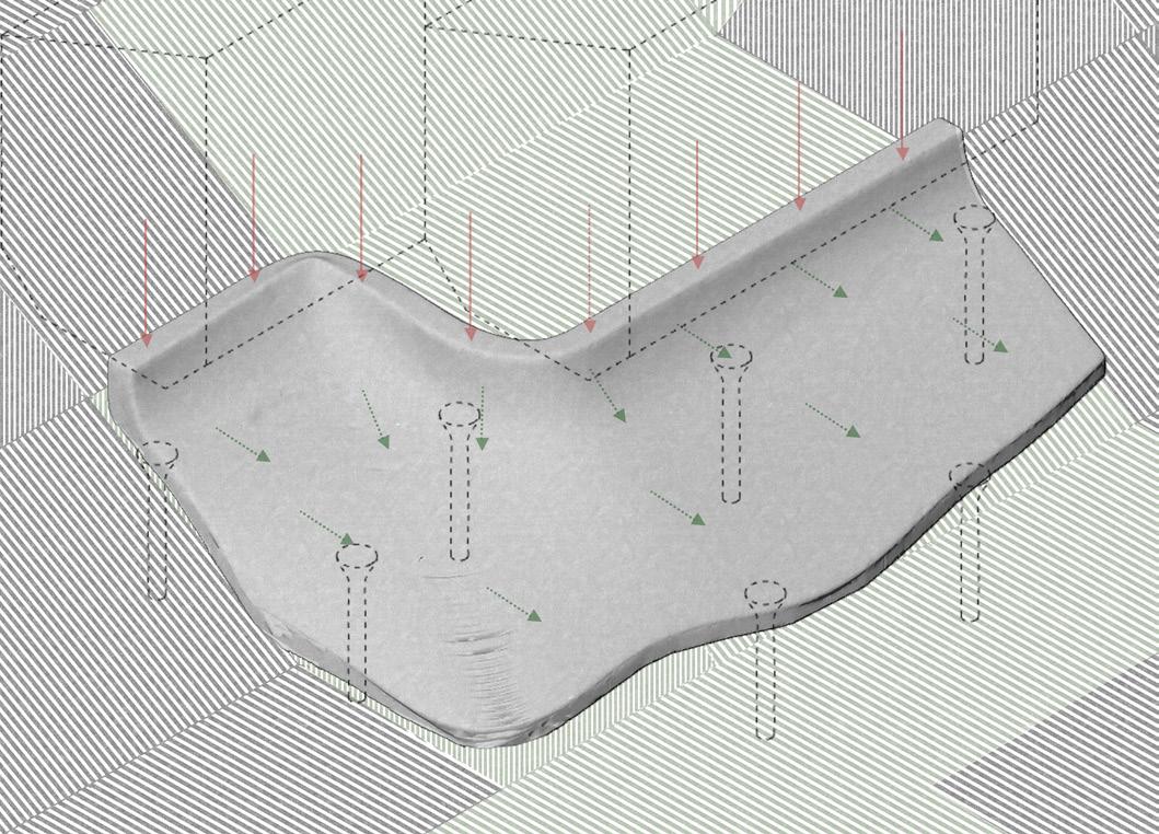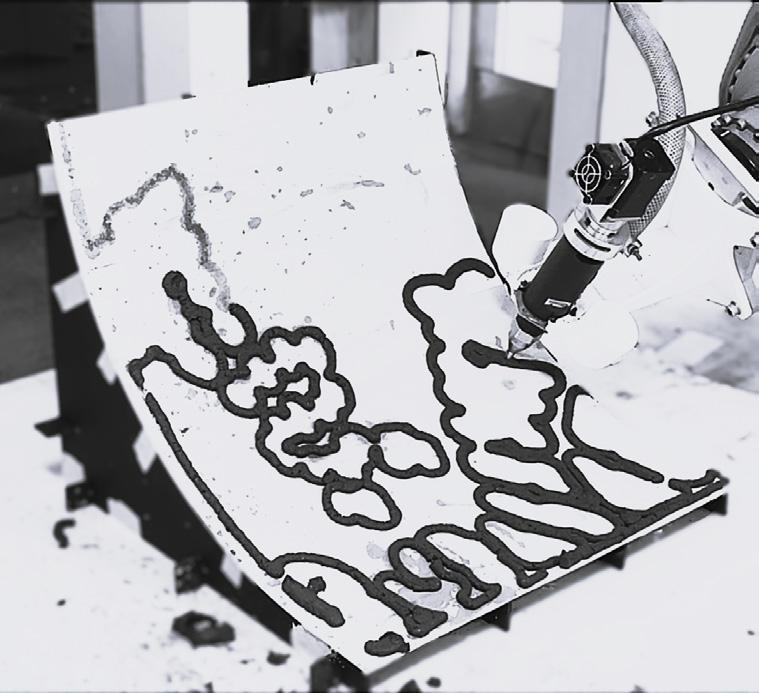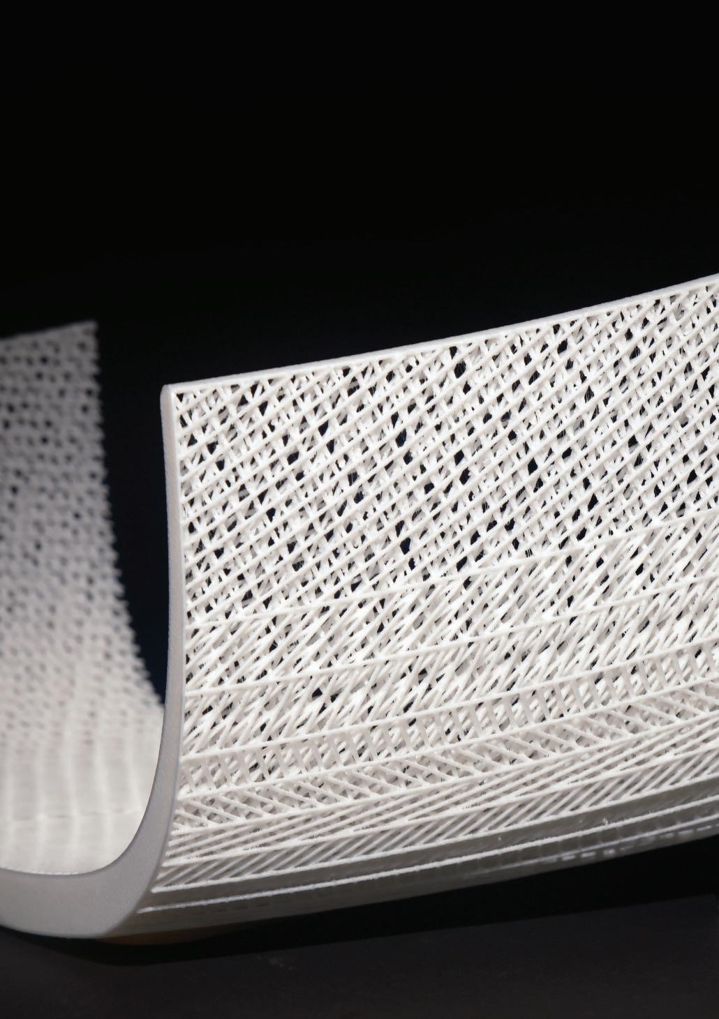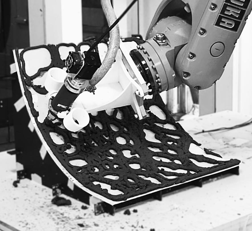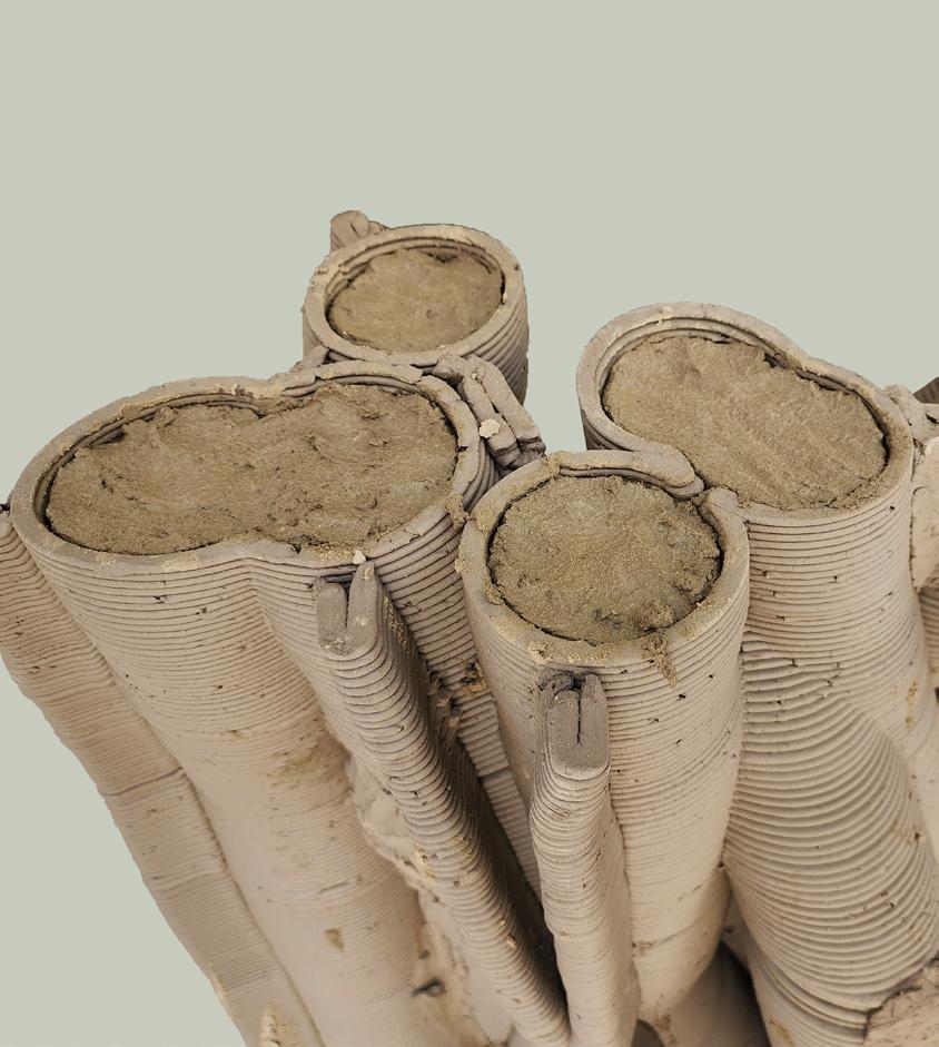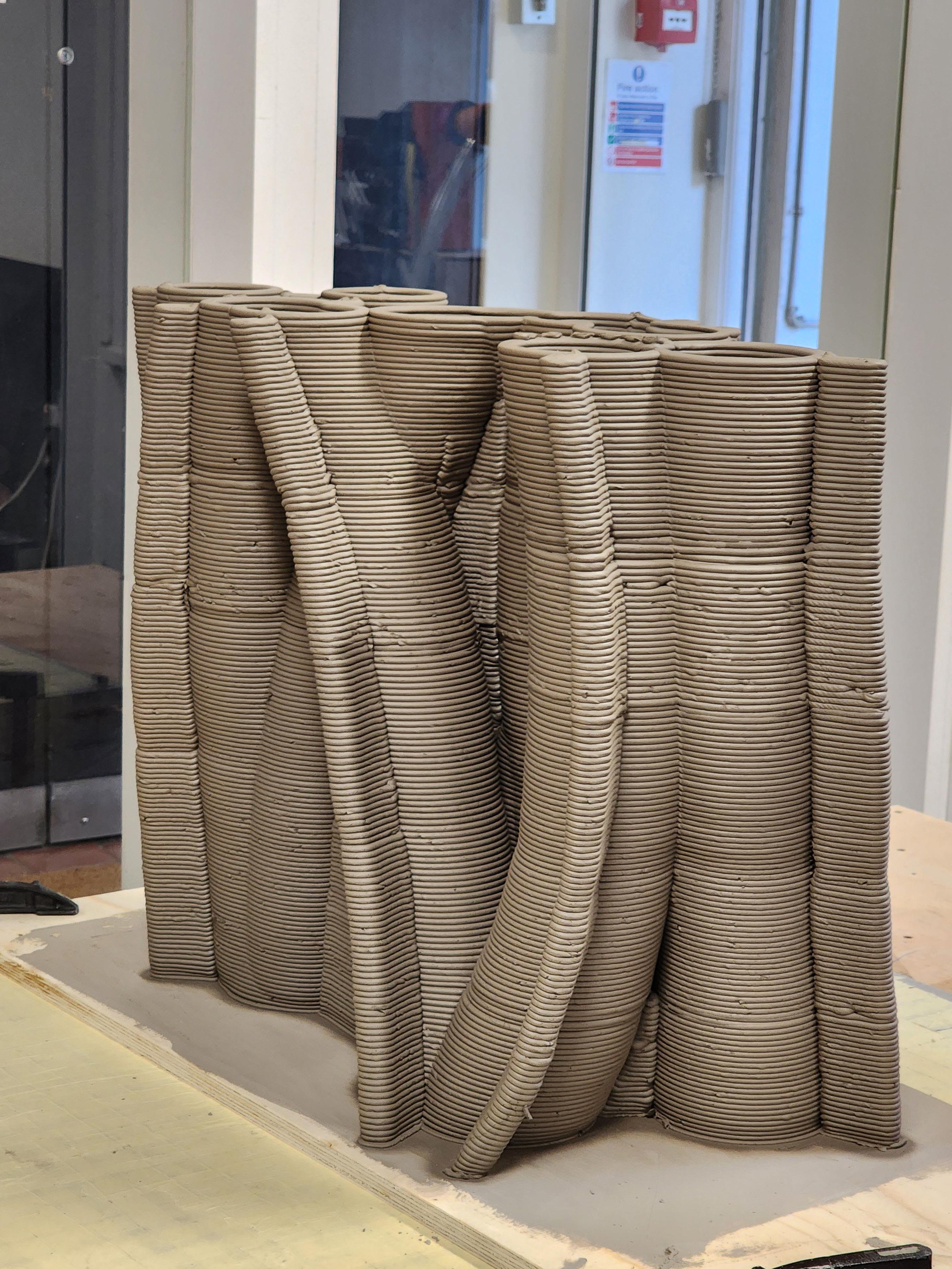 Prototypes tested material and structural performance through multiple composition trials and robotic extrusion, with continuous feedback between material development and design. Large-format 3D printing challenges are understood, leaving scope for future research to refine the geometry.