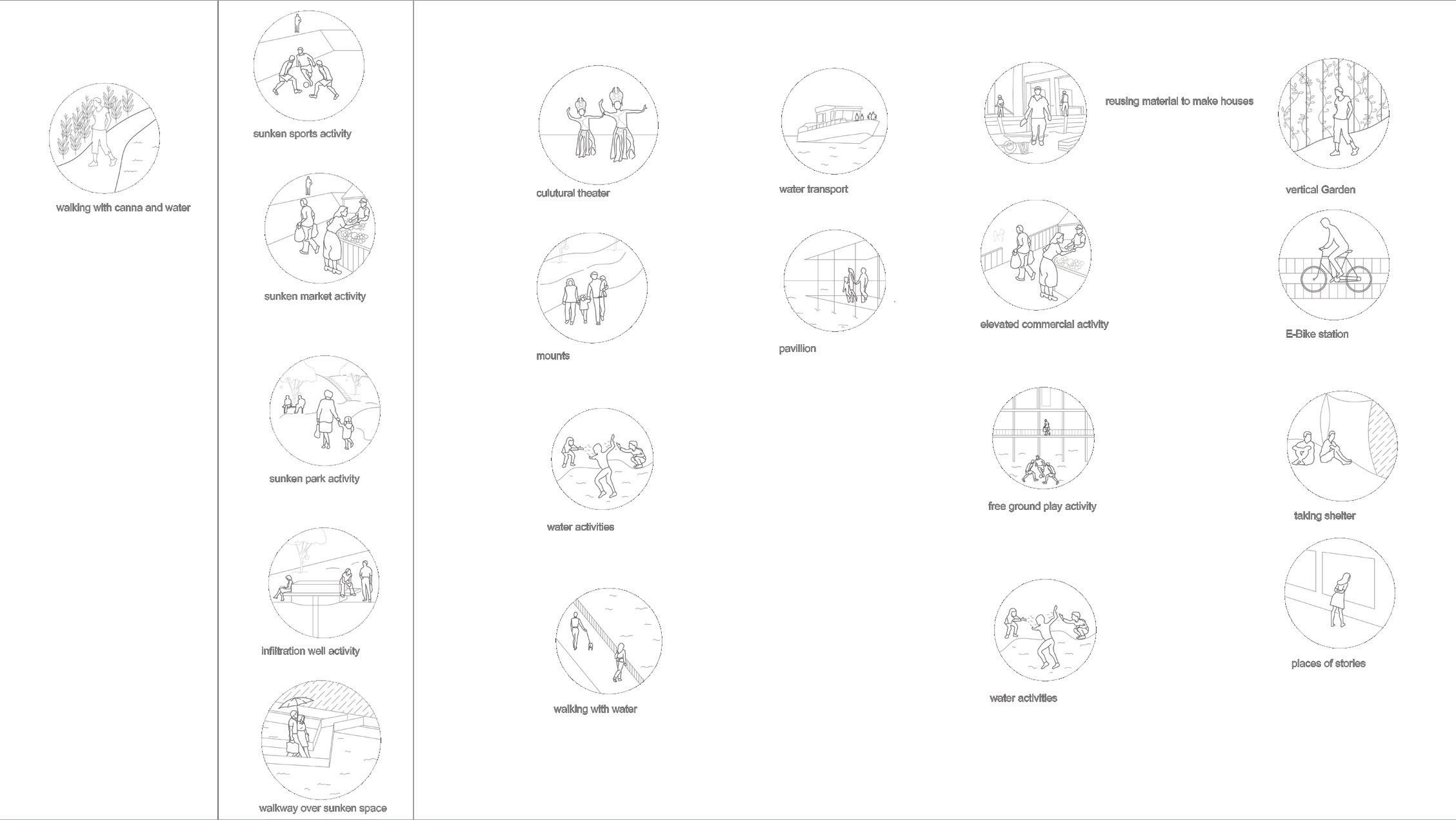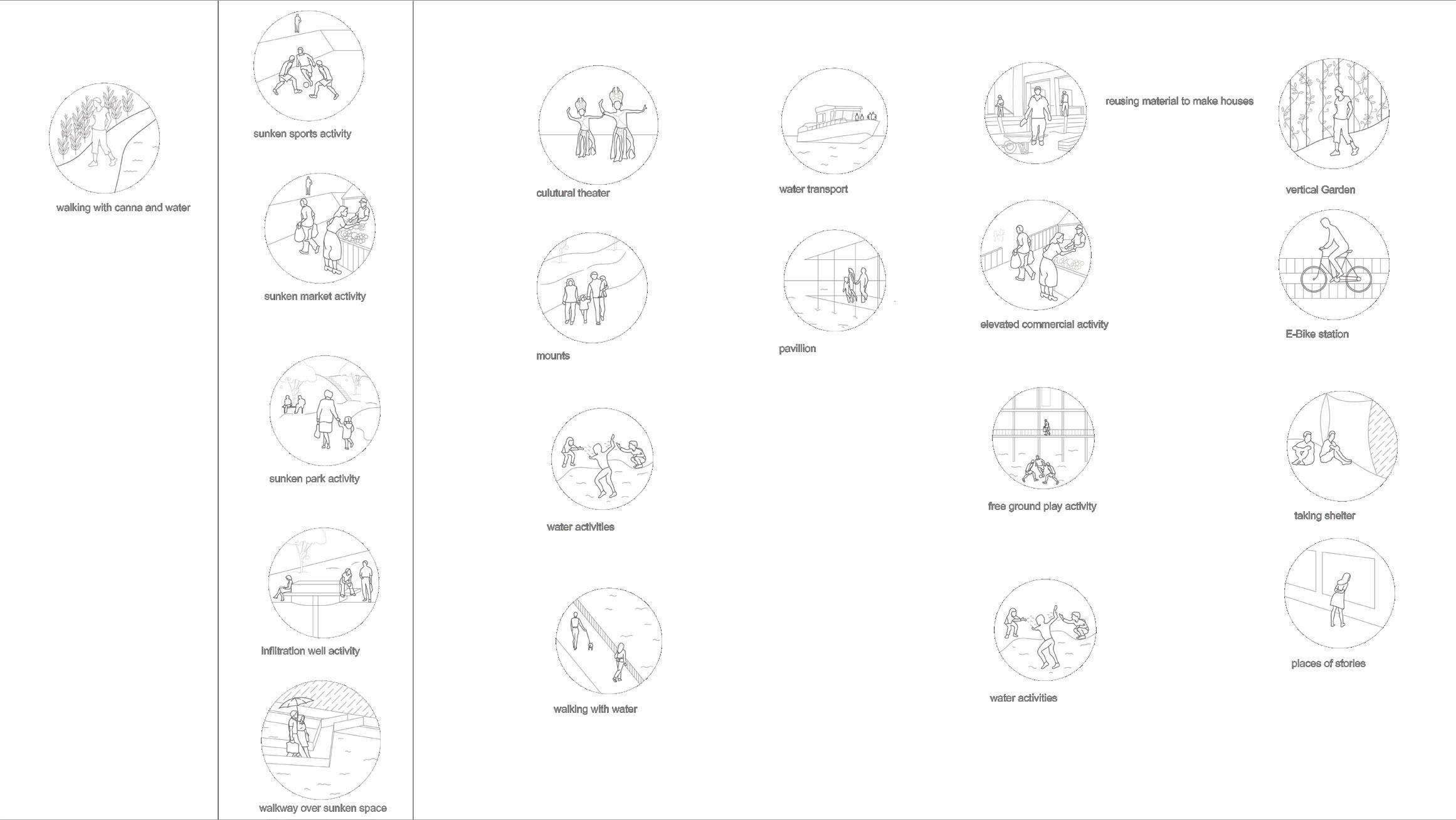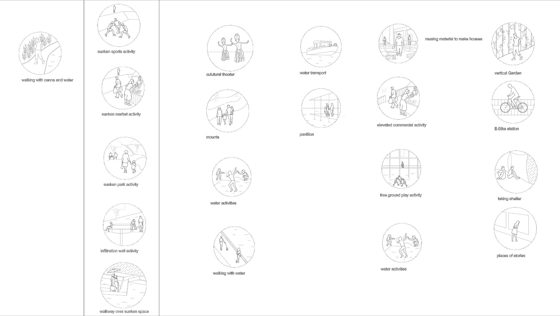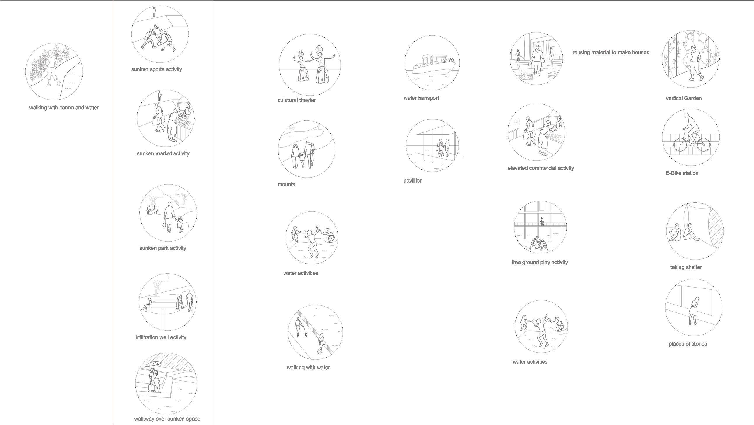 A softer approach to soak in maximum water to the ground is adopted by making sunken social and sport-related spaces. This would help as Bangkok has many areas with depleted groundwater. These spaces would hold public activities throughout the year and hold water during heavy rains and then percolate it in the ground over time through infiltration wells.