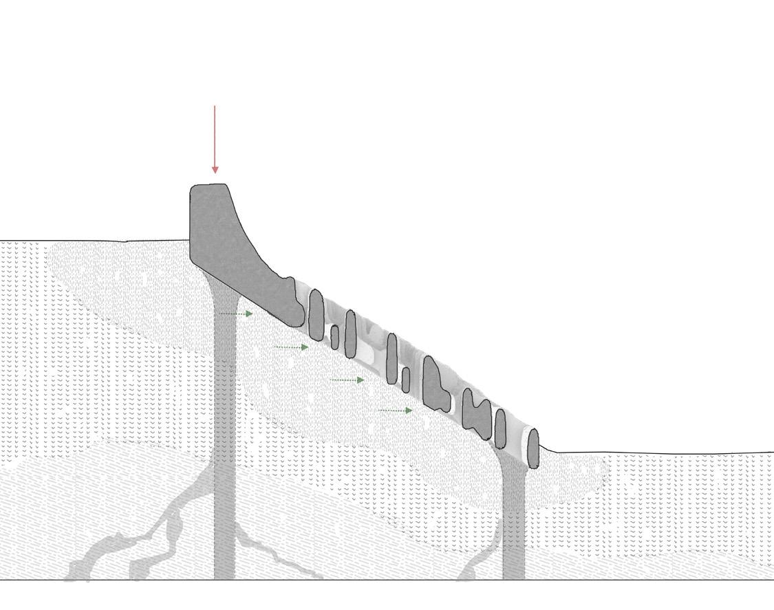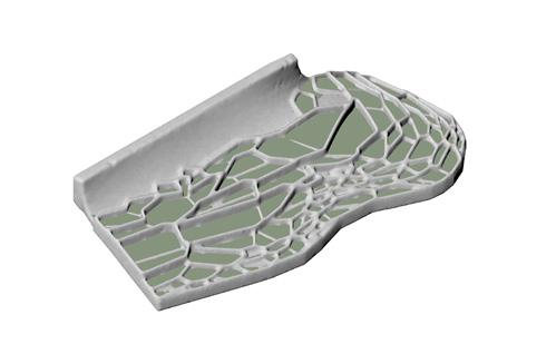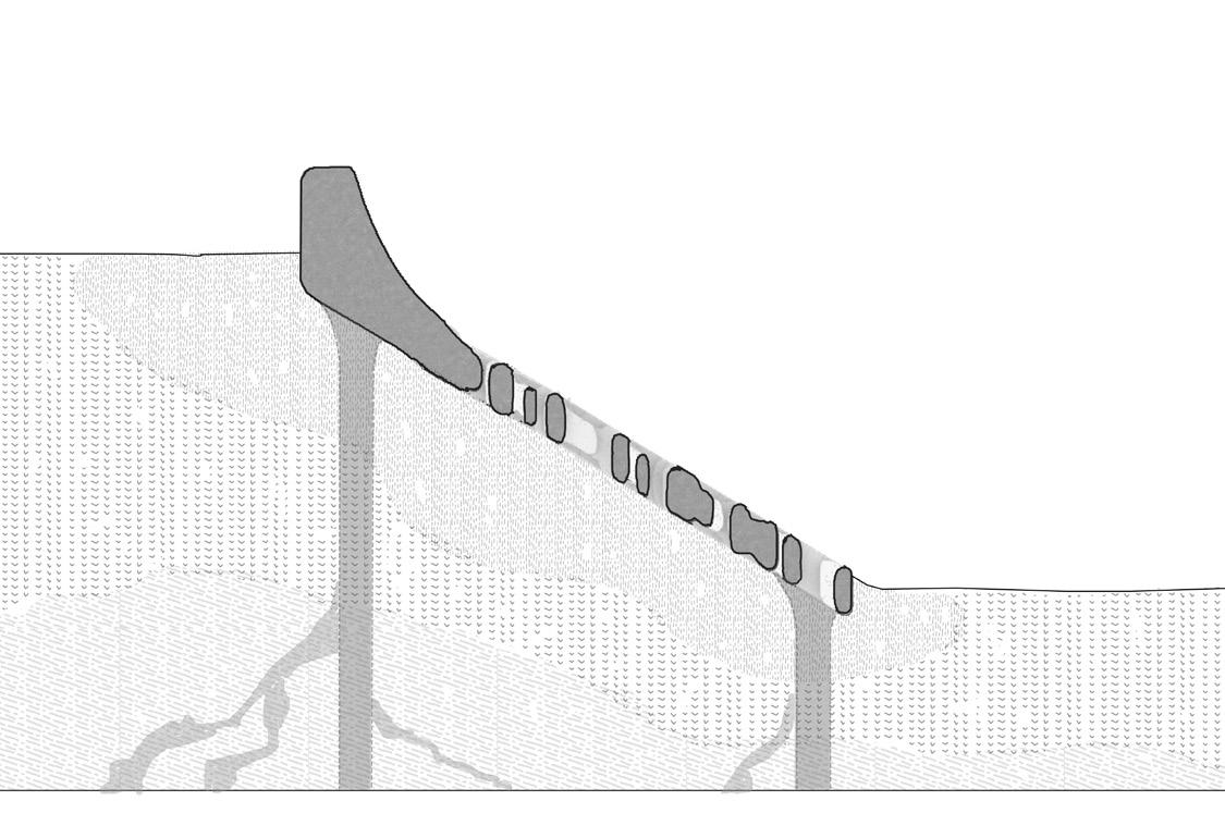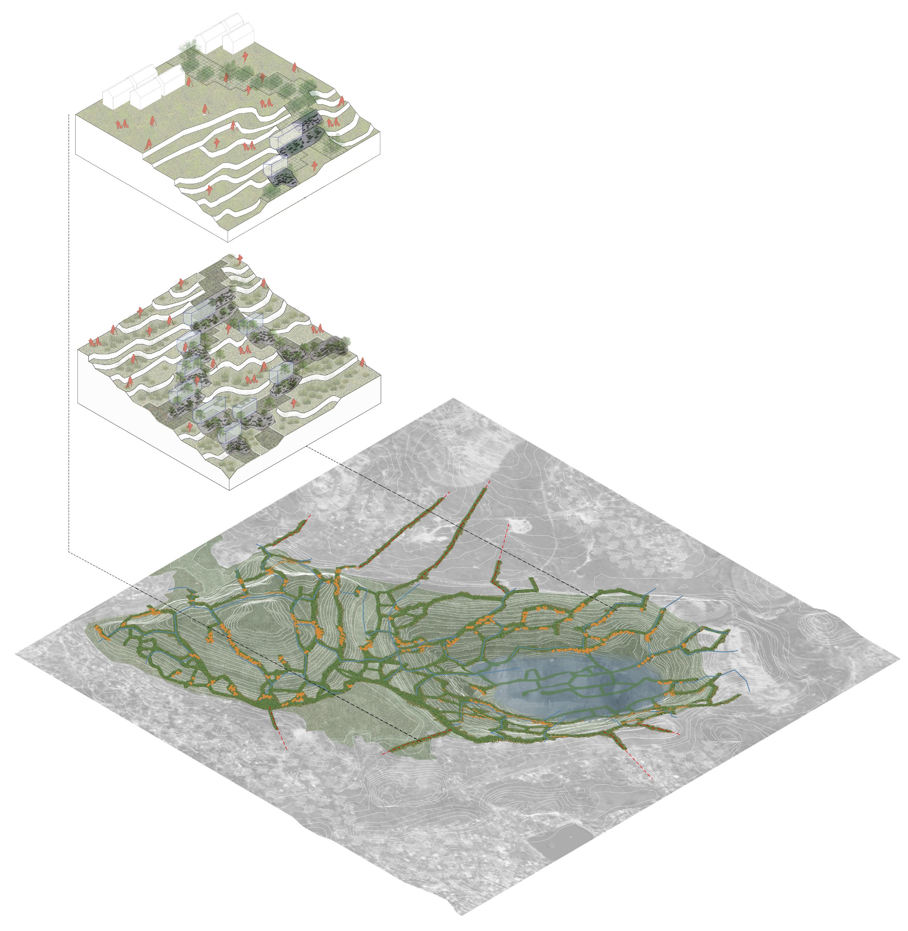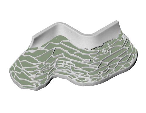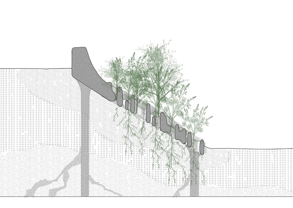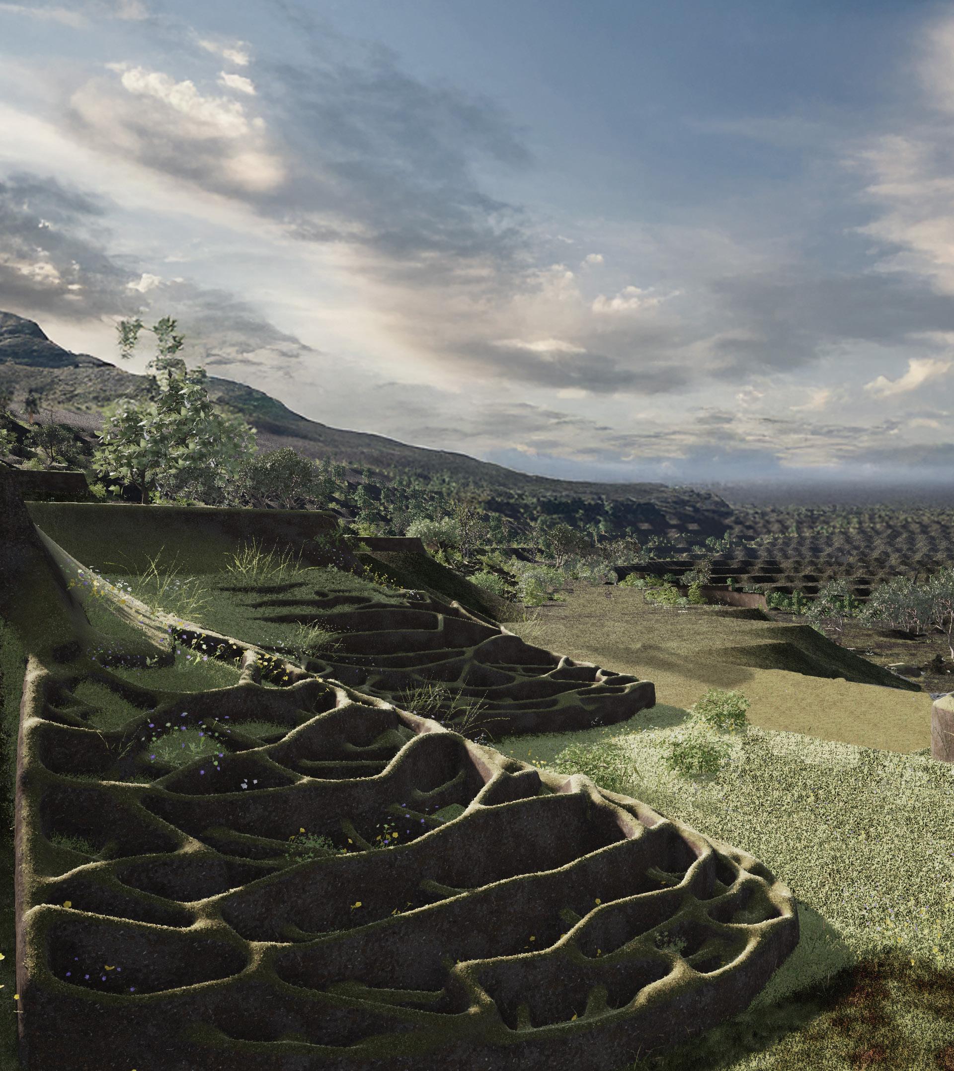 Speculative reconstruction of stabilised terraces formed through bio-receptive 3D printed systems.