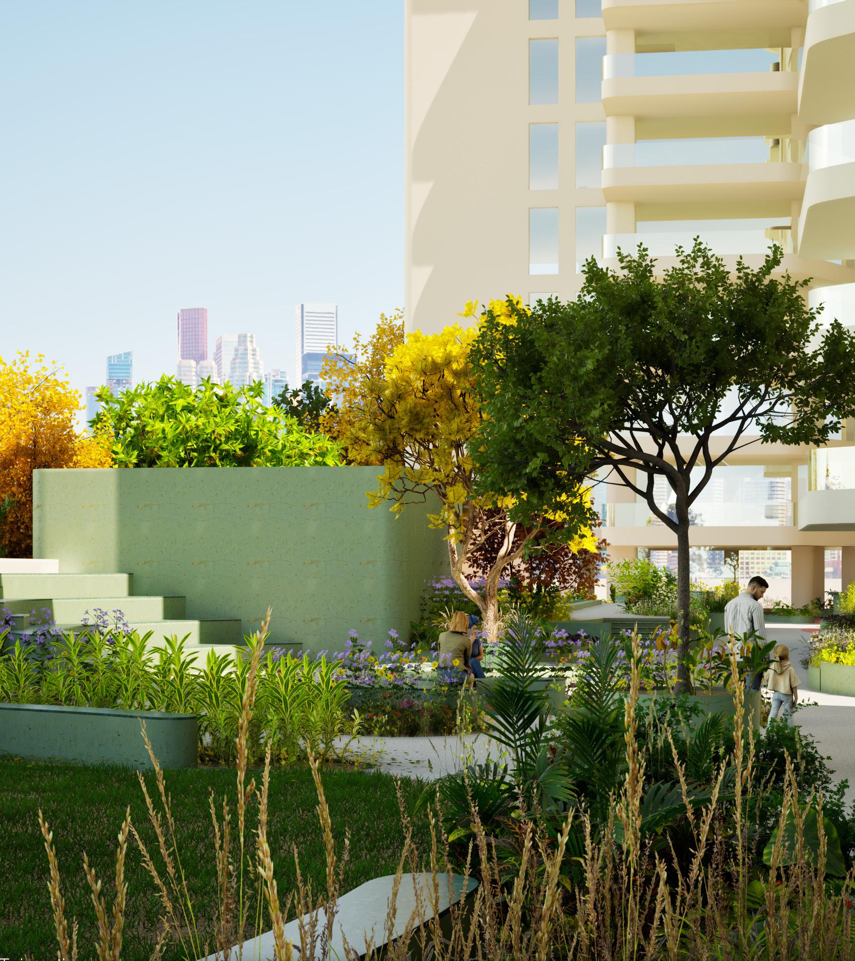 The project proposes a podium space design between residential towers centred around a pedestrian plaza interwoven with planting pockets. Conceived as a playful and colourful public space, it accommodates a series of smaller functional zones including an amphitheatre, café, multi-use courts, play areas, and event lawns. Key activity nodes are positioned along a seamless, meandering walking plaza, creating moments of pause and interaction. The planting palette is tailored for a dry climate and the podium condition of the site allows for a landscape designed with minimal soil depth while still supporting diverse spatial experiences.