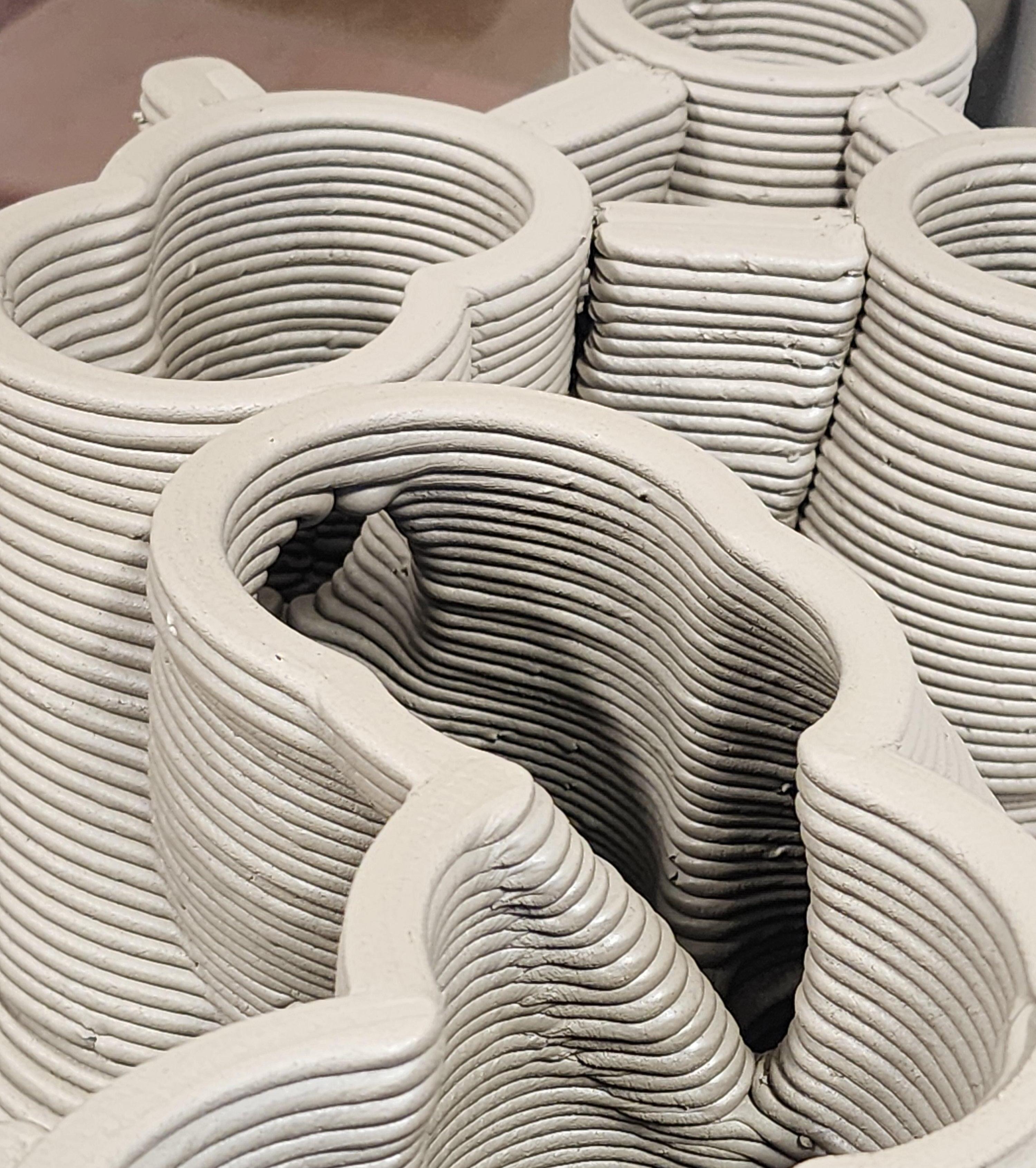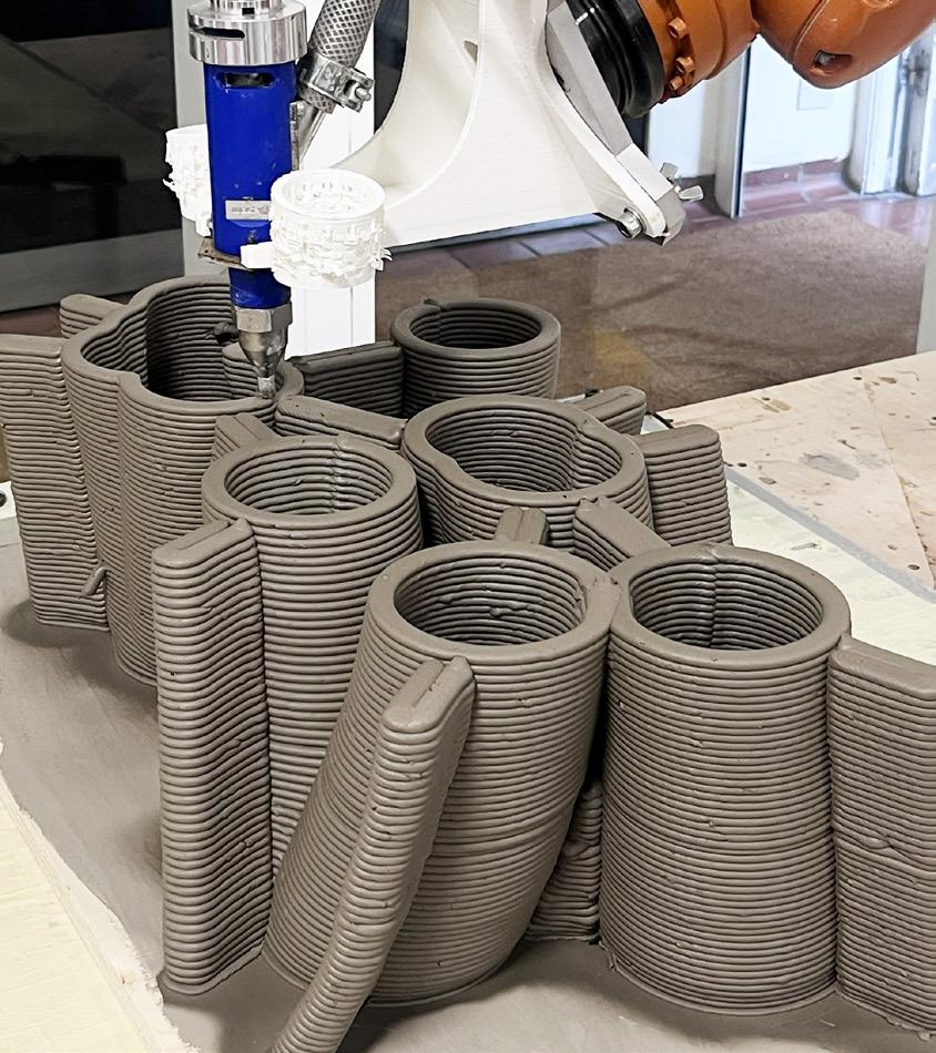 Robotic 3D printing of the geometry using supporting clay fins to provide structural stability during fabrication.