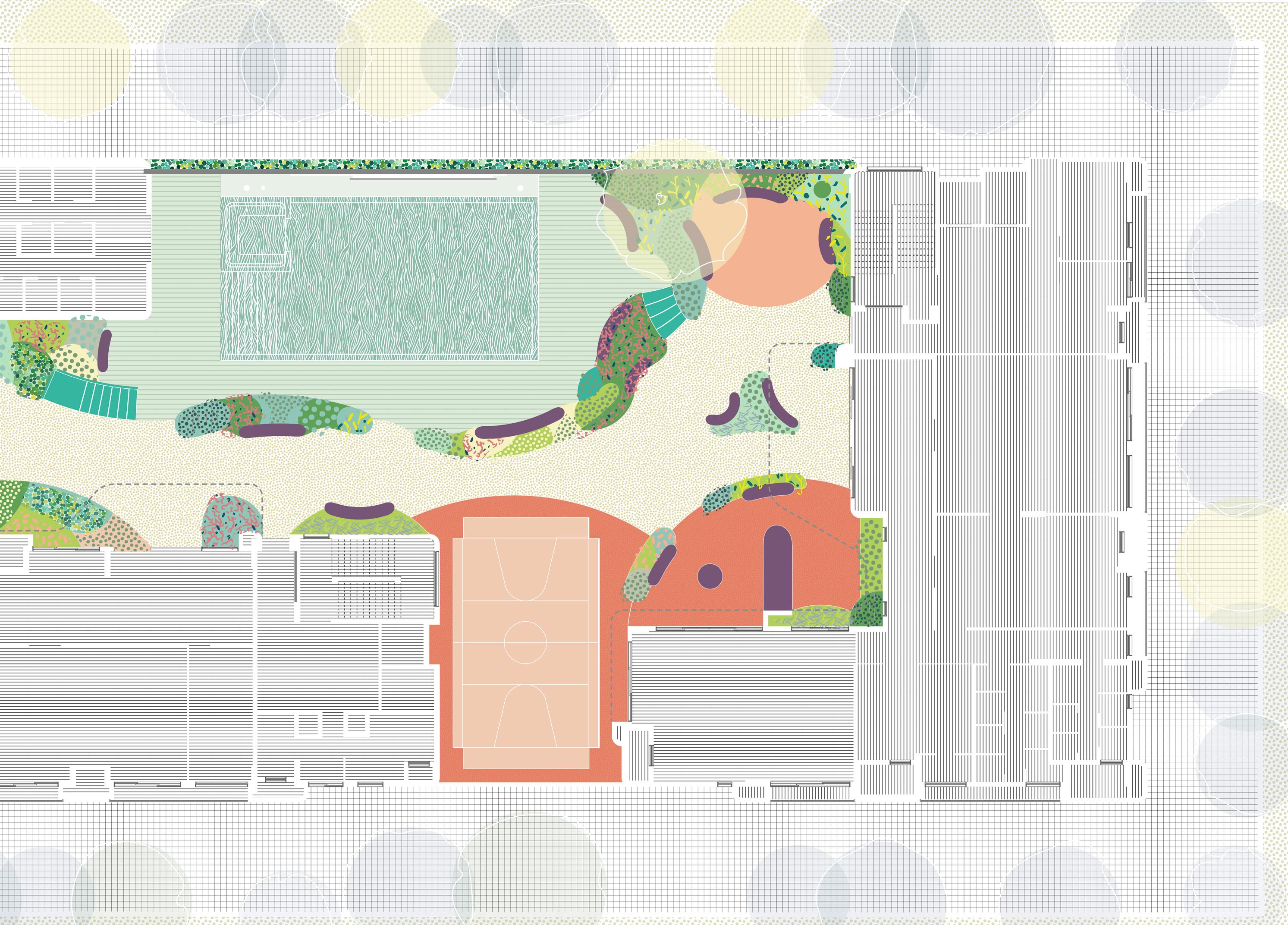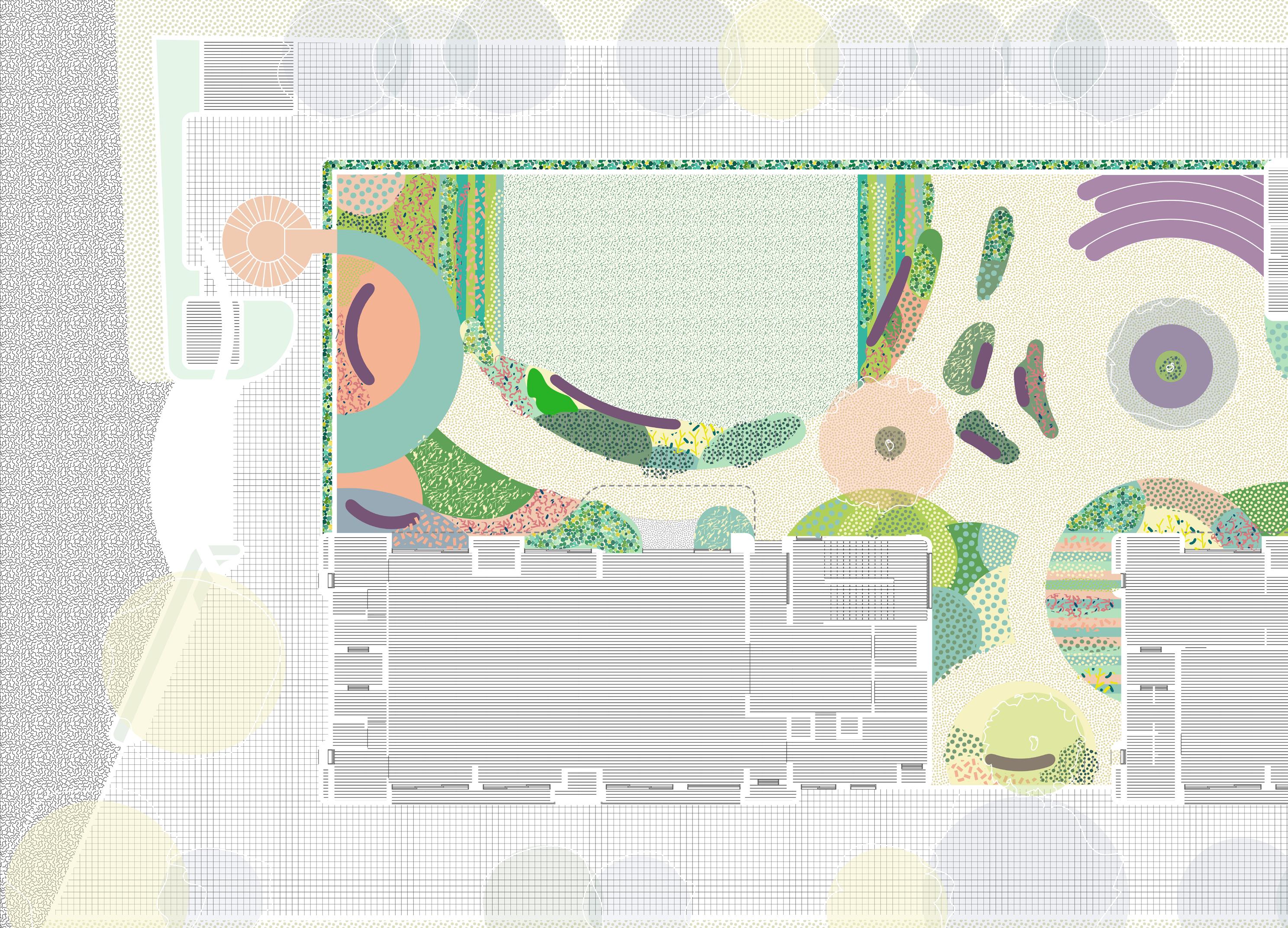 Presented with a meandering geometry that embraces existing trees, integrates underground services, and guides pedestrian movement with intentional pauses through plantings and ground cover, I collaborated on using three types of stonecrete mixtures. This approach responds to material demands and accentuates movement, fosters playful pauses, and establishes guiding lines within this large floor plate connecting adjacent buidlings. This forms the heart of the project with this playful graphic across 3000 sq mt.
