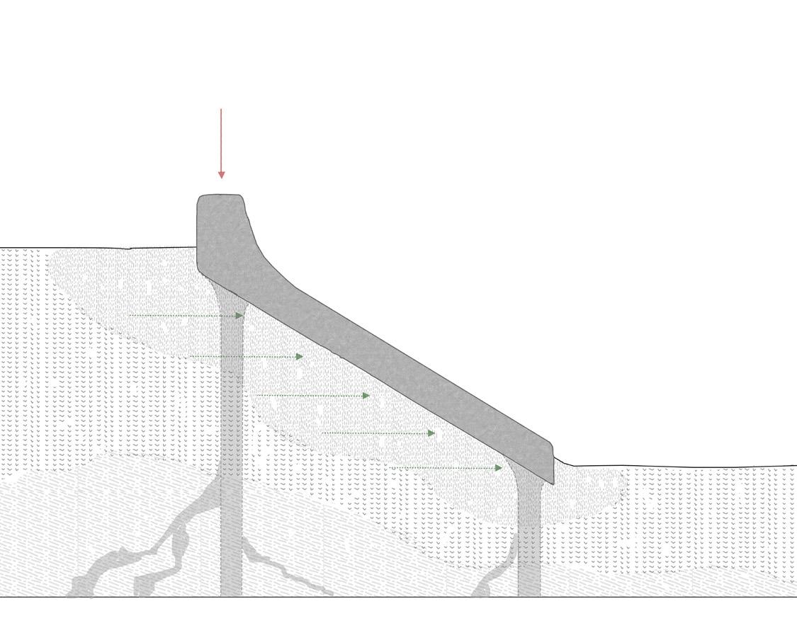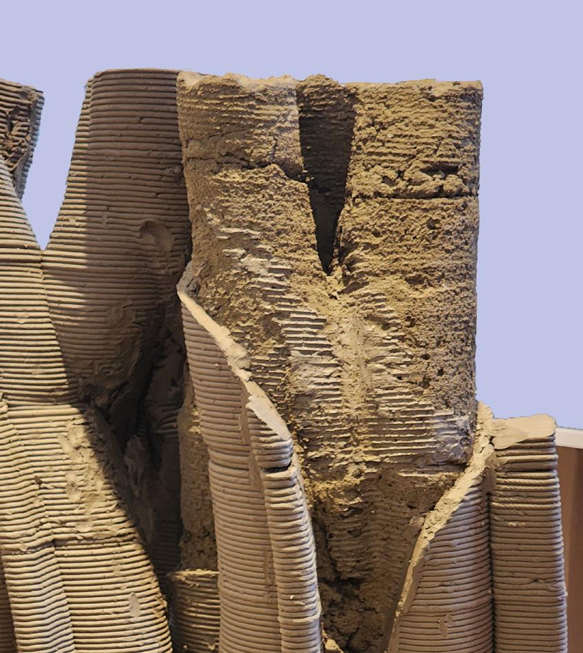 The bioreceptive wall supports plant growth for ground stabilisation while forming an anchored base for future architectural foundations. Varying planting pockets respond to structural forces, adjusting material thickness where required. Each wall is terrain-specific and is 3D printed in situ using materials sourced on site and in the region. The material mix of fly ash, lime, biochar, soil, organic matter and stabilisers was refined through compression tests and robotic extrusion trials.