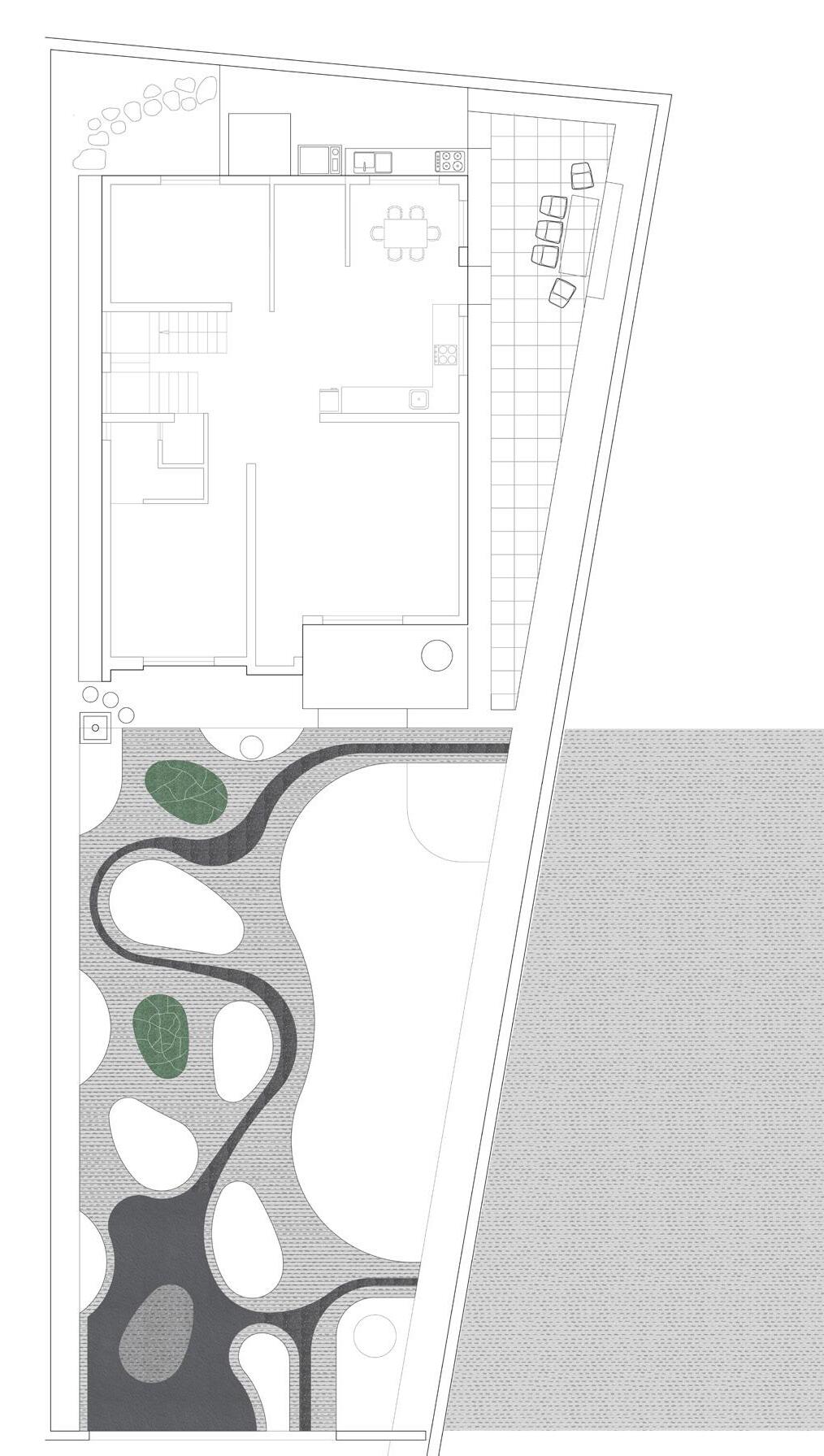 Extending a modest house beside an agricultural field, the project forms a small garden articulated through planting pockets and gently meandering paths. An abstracted river motif runs across the ground, while a matrix of seasonal plantings reveals shifting characters throughout the year. The proportions between planted areas and textured open spaces establish distinct atmospheres and define how the garden is inhabited and moved through.