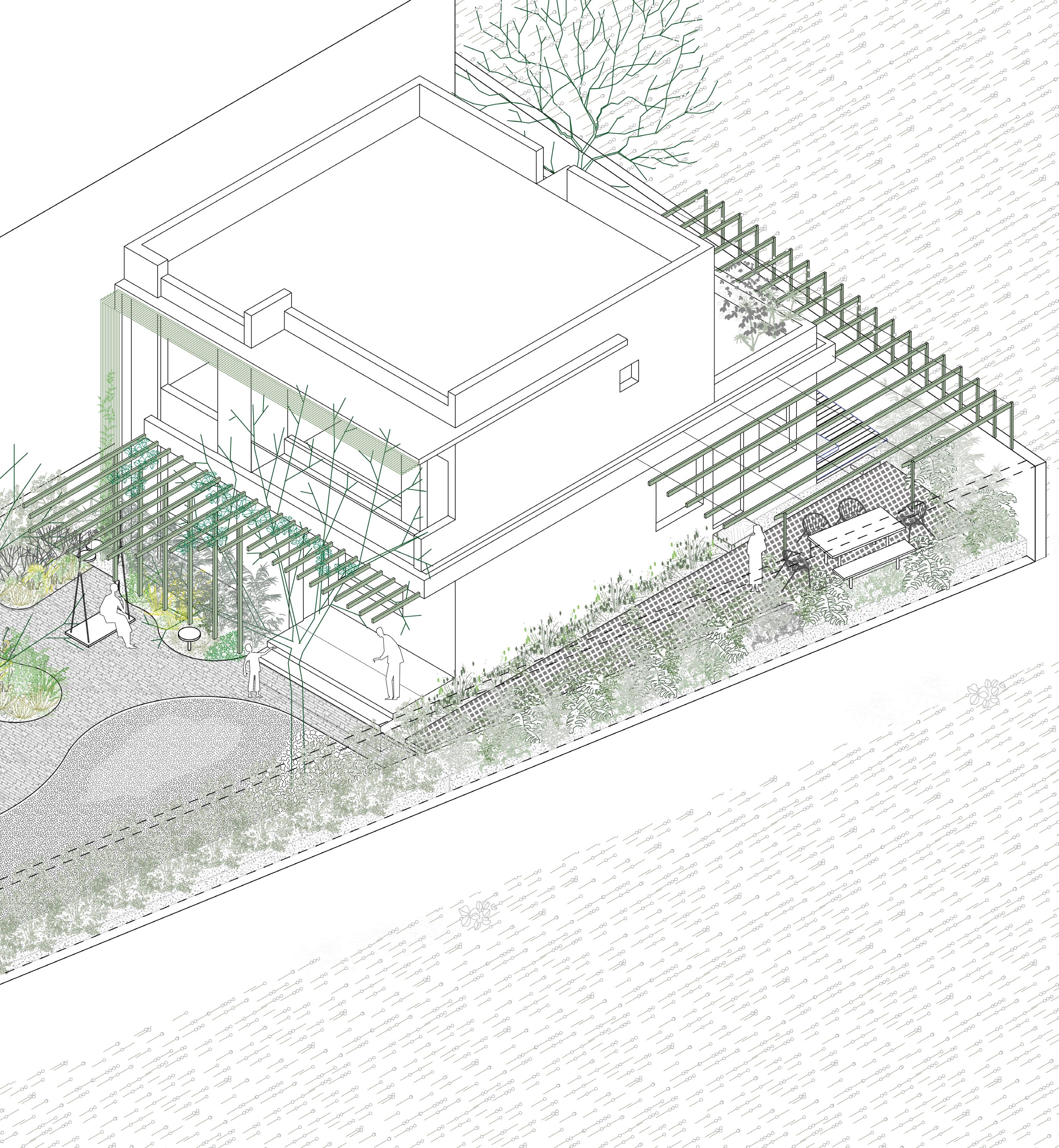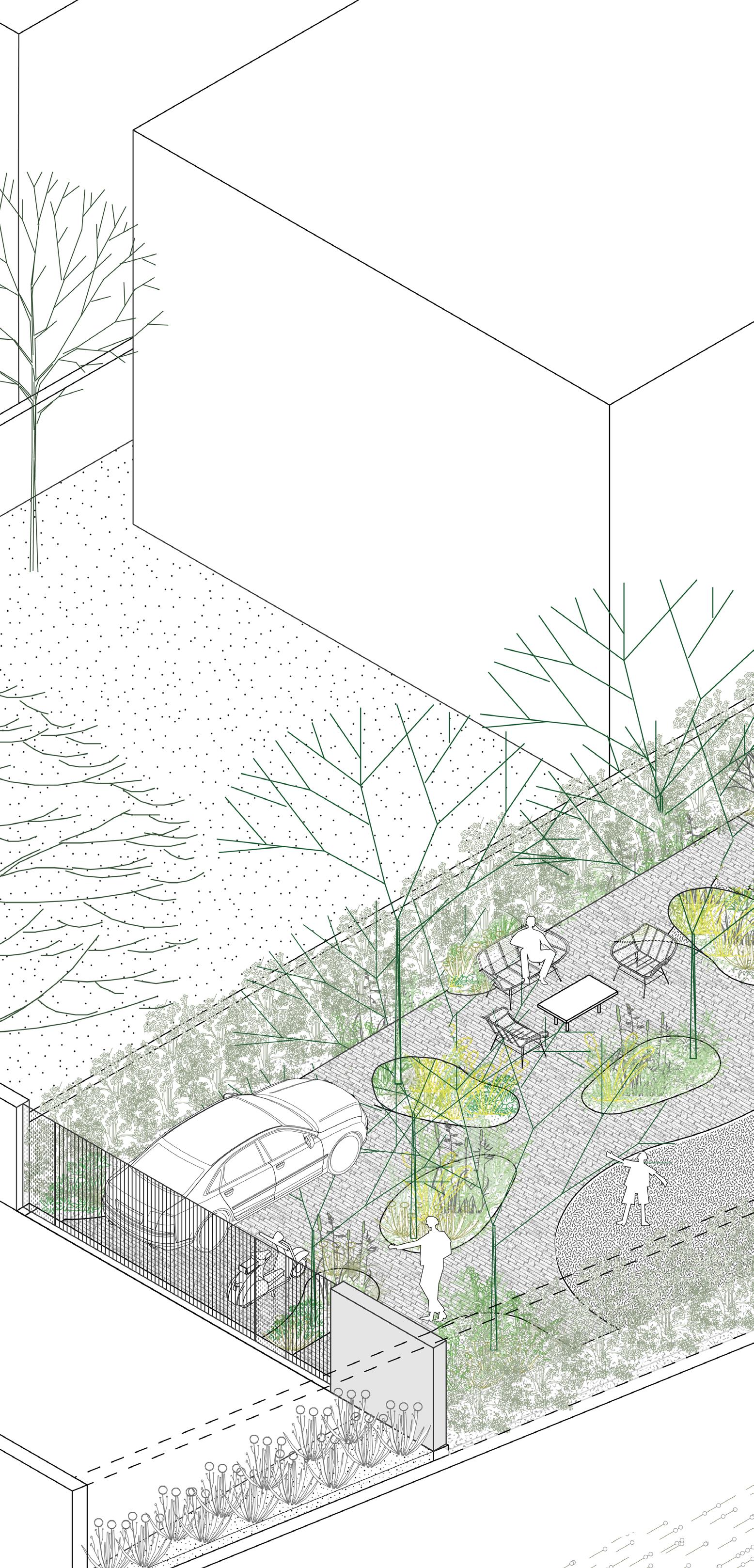 A small garden takes shape, revealing nuanced elements seamlessly interwoven. Diverse mixed plantings form islands, engaging the curious mind. A large ground surface, divided but not fragmented, facilitates movement and smaller pockets. Trees provide shade, fostering spaces for both play and quiet.