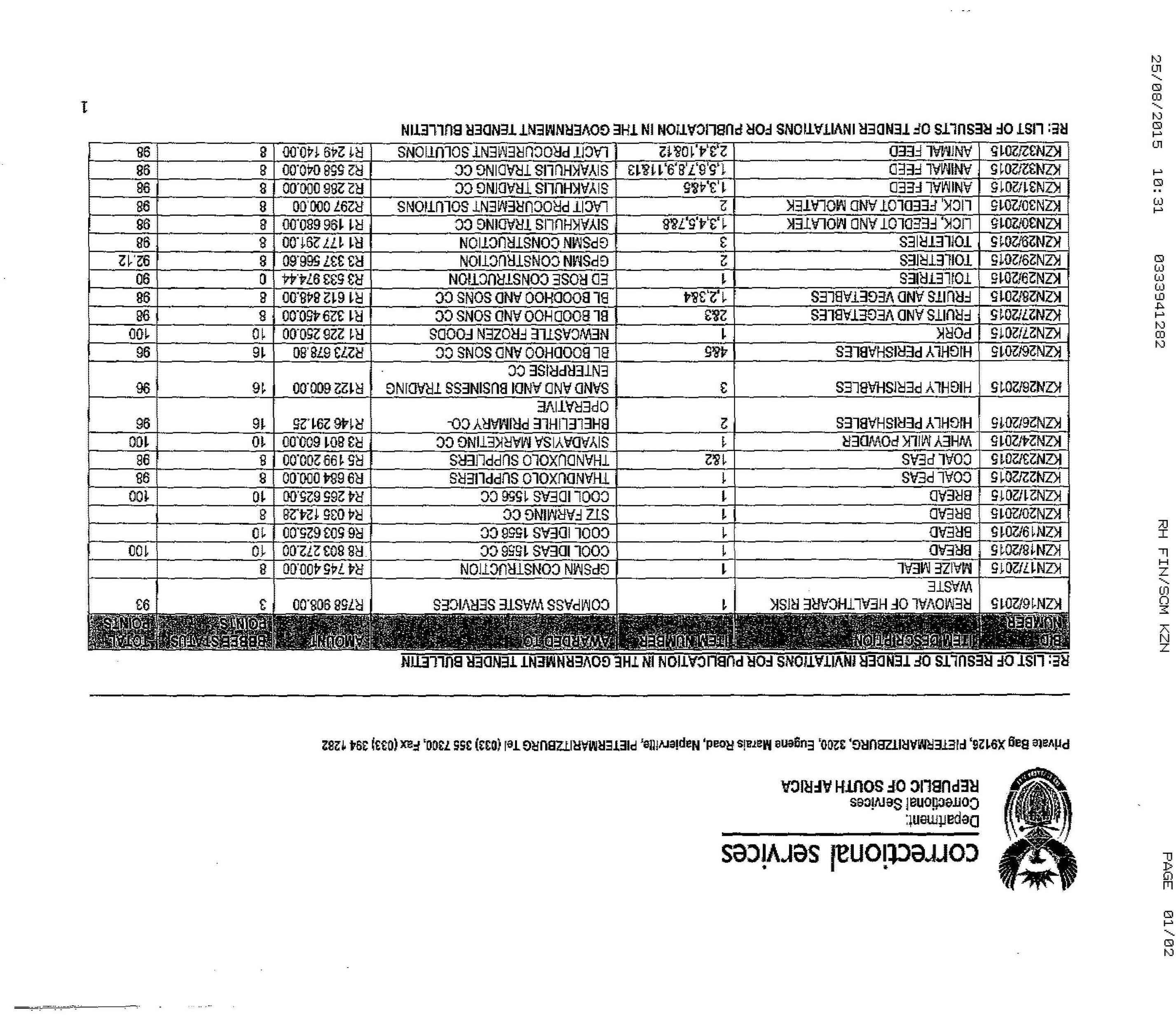 atonlinefreeavailablealsoisgazetteThis www.gpwonline.co.za 172 2015SEPTEMBER4BULLETIN,TENDERGOVERNMENT2884No.NumberTender Tender Description Winning Bidder Amount PointsB-BBEE PointsTotal R-056-2013SPSC-BCSection 1 Supply of canned fruit and vegetables to the DOD Units in Port Elizabeth (ASB Eastern Cape Area) over a period of two years West TradingPoint18 CC R132 361.65 Level 3 (8 points) 98 Section 2 Supply of dried fruit as above Jays Agencies EP CC R213 283.20 Level 1 points)(10 100 Section 3 Supply of juices as above West TradingPoint18 CC R684 320.00 Level 3 (8 points) 98 R-057-2013SPSC-BCSection 1 Supply of pasta for the DOD units in Port Elizabeth (ASB Eastern Cape Area) over a period of two years Curoprox (Pty) Ltd R302 061.20 Level 4 (5 Points) 95 Section 2 Supply of cereal as above Blues TradingAlley144 R388 774.48 Level 1 points)(10 99.19 R-058-2013SPSC-BC- Supply of sugar and sweets, nuts and honey for the DOD Units in Port Elizabeth (ASB Eastern Cape Area) over a period of two years Jays Agencies EP CC R314 988.95 Level 1 points)(20 100 R-060-2013SPSC-BC- Supply of soups for the DOD units in Port Elizabeth (ASB Eastern Cape Area) over a period of two years Curoprox (Pty) ltd R192 542.00 Level 4 points)(12 92 R-063-2013SPSC-BC- Supply of condiments for the DOD Units in Port Elizabeth (ASB Eastern Cape Area) over a period of two years Datsisolve (Pty) Ltd R360 17.94 Level 3 (8 points) 97.63 R-064-2013SPSC-BC- Supply of tea, coffee, cocoa and milk for the DOD Units in Port Elizabeth (ASB Eastern Cape Area) over a period of 52o years Jays Agencies EP CC R942 650.23 Level 1 points)(10 100 DEPARTMENT OF DEFENCE AND MILITARY VETERANSTO2015KZN16/2015KZN32/ ATSEEATTACHEDPLEASESEEPLEASETACHED