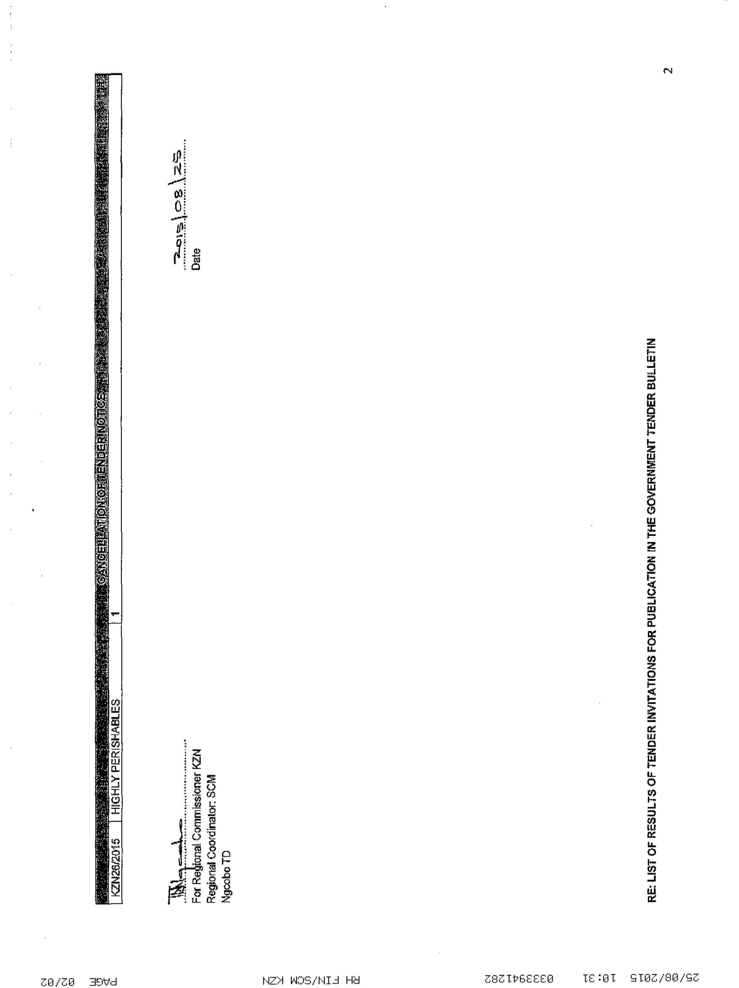 This gazette is also available free online at www.gpwonline.co.za 10 No. 2884 GOVERNMENT TENDER BULLETIN, 4 SEPTEMBER 2015 IMPORTANT NOTICE The Government Printing Works will not be held responsible for cancellations and amendments which have not been done on original documents received from clients. AND THE GOVERNMENT PRINTING WORKS WILL NOT BE HELD RESPONSIBLE FOR ANY ERRORS THAT MIGHT OCCUR IN THE TENDER BULLETIN DUE TO INCOMPLETE / INCORRECT / ILLEGIBLE COPY. NO FUTURE QUERIES WILL BE HANDLED IN CONNECTION WITH THE ABOVE. DISCLAIMER Government Printing Works reserves the right to apply the 25% discount to all Legal and Liquor notices that comply with the business rules for notice submissions for publication in National,gazettes. Provincial, Road Carrier Permits and Tender notices will pay the price as published in the Government Gazettes. For any information, please contact the eGazette Contact Centre on 012-748 6200 or email info.egazette@gpw.gov.za