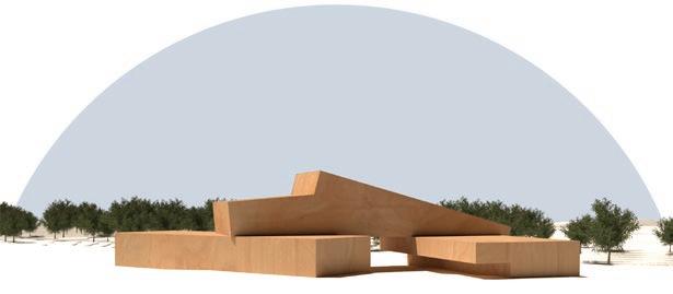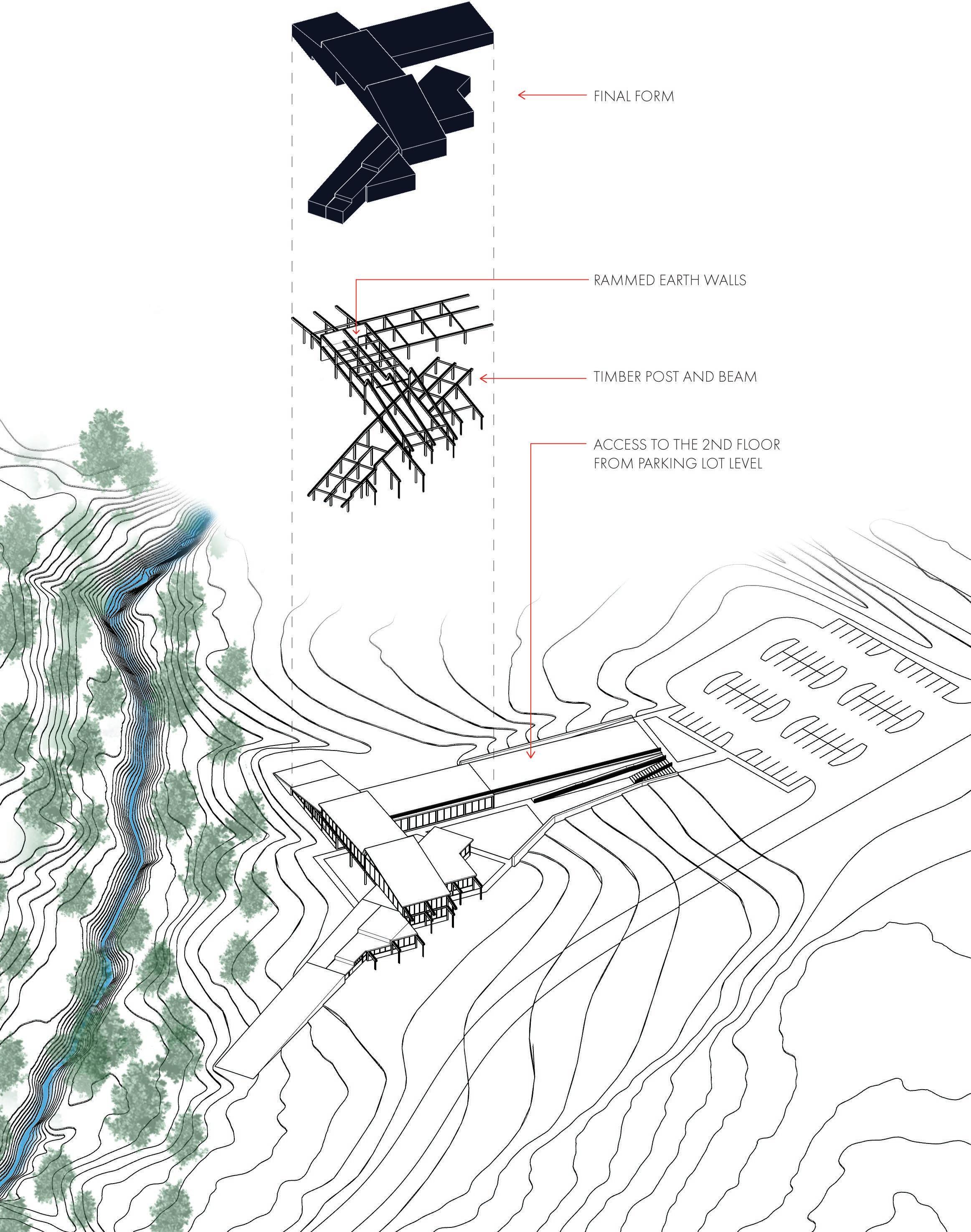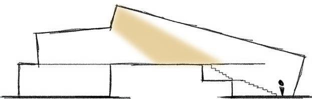 The building attempts to keep a close connection to the site by having roofs gently sloping down to meet the ground at different