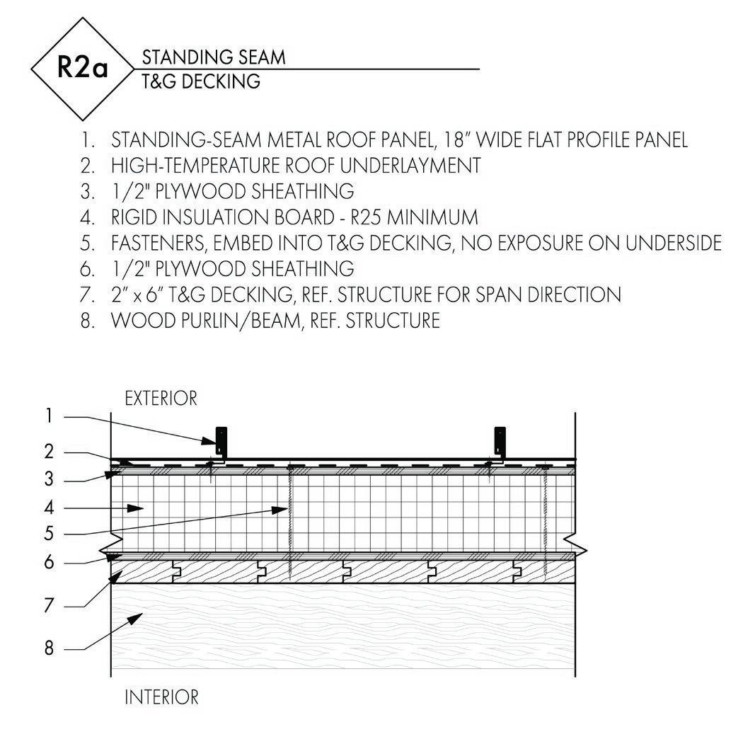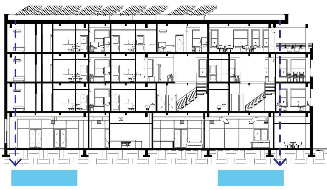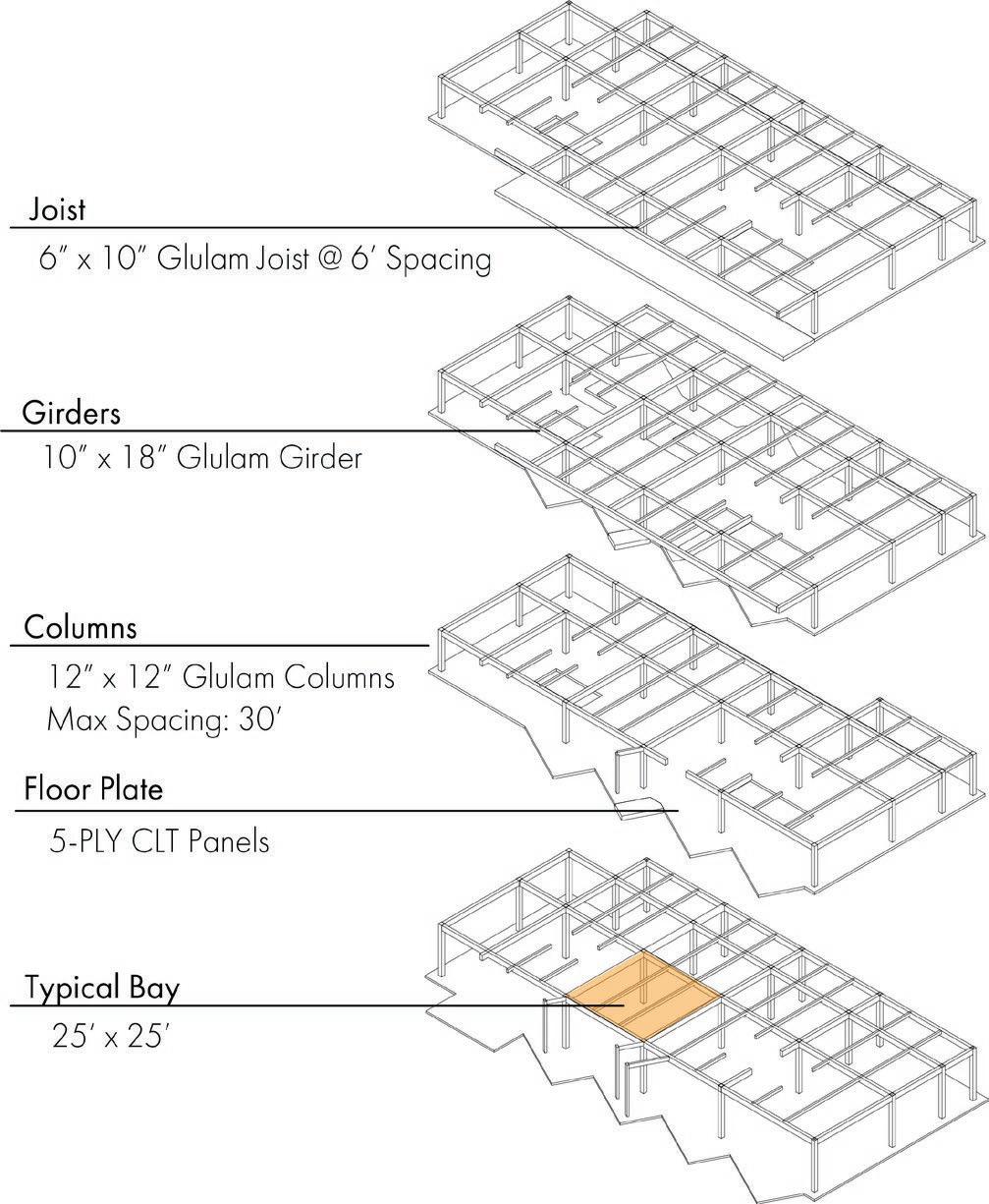 13 Level 1 1' - 0 Level 2 16' - 0 Level 3 28' - 0 Level 4 40' - 0 Fo nda n -1 - 6 2 2" G AM OLUMN 0 G AM DRoof 53' - 0 OVER OW R N 3 PE O WATE STO AG6" 12" G AM SECON A Y CO MN 14" U AM S CONDA D A Wall Assembly |R-Value: 22| int ext 5/8” Gypsum Board 6” Metal Studs w/ Batt Insulation 5/8” Plywood Sheating Vapor Barrier 1/2” Rigid Insulation 1/2” Air Space 5/8” Brick Wall Assembly |R-Value: 26| int ext 5/8” Gypsum Board 6” Metal Studs w/ Batt Insulation 5/8” Plywood Sheating Vapor Barrier 2 5/8” Rigid Insulation 2 3/8” Air Space 1 1/4” Glassfibre Reinforced Concrete Panels (1’x6’ ea) Ext Floor |R-Value: 22| top bottom 1/2” Flooring 3/4” Rigid Insulation 5-PLY CLT Floor Panel Vapor Barrier 3/8” EIFS Insulation 1/2” Finish Balcony Floor |R-Value: 22| ext int 1/2”Decking 6” Air Space w/ Drain Vapor Barrier 5/8“ Sloped EIFS Insulation 5-PLY CLT Floor Panel Int 2-HR Wall Assembly | int ext 5/8” Gypsum Board (2) 4” Metal Studs 5/8” Gypsum Board (2) Roof Assembly |R-Value: 22| ext int 3/4” EPDM Roof Membrane 12 1/2” Rigid Insulation Vapor Barrier 5-PLY CLT Roof Panel Int Floor |R-Value: 10| top bottom 1/2” Flooring 3/4” Rigid Insulation 5-PLY CLT Floor Panel Vapor Barrier Stormwater flow Wall Section Northeast