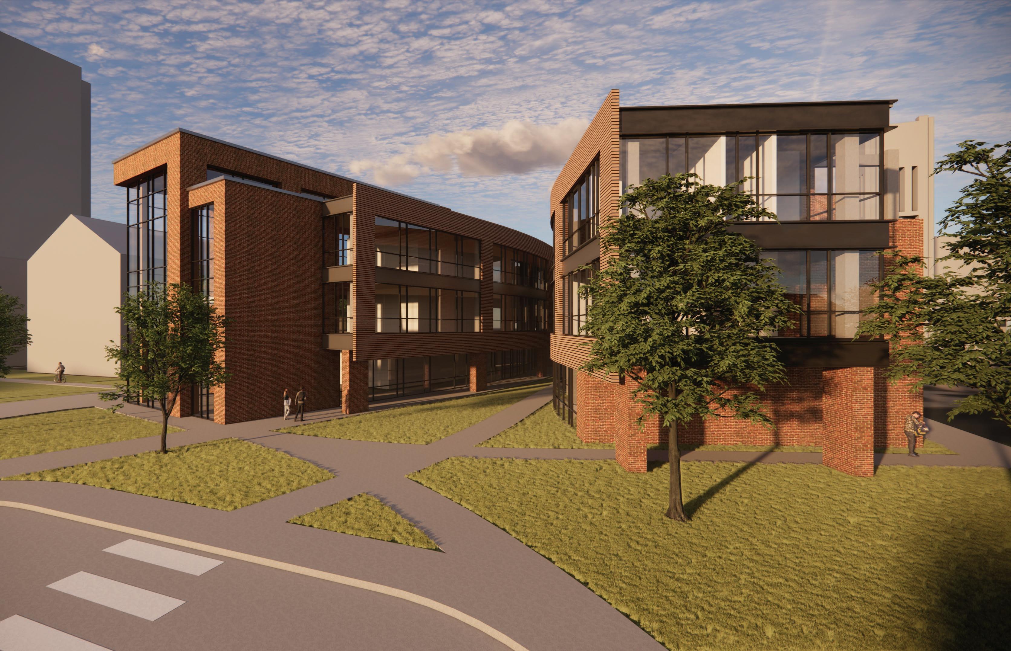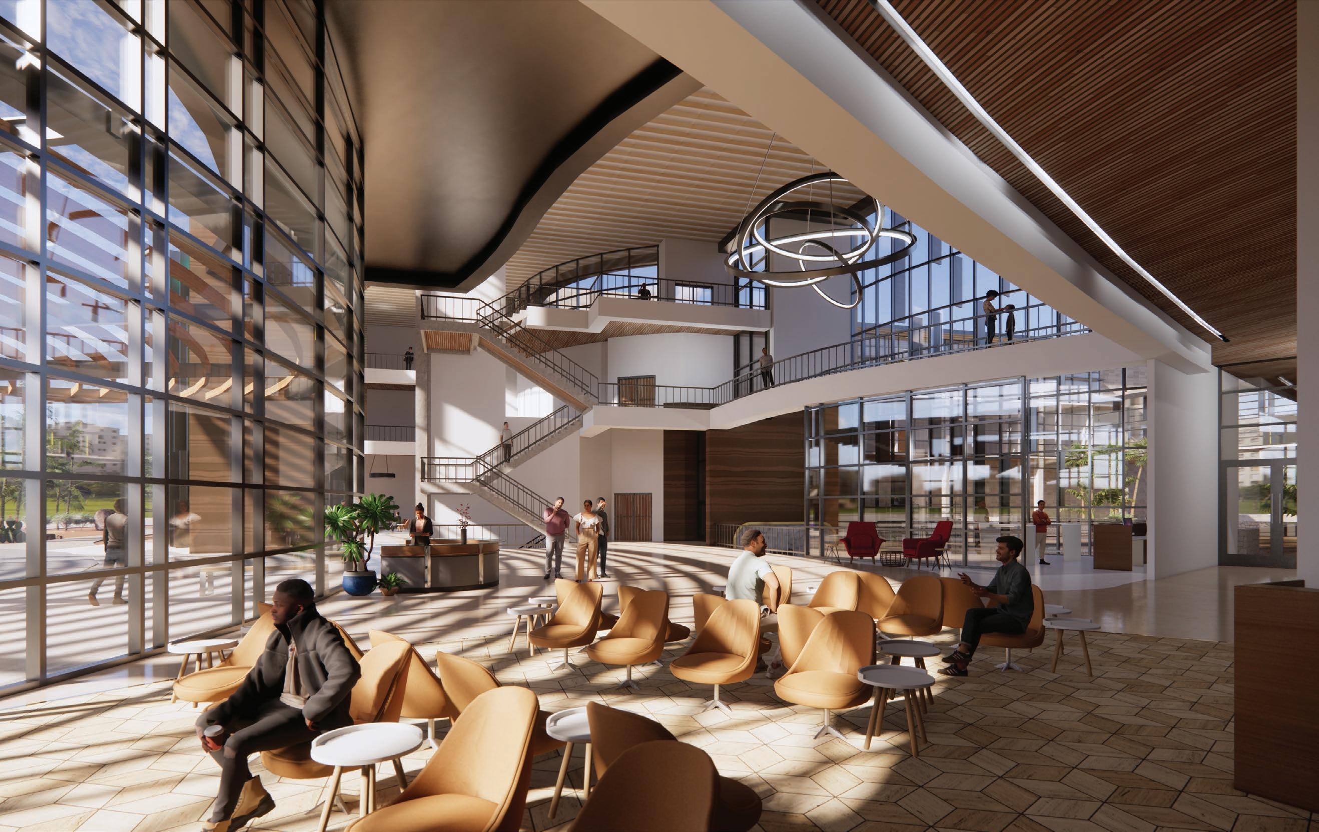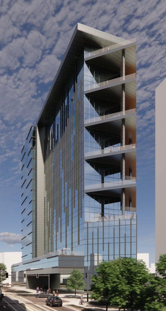 Inspired by the city’s grid system rotating 25 degrees at this location, the building is composed of two Intersecting masses. The combination of these two angles creates a series of balconies on the west that step back to allow for shading on the lower floors. The building used beige brick to relate back to the surrounding government buildings and glass-fiber reinforced concrete panels because of their durability, ease of installation, and sustainability.
