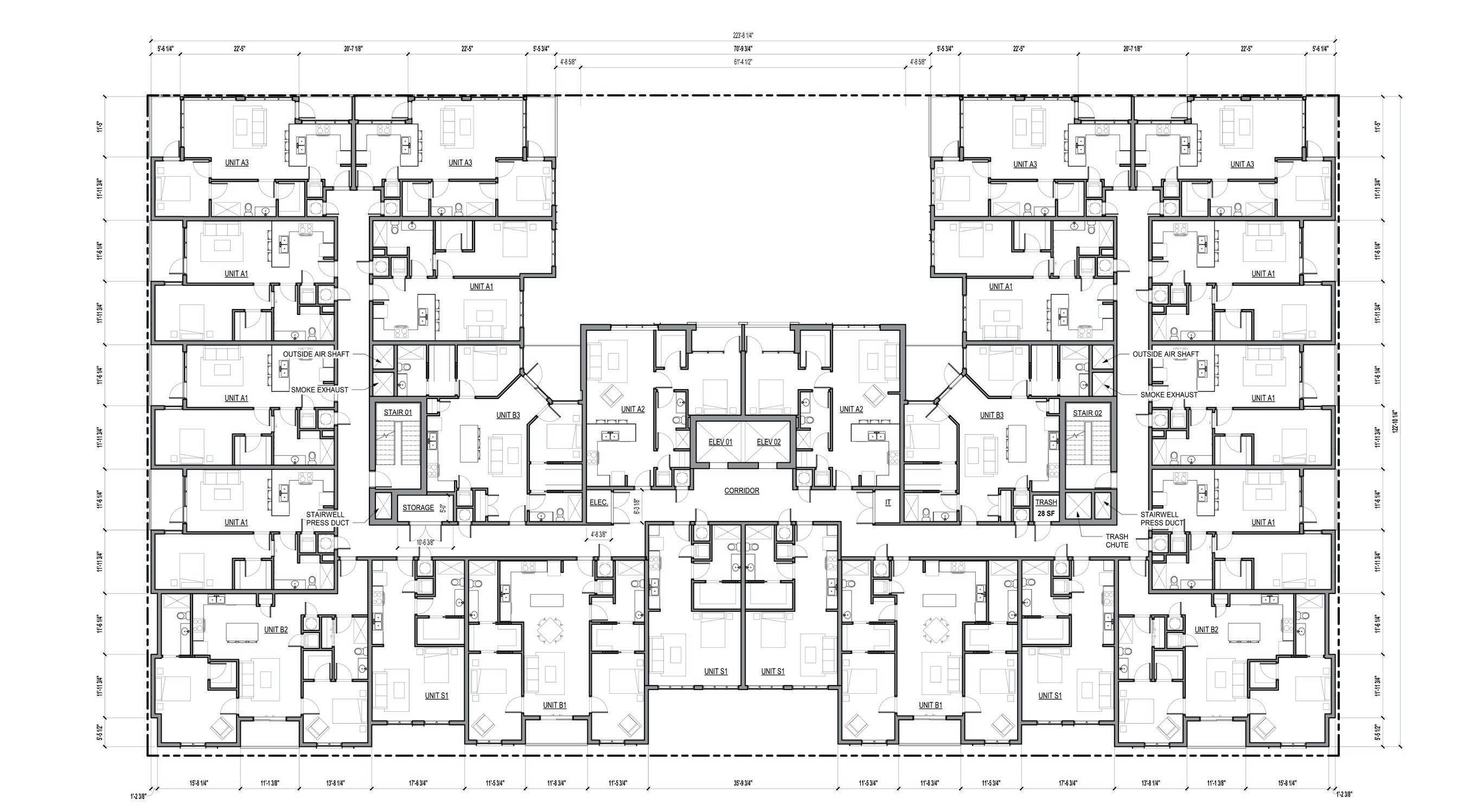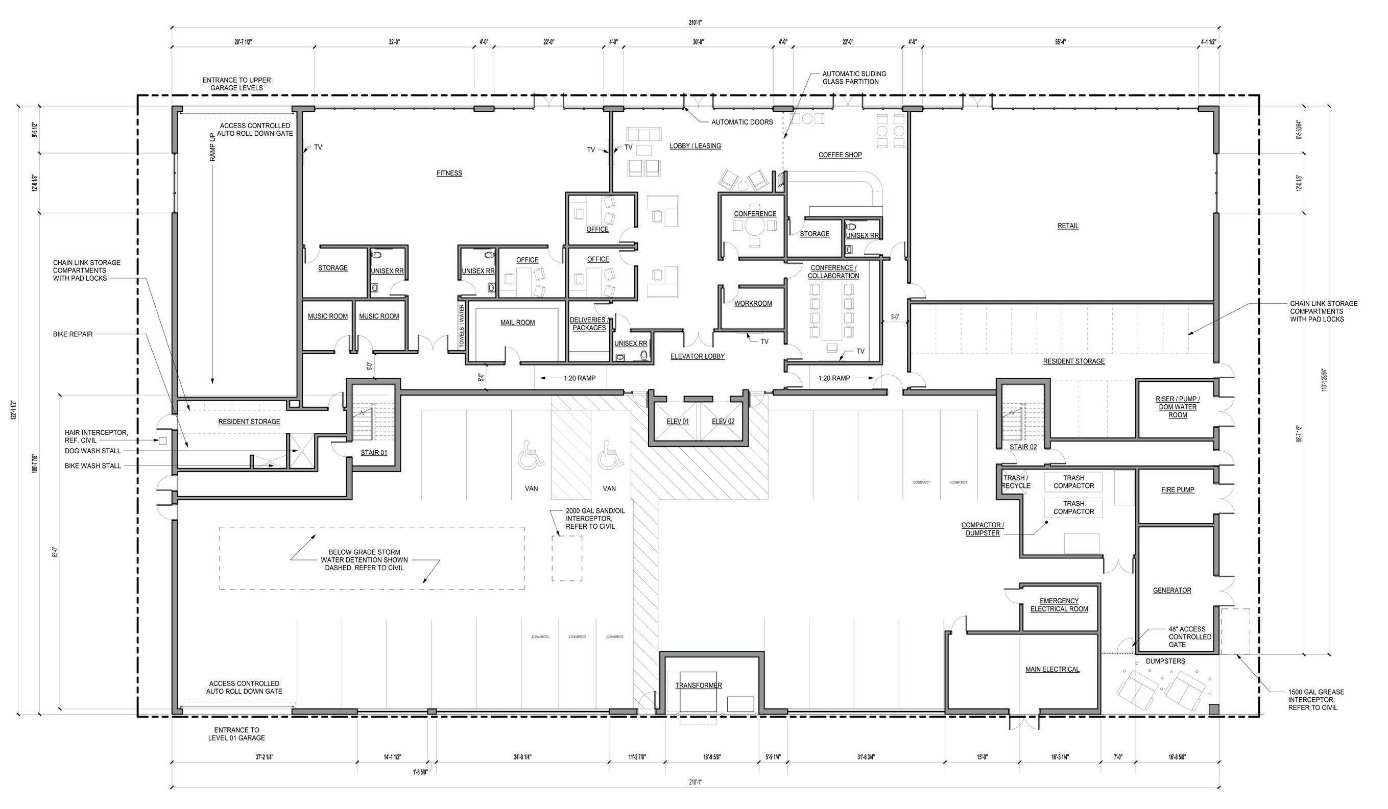 - Composed concept submittals for city approval for a 116-unit multi-family building.