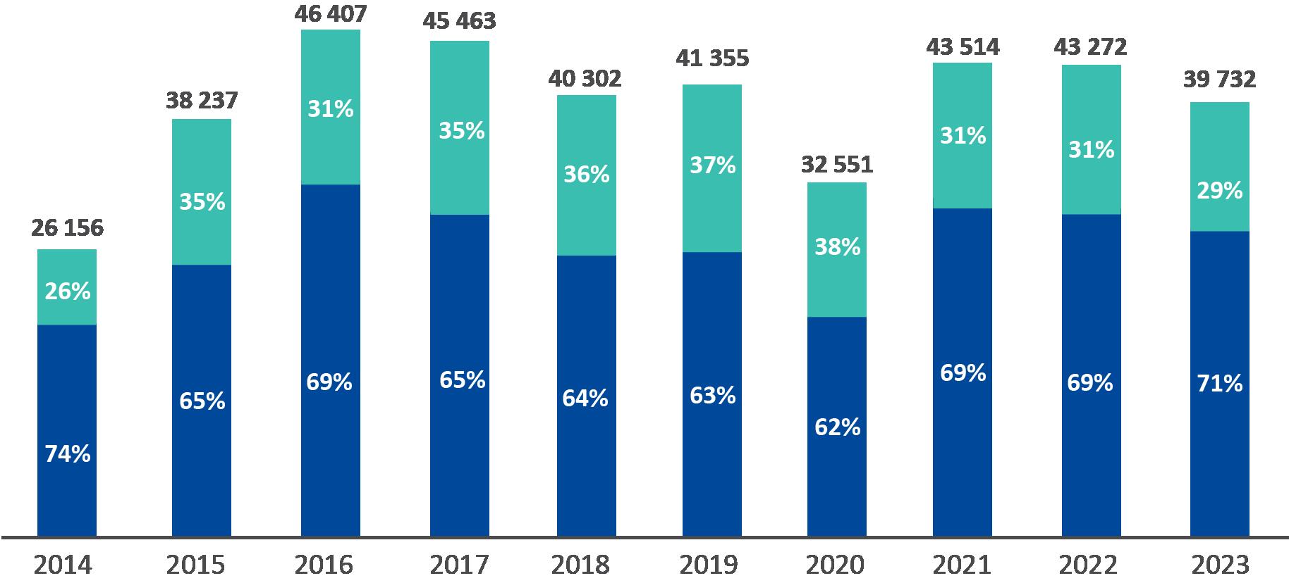 • Entre los años 2014 y 2023, la cantidad de personal en el Sector Público a nivel de Gobierno Nacional y Gobiernos Regionales, incluyendo al personal activo y las modalidades formativas, se incrementó en 310 968, equivalente a un 30.8%, alcanzando un total de 1 320 507 en el año 2023.