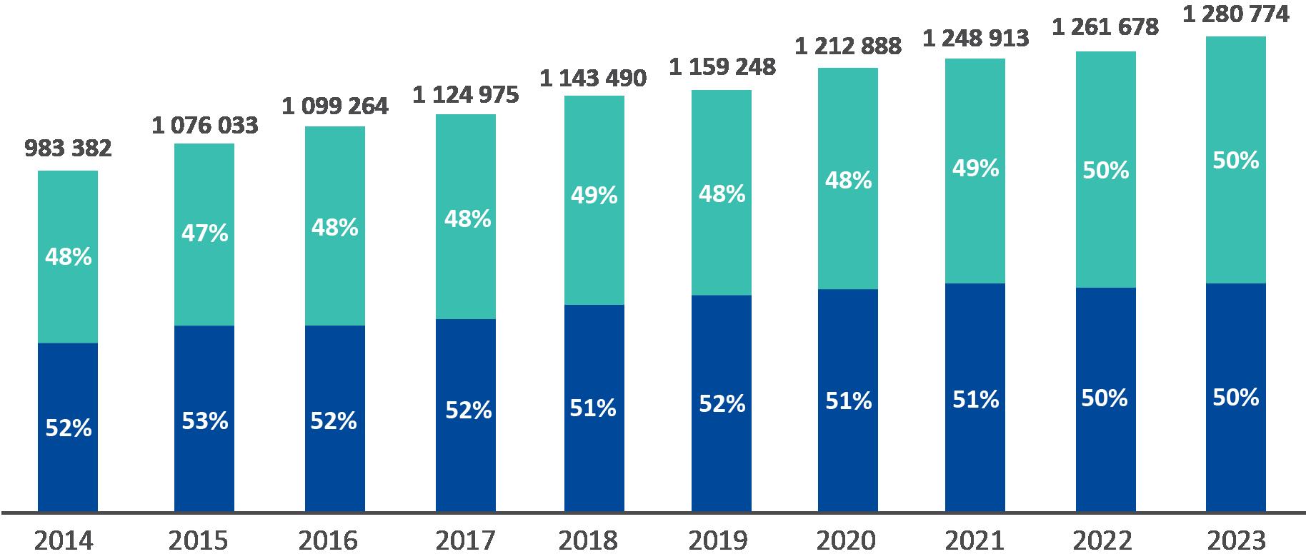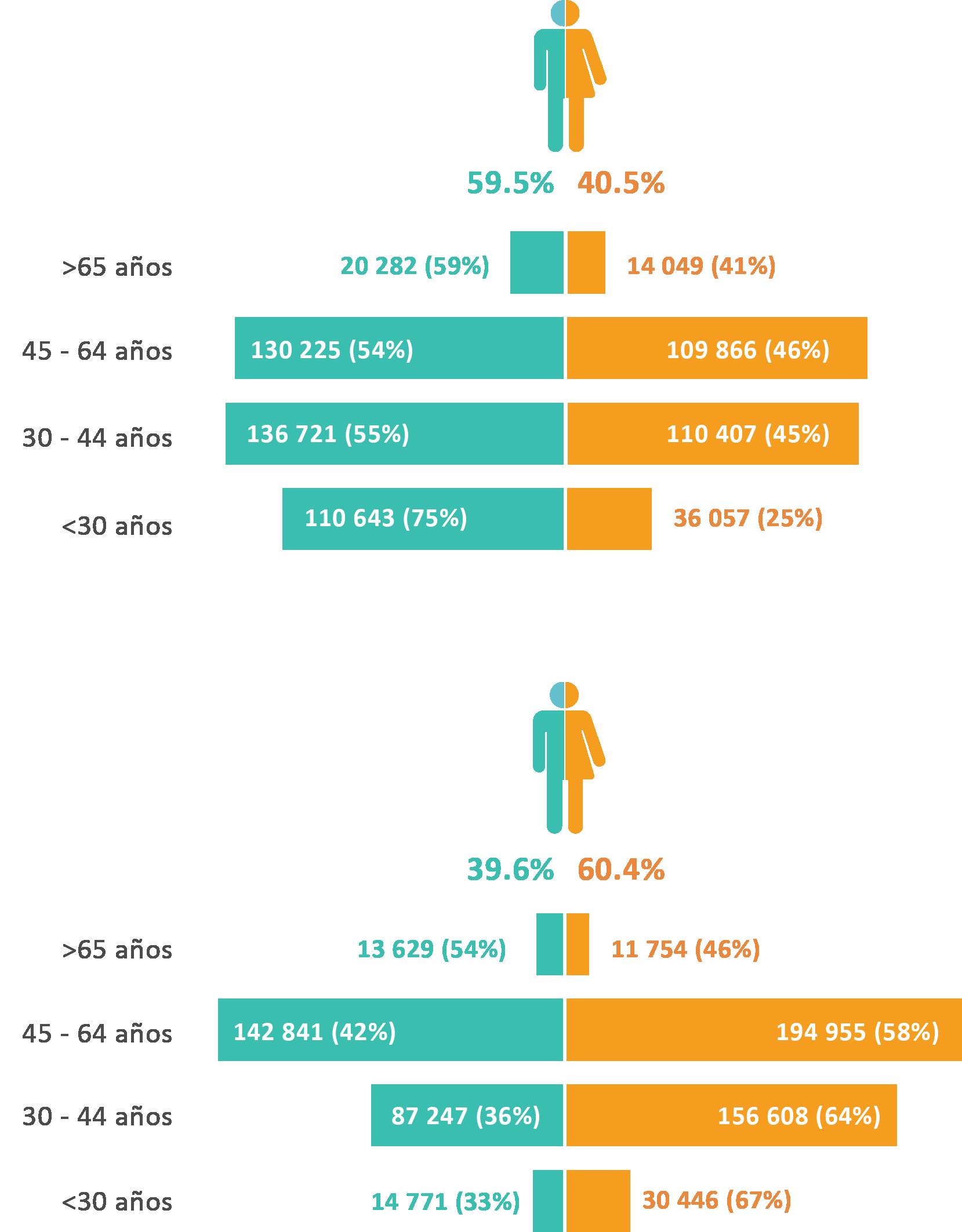 A diciembre de año 2023, en las entidades del Gobierno Nacional y Gobiernos Regionales, de un total de 1 320 507 personal Sector Público, el 50.3% (664 143) corresponden al sexo femenino, y principalmente desempeñaban sus funciones en el Sector Educación, específicamente en roles relacionados a carreras especiales del grupo ocupacional de profesores de la reforma magisterial y profesores contratados.