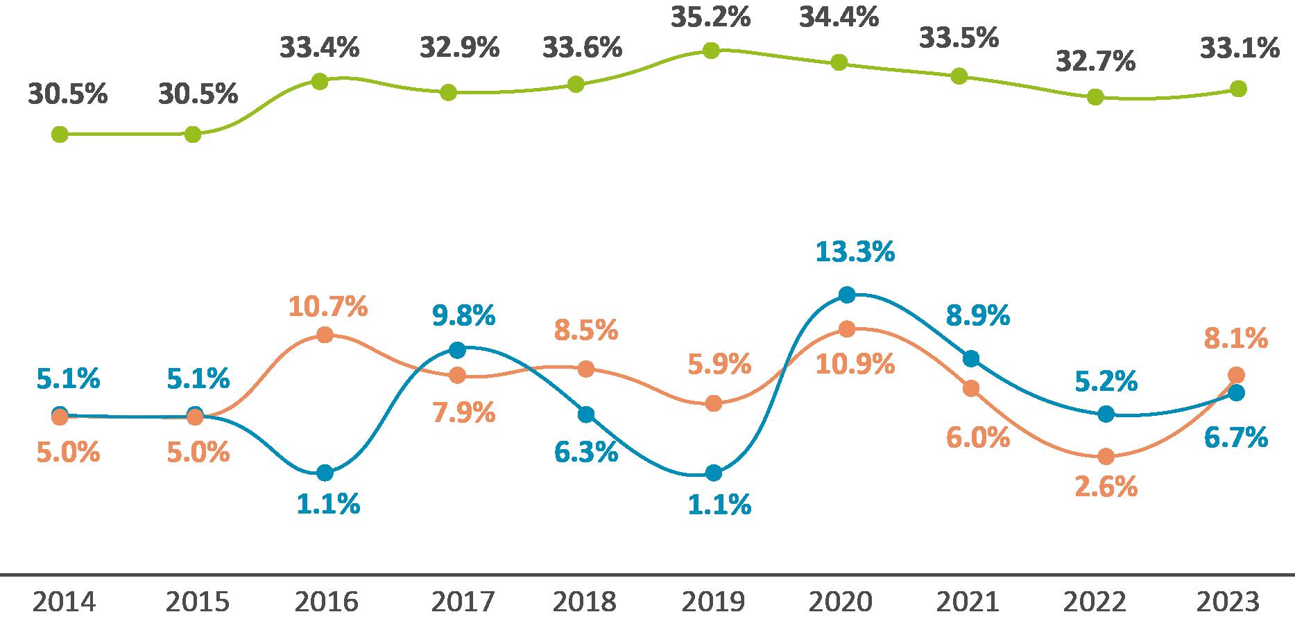 De igual modo, entre el periodo 2014 y 2023, la tasa de variación del gasto en ingresos de personal ha sido fluctuante cada año; sin embargo, tuvo un incremento promedio de 7.1%, teniendo una relación directa con la tasa de variación del gasto público total, que tuvo un incremento promedio de 6.3%.