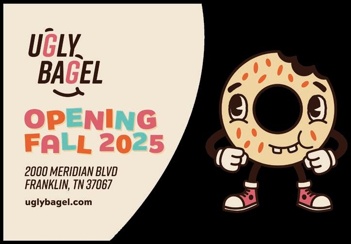 Meridian Cool Springs, the 60-acre mixed-use district that combines Class A office space with hotels, dining, and retail, provides a fitting backdrop for the brand’s next step. The shop features a special tile mosaic at the entrance reading “Spread Joy,” a message that captures Ugly Bagel’s ethos before customers even walk through the door. Inside, expect the same hand-rolled bagels, customizable cream cheese combinations, and specialty sandwiches that have fueled long lines at the downtown location. Ugly Bagel’s privatelabel coffee program, with blends like “Uggy’s Blend” and “El Jefe Brew,” will also return, with the team emphasizing catering and mobile to-go orders to serve corporate groups, busy families, and community events across the neighborhood.