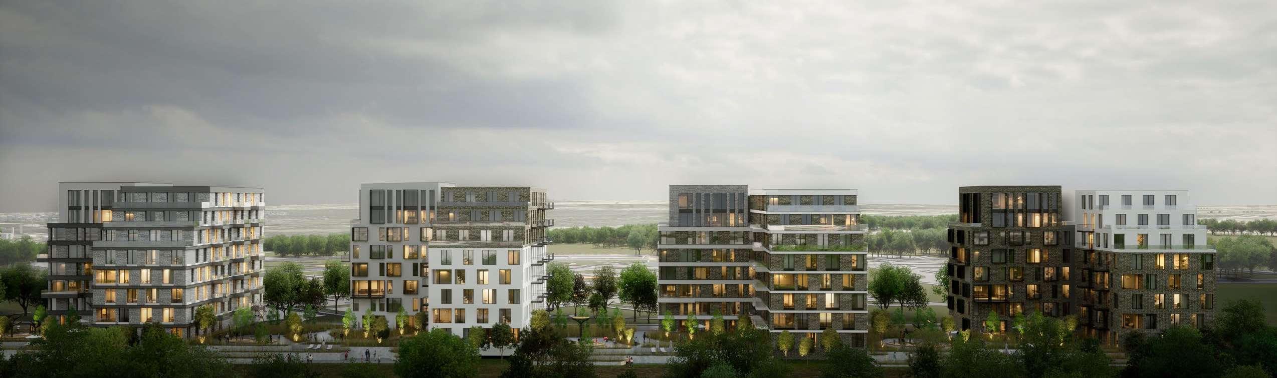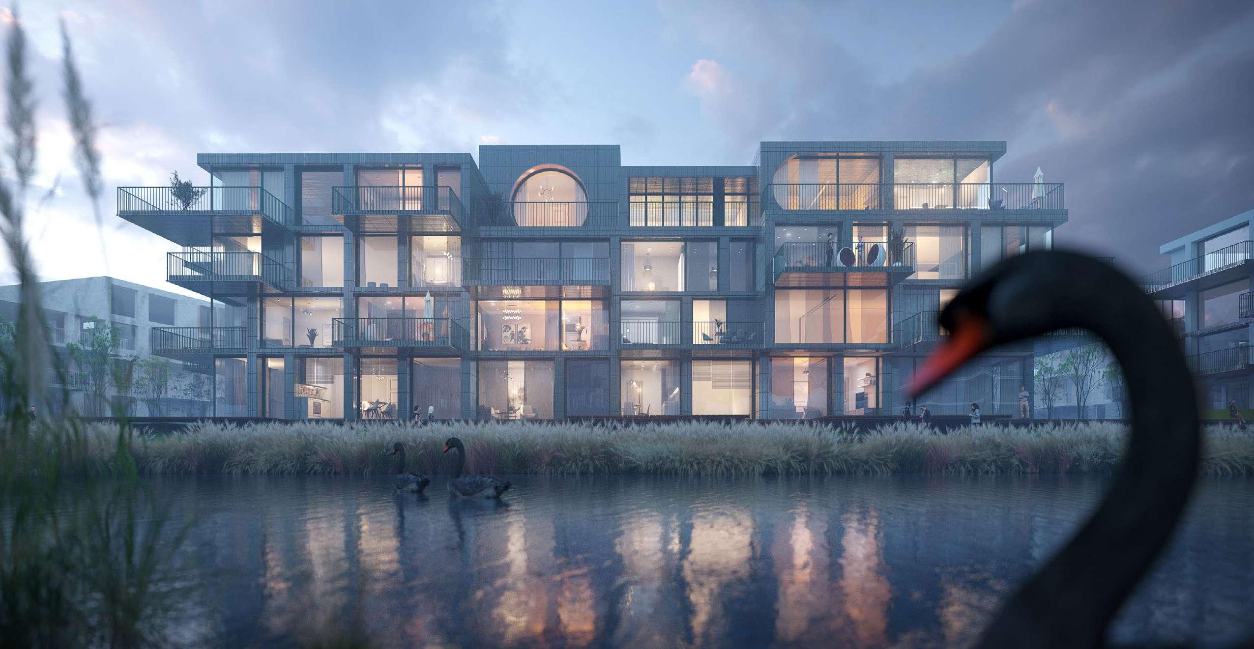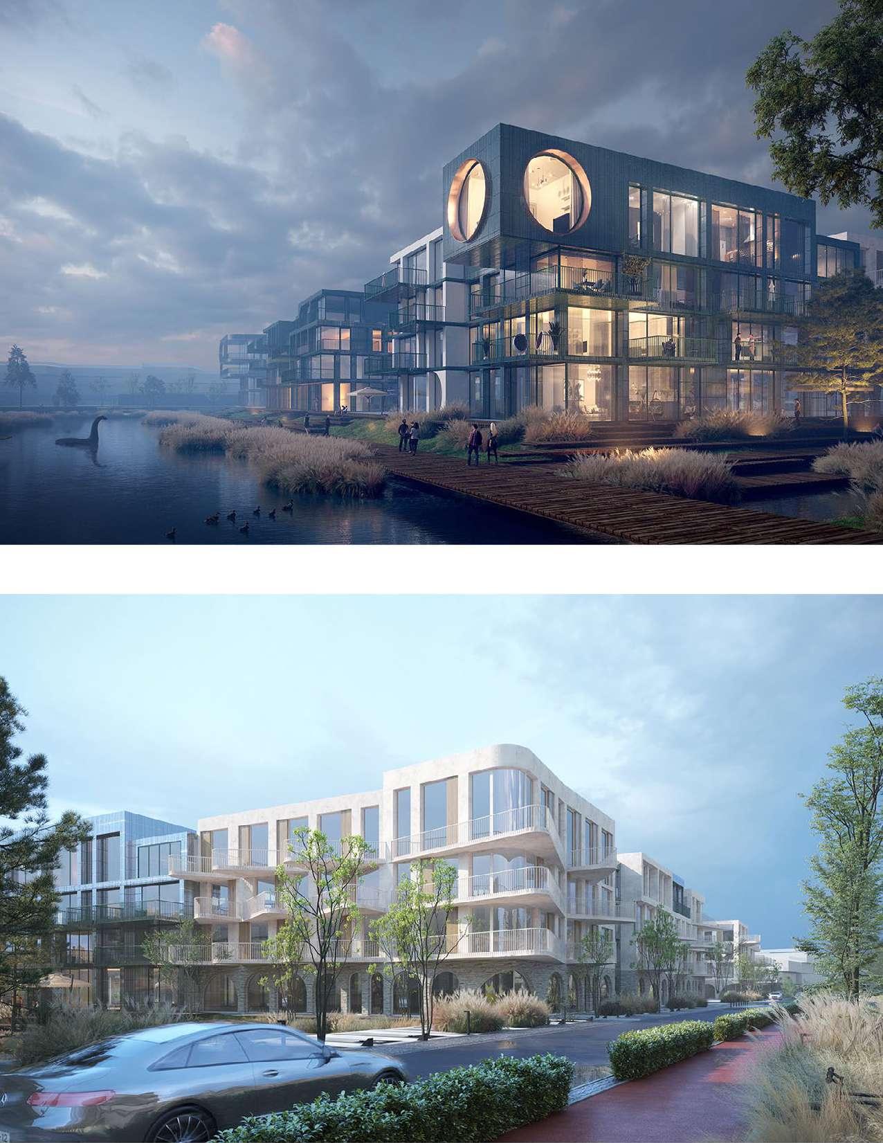 The development of the site was designed with increased attention to the quality of the pedestrian space. First, we expand the existing channels, especially the main one. With the help of eco-ponds, we form peninsulas at the left part of the master plan with the possibility of driving in from the road that separates the school from another building. The right two islands are a less private neighborhood development with the option of walking along the waterfront along the buildings.