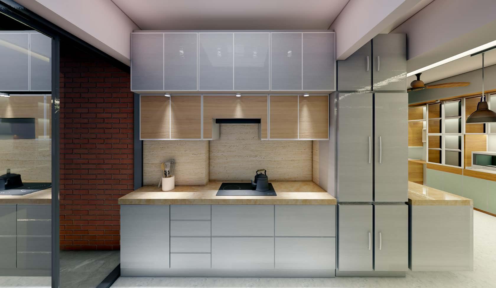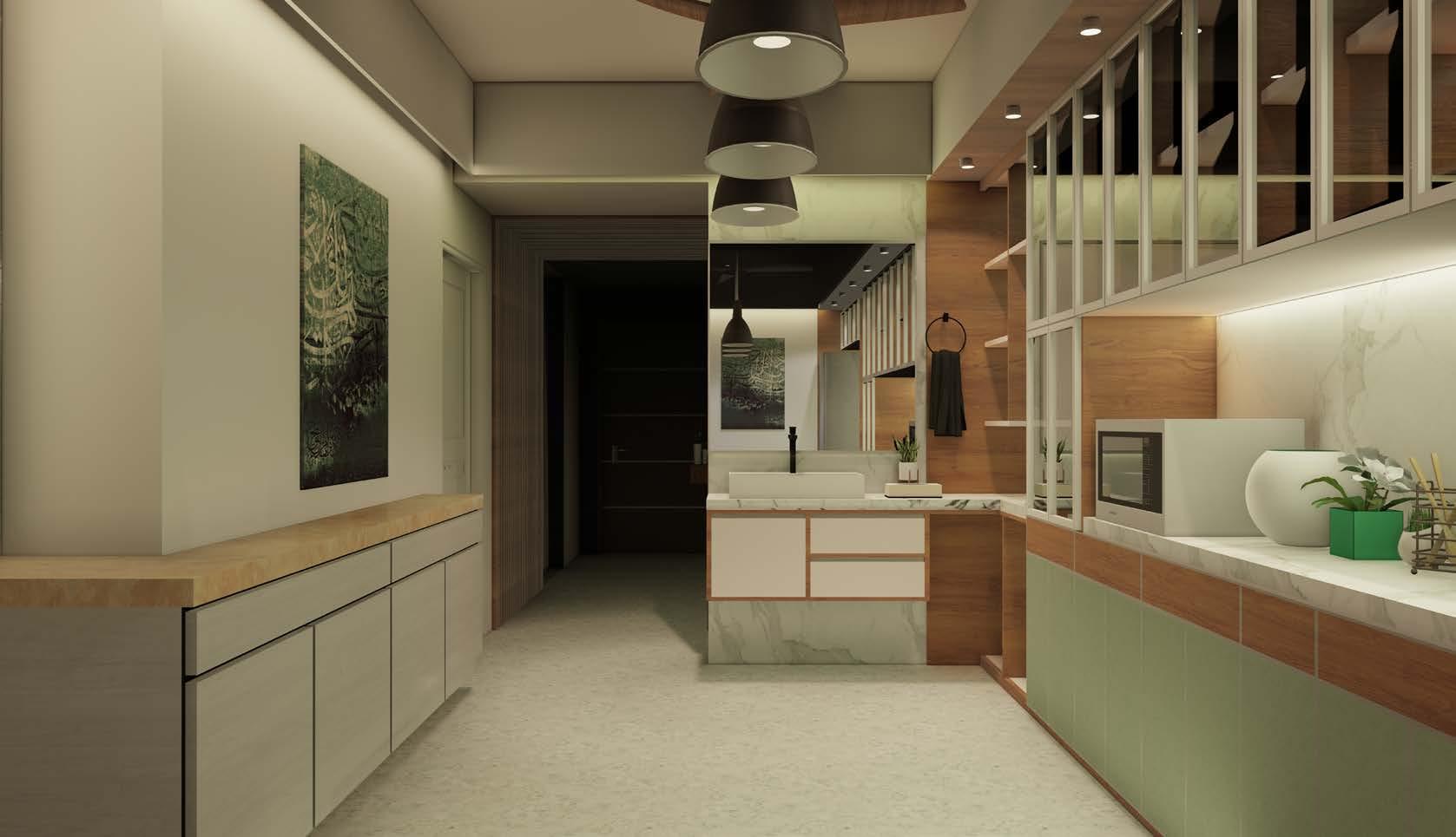 Application of ‘textured oxford blue’ colour in living room and sage green colour in dining room allowed the space to experience an ambient touch. Using water proof marine plywoods and modern accessories such as the magic corner, cutlery trays, spice racks and tall cabinet made the kitchen practical and trendy.