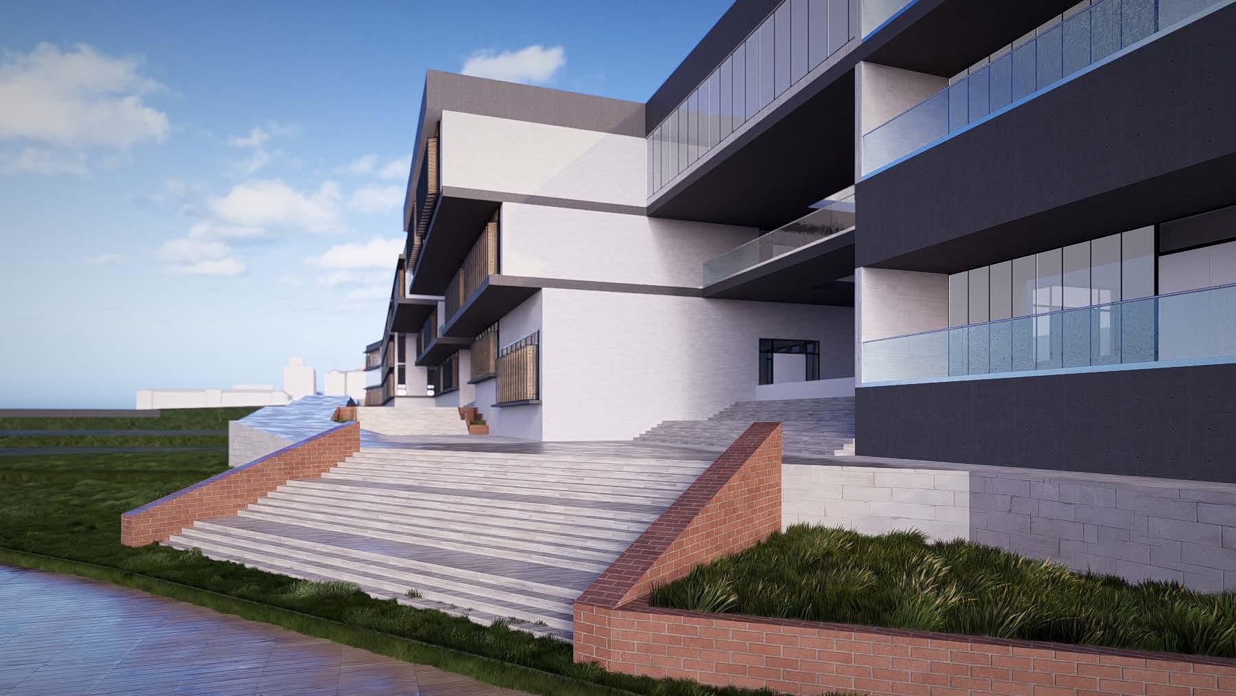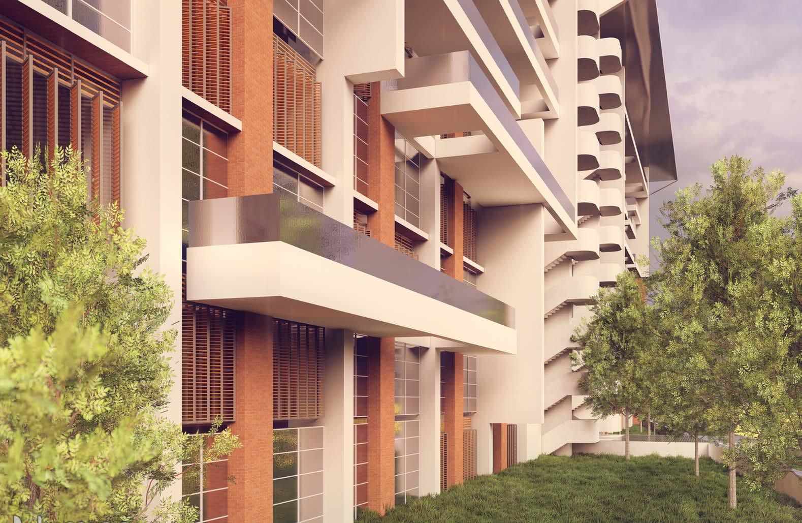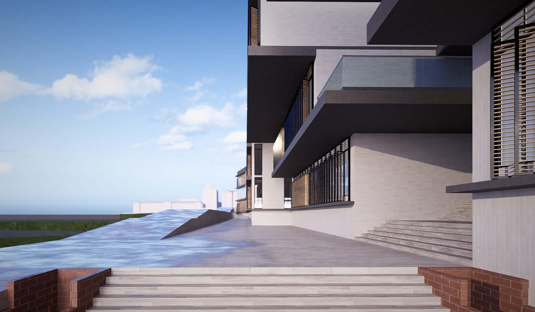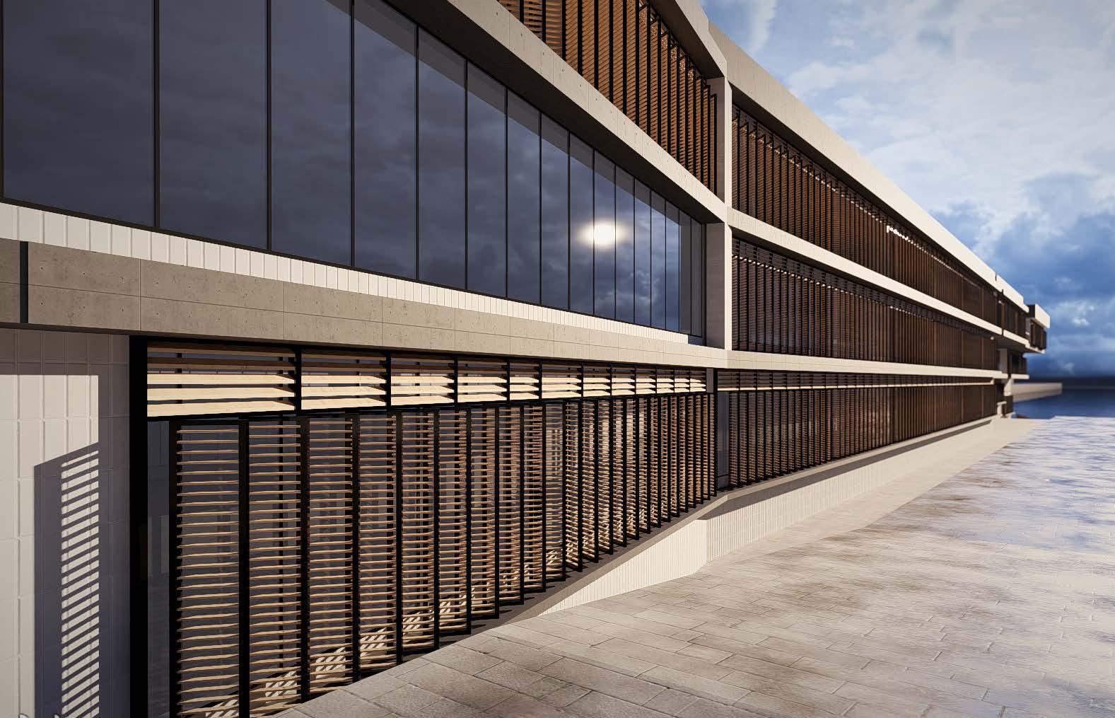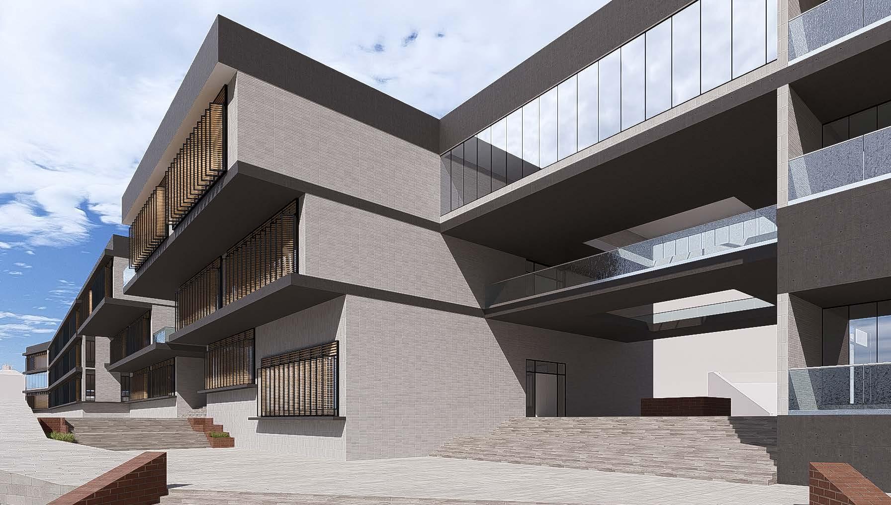 Rectangular RCC blocks were included at each front facade window as a design feature. The purpose of the design feature was to provide both protection from intense sunlight and as an aesthetic element.