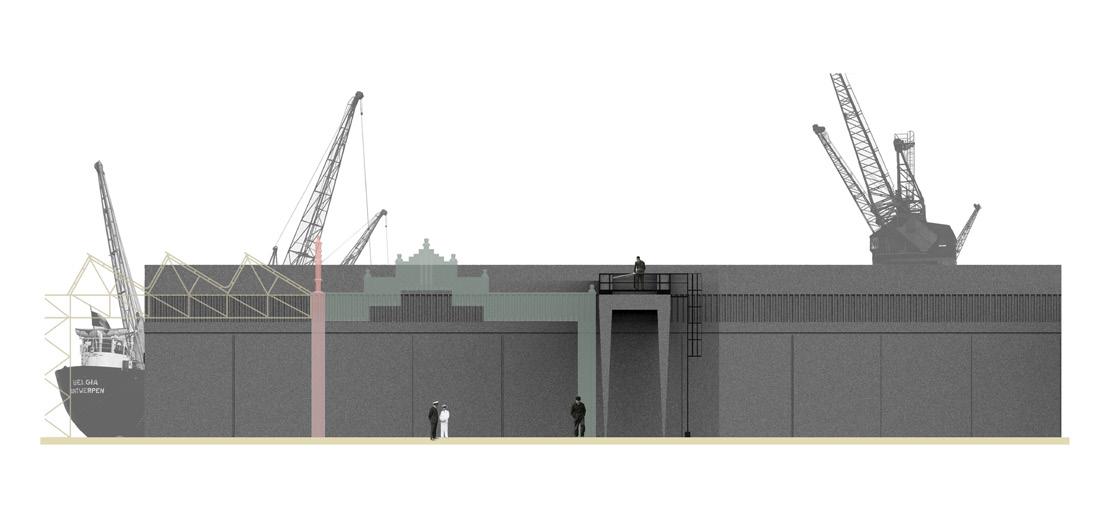 The project consists of 4 gates connected to each other on an X-shaped plan. The reference for each of these gates became a crane attached to the hall as a service element for unloading. It was chosen as a result of its geographical location. It is placed in the same spot where the power station building once stood, which was demolished after 1947. It is this period that can be considered crucial, as the building simply ceased to exist after 1947. The need to create another hall in the 1960s and 1970s was, unfortunately, greater than the preservation of a historic piece of architecture. All that remains of the building is archive evidence and its geographical location.
