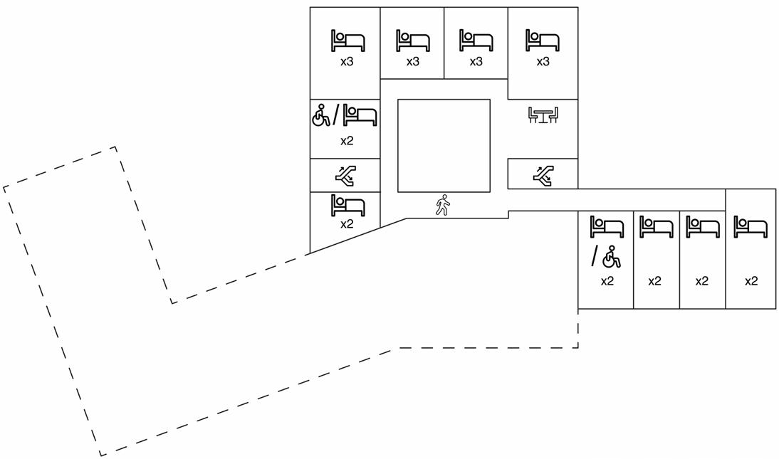 The first floor of the building was divided into zones such as the entrance zone, classroom zone, technical rooms zone, atrium as a green centre of the building providing natural lighting, administration zone and exhibition zone. On the right side of the first floor, we can find the catering zone, which includes a restaurant and kitchen facilities. The second floor has a completely different function and it contains the accommodation zone, which can accommodate up to 25 people at a time. In addition to the hotel zone, the floor also consists of many common spaces facing the atrium. The idea of separating the daily use areas such as the restaurant, the exhibition area and above all the art therapy spaces from the hotel area is to create a natural zone of calm, undisturbed by visitors, a space in which patients feel comfortable even after classes. The space has been designed to be accessible also to people with disabilities, taking into account as many dysfunctions as possible that the user may have. The hotel zone not only has living rooms but also common areas facing the green atrium to bring users together.