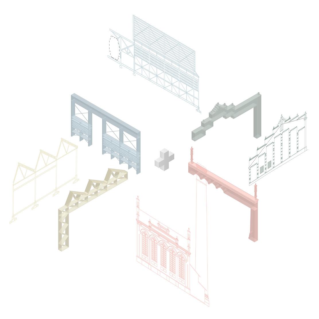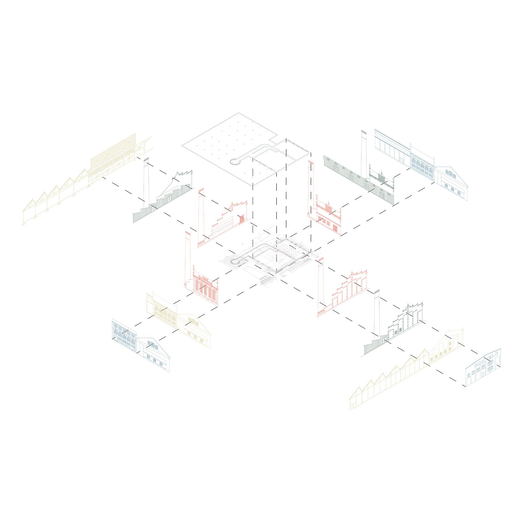 The final product was based on archive drawings overlaid on top of each other. On the foundation of these, a selection was undertaken to filter materials, elements, details or types of construction that seemed to be crucial to the transformation and the story of change.