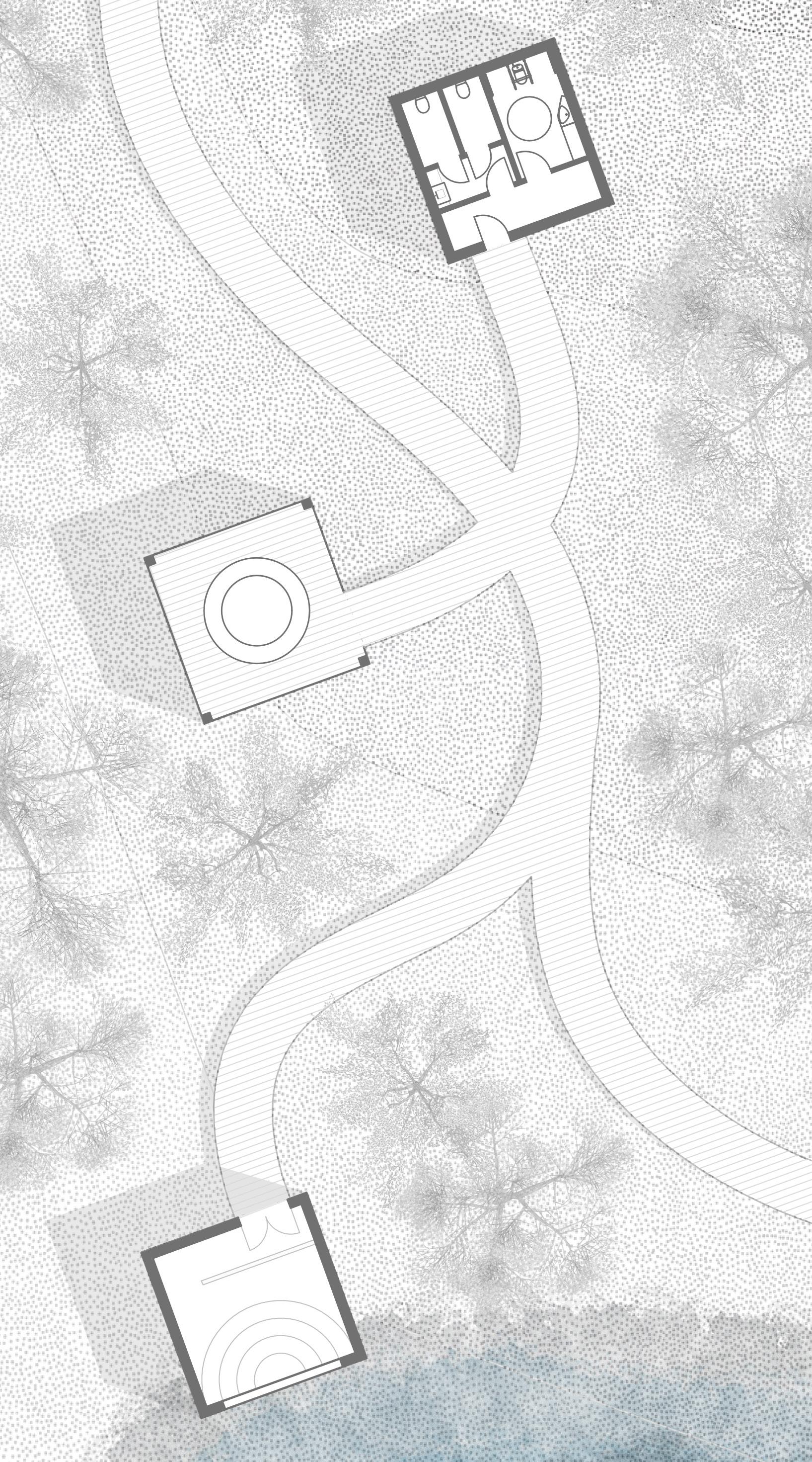 From the beginning, our greatest challenge was to design a form so simple that it would not draw away the viewer’s attention from the surrounding nature. We decided to design three 6x6 metre cubic modules of timber construction with a façade made of mirrored panels. All connected by a path suspended in the air, supported by wooden poles. Each module has a different function such as toilet, viewpoint and the water temple itself. The use of mirrored panels is suggesting that nature remains on the pedestal while architecture plays its role as the background. The interior design allows a visitor to connect with water in a calm atmosphere. This is what we think the definition of a water temple is. A form that simply does not shift the attention from what is crucial, in this case, the surrounding nature.